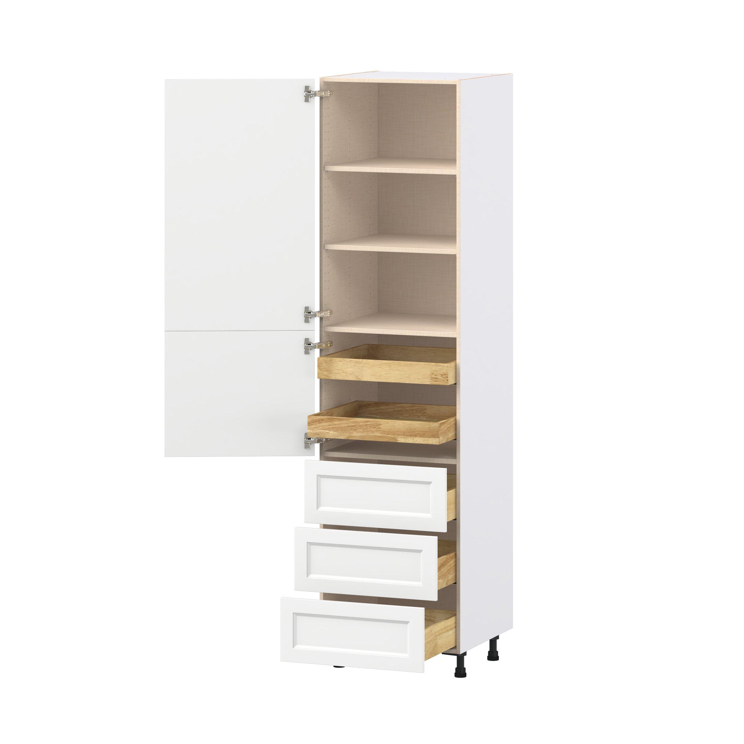 Make a statement with Peachtree premium painted shaker-inspired cabinets, offering both style and durability for years to come. Available in classic bright white and rich midnight blue, this collection is designed to fit seamlessly into both modern and transitional interiors. Crafted from one-piece MDF Studio Design Collection Peachtree 24 in. Painted Bright White Door and Drawer Pantry Cabinet with Inner Pull-Out is designed to resist hairline cracks while the easy-to-clean finish stands up to stains and moisture. Featuring 5-piece doors and dovetail drawer joints, these cabinets offer durability and elegance. This collection combines style with everyday storage solutions.
