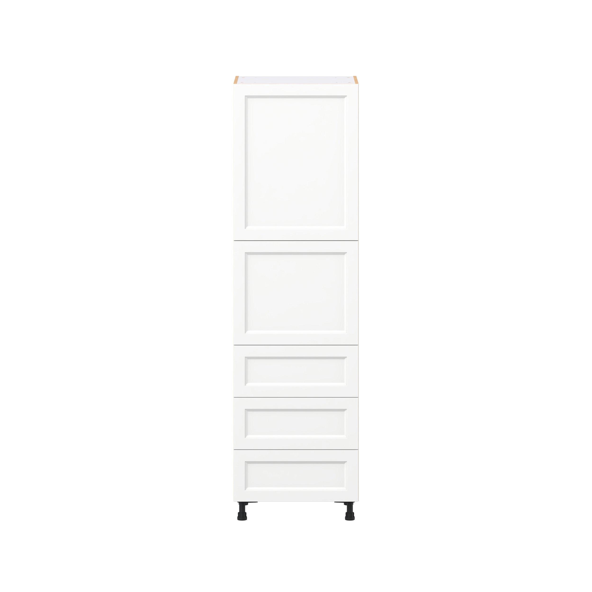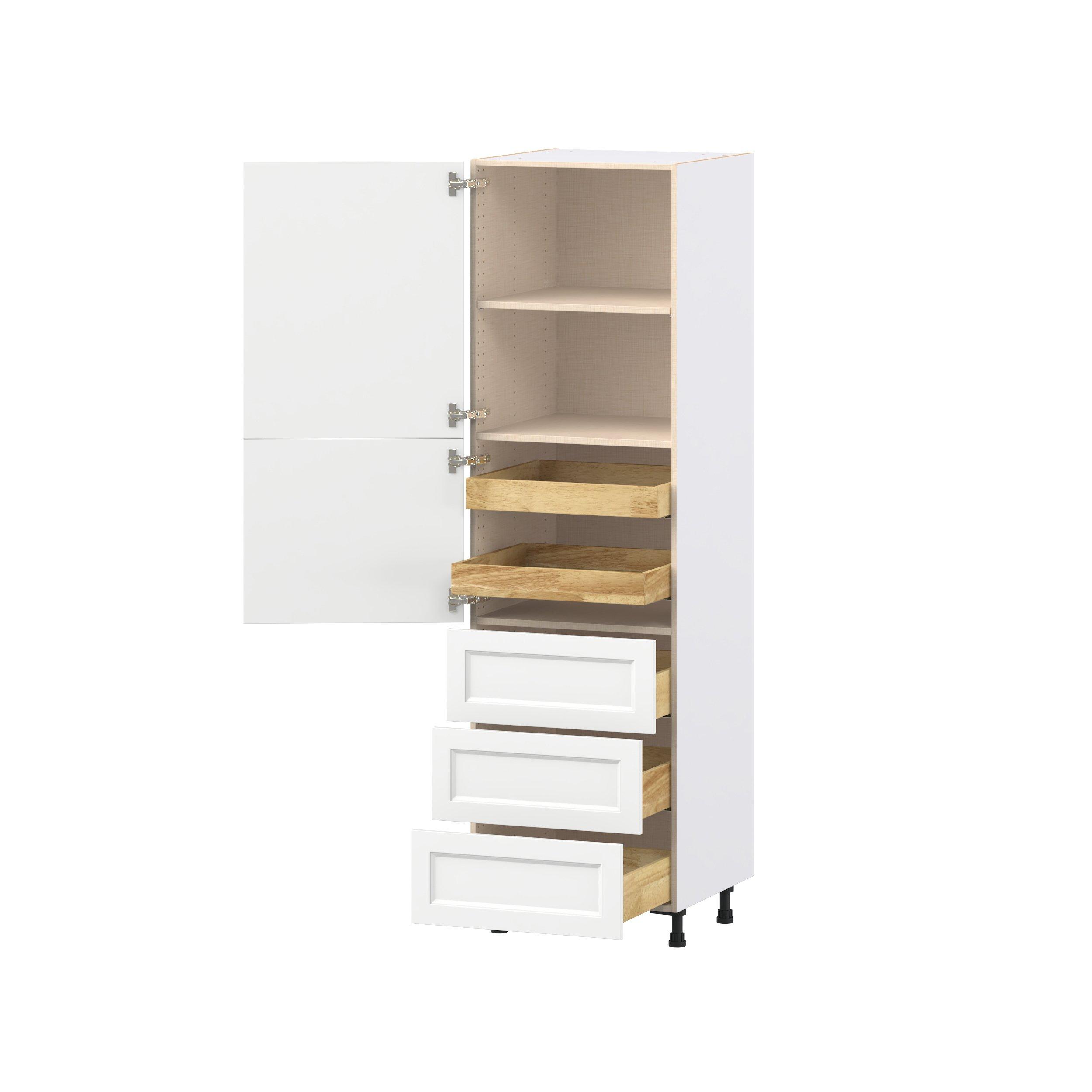 Make a statement with Peachtree premium painted shaker-inspired cabinets, offering both style and durability for years to come. Available in classic bright white and rich midnight blue, this collection is designed to fit seamlessly into both modern and transitional interiors. Crafted from one-piece MDF Studio Design Collection Peachtree 24 in. Painted Bright White Door and Drawer Pantry Cabinet with Inner Pull-Out is designed to resist hairline cracks while the easy-to-clean finish stands up to stains and moisture. Featuring 5-piece doors and dovetail drawer joints, these cabinets offer durability and elegance. This collection combines style with everyday storage solutions.