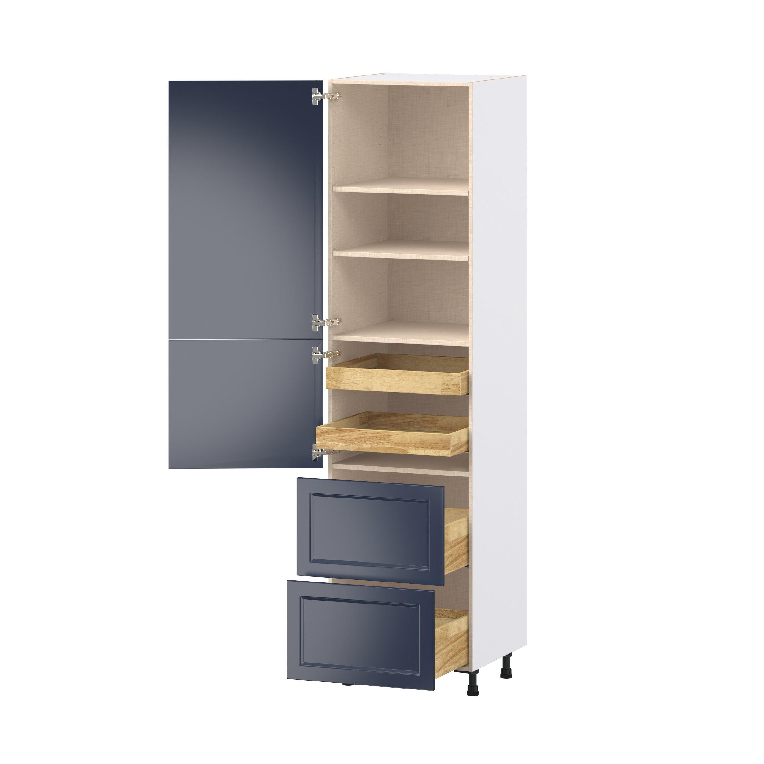 Make a statement with Peachtree premium painted shaker-inspired cabinets, offering both style and durability for years to come. Available in classic bright white and rich midnight blue, this collection is designed to fit seamlessly into both modern and transitional interiors. Crafted from one-piece MDF Studio Design Collection Peachtree 24 in. Painted Midnight Blue Door and Drawer Pantry Cabinet with Inner Pull-Out is designed to resist hairline cracks while the easy-to-clean finish stands up to stains and moisture. Featuring 5-piece doors and dovetail drawer joints, these cabinets offer durability and elegance. This collection combines style with everyday storage solutions.