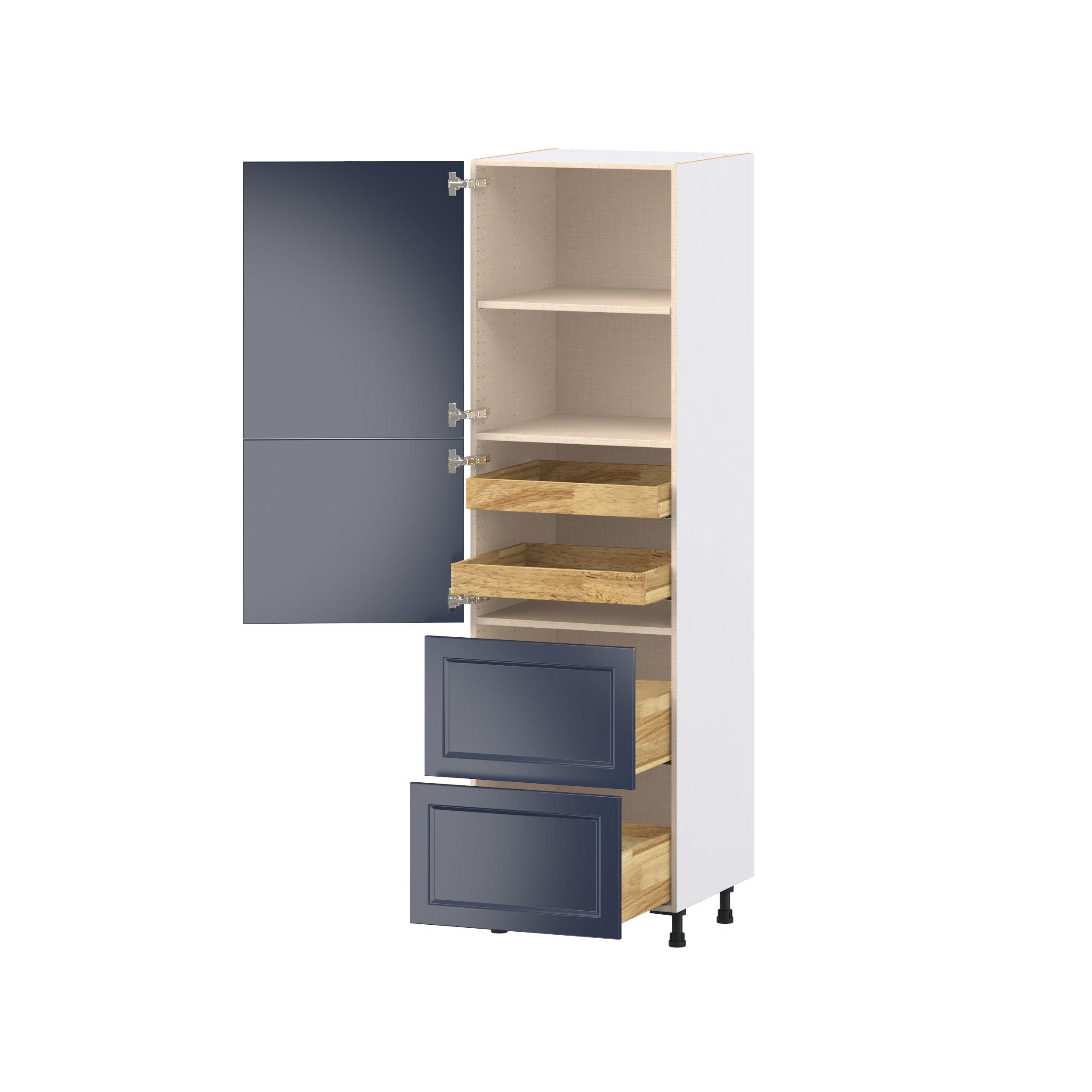 Make a statement with Peachtree premium painted shaker-inspired cabinets, offering both style and durability for years to come. Available in classic bright white and rich midnight blue, this collection is designed to fit seamlessly into both modern and transitional interiors. Crafted from one-piece MDF Studio Design Collection Peachtree 24 in. Painted Midnight Blue Door and Drawer Pantry Cabinet with Inner Pull-Out is designed to resist hairline cracks while the easy-to-clean finish stands up to stains and moisture. Featuring 5-piece doors and dovetail drawer joints, these cabinets offer durability and elegance. This collection combines style with everyday storage solutions.