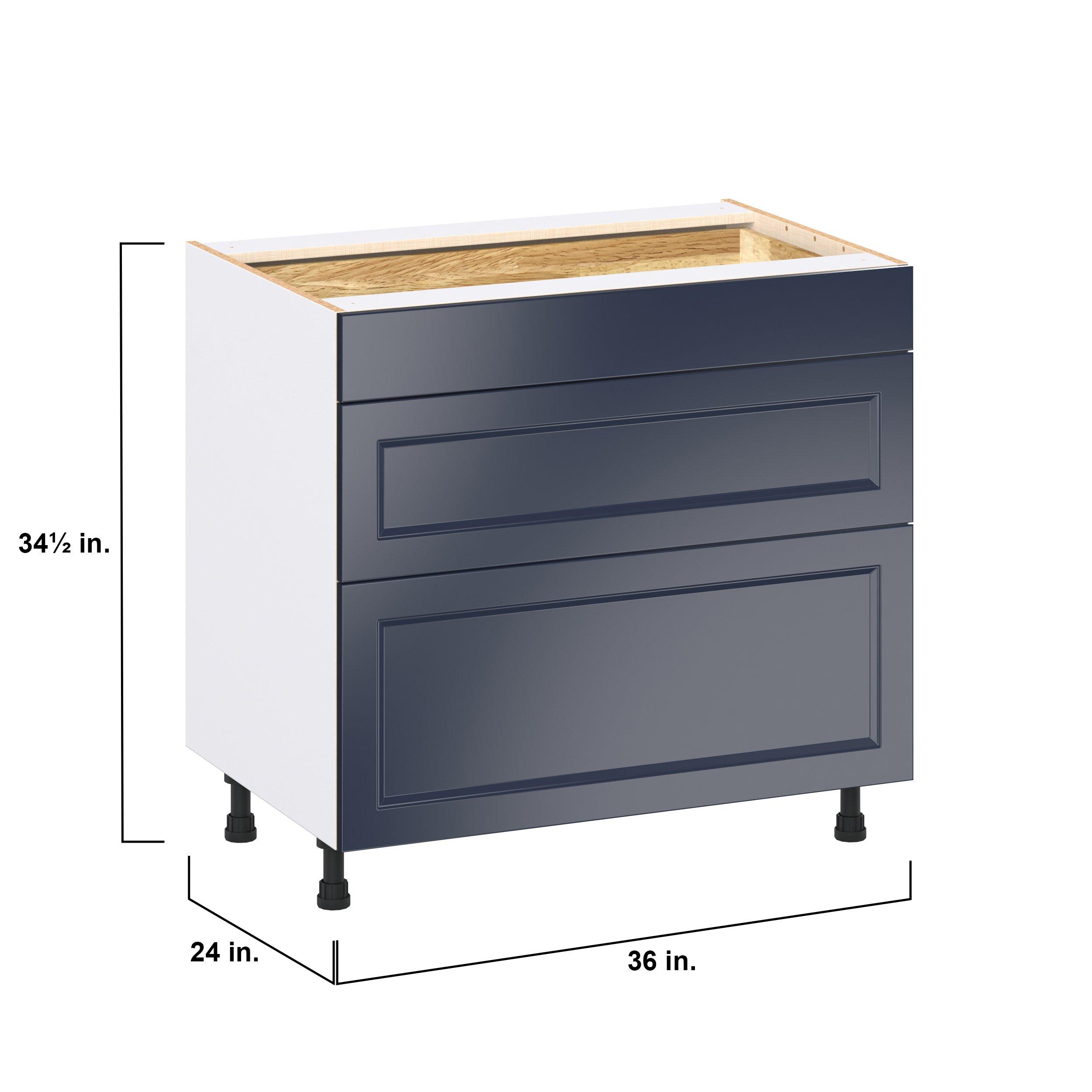 Make a statement with Peachtree premium painted shaker-inspired cabinets, offering both style and durability for years to come. Available in classic bright white and rich midnight blue, this collection is designed to fit seamlessly into both modern and transitional interiors. Crafted from one-piece MDF Studio Design Collection Peachtree 36 in. Painted Midnight Blue Drawer Base Cabinet is designed to resist hairline cracks while the easy-to-clean finish stands up to stains and moisture. Featuring 5-piece doors and dovetail drawer joints, these cabinets offer durability and elegance. This collection combines style with everyday storage solutions.