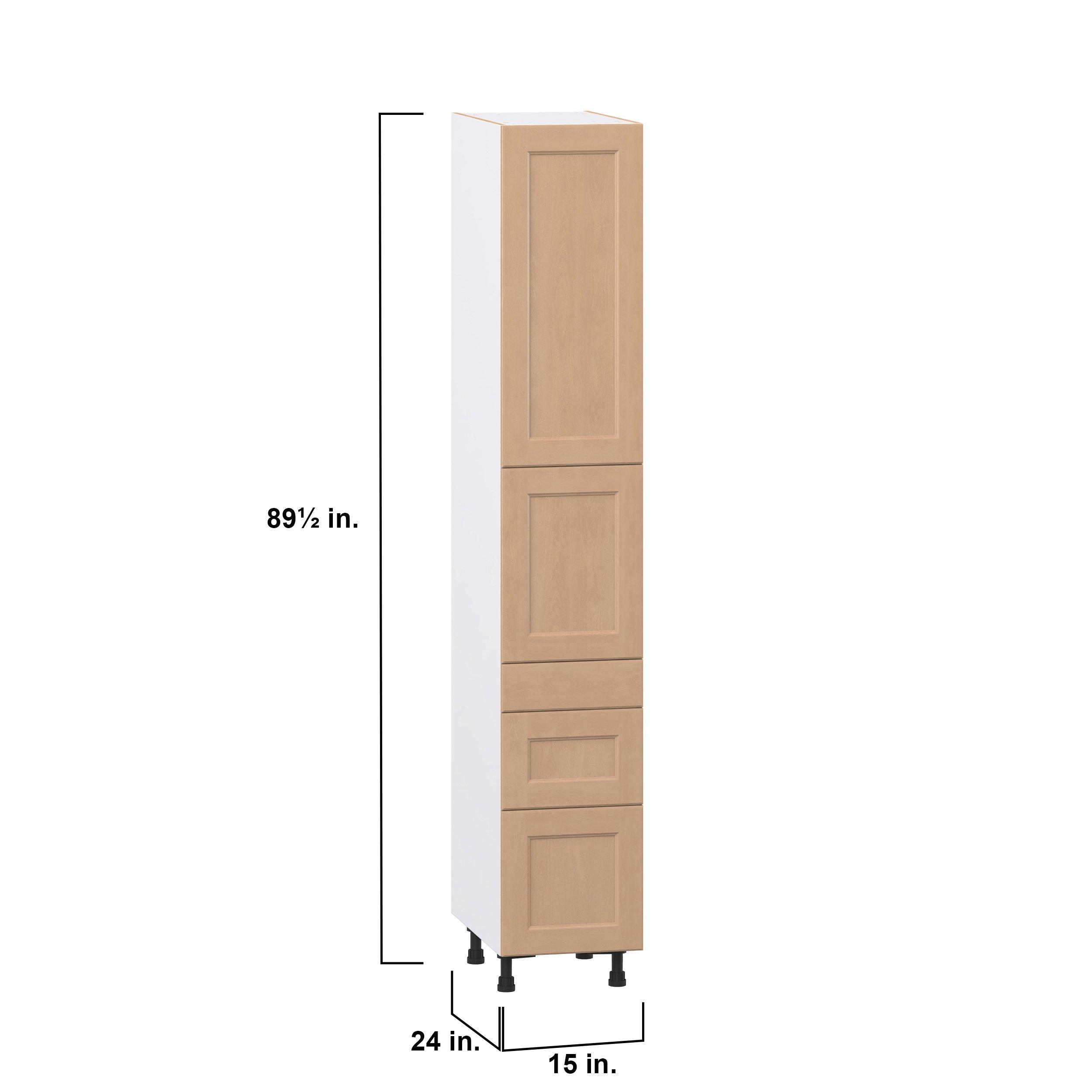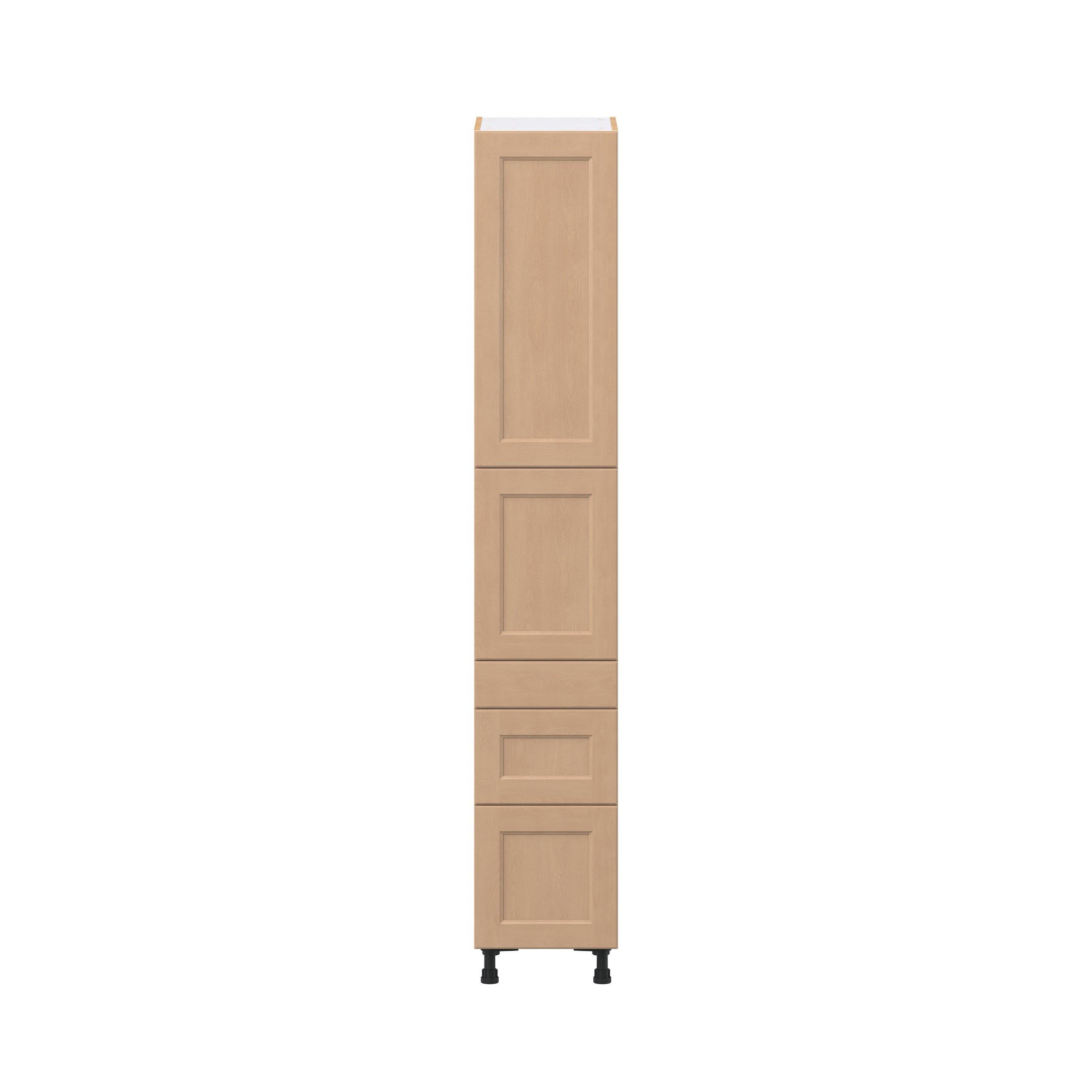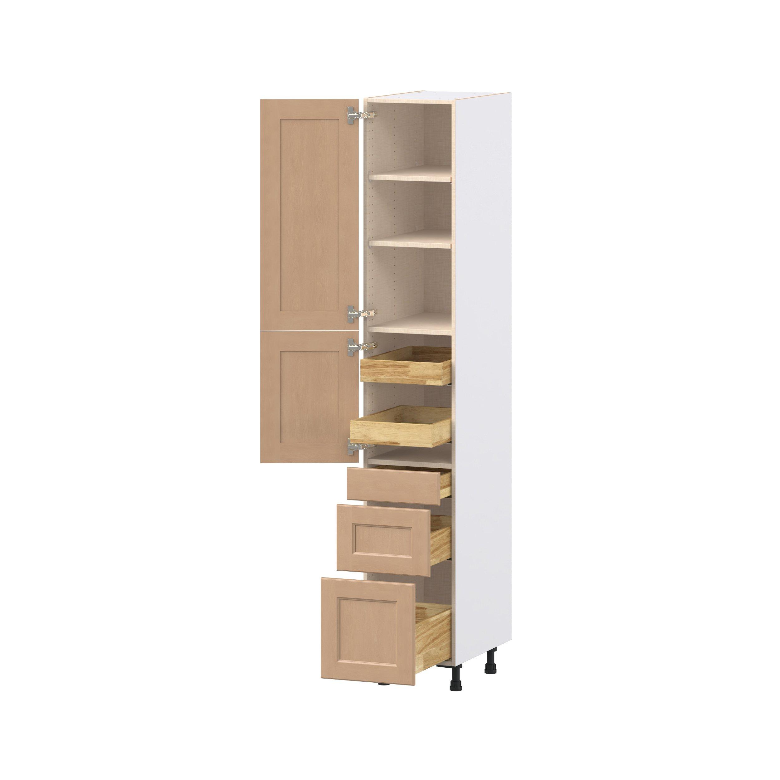 Experience the striking beauty of Sugarhill wide-rail shaker-inspired cabinets. Available in a warm and light sugar cookie finish, this collection will add warmth and lasting elegance to any space. Crafted from one-piece MDF Studio Design Collection Sugarhill 15 in. Stained Sugar Cookie Door and Drawer Pantry Cabinet with Inner Pull-Out is designed to resist hairline cracks while the easy-to-clean finish stands up to stains and moisture. Featuring 5-piece doors and dovetail drawer joints, these cabinets offer durability and elegance. This collection combines style with everyday storage solutions.