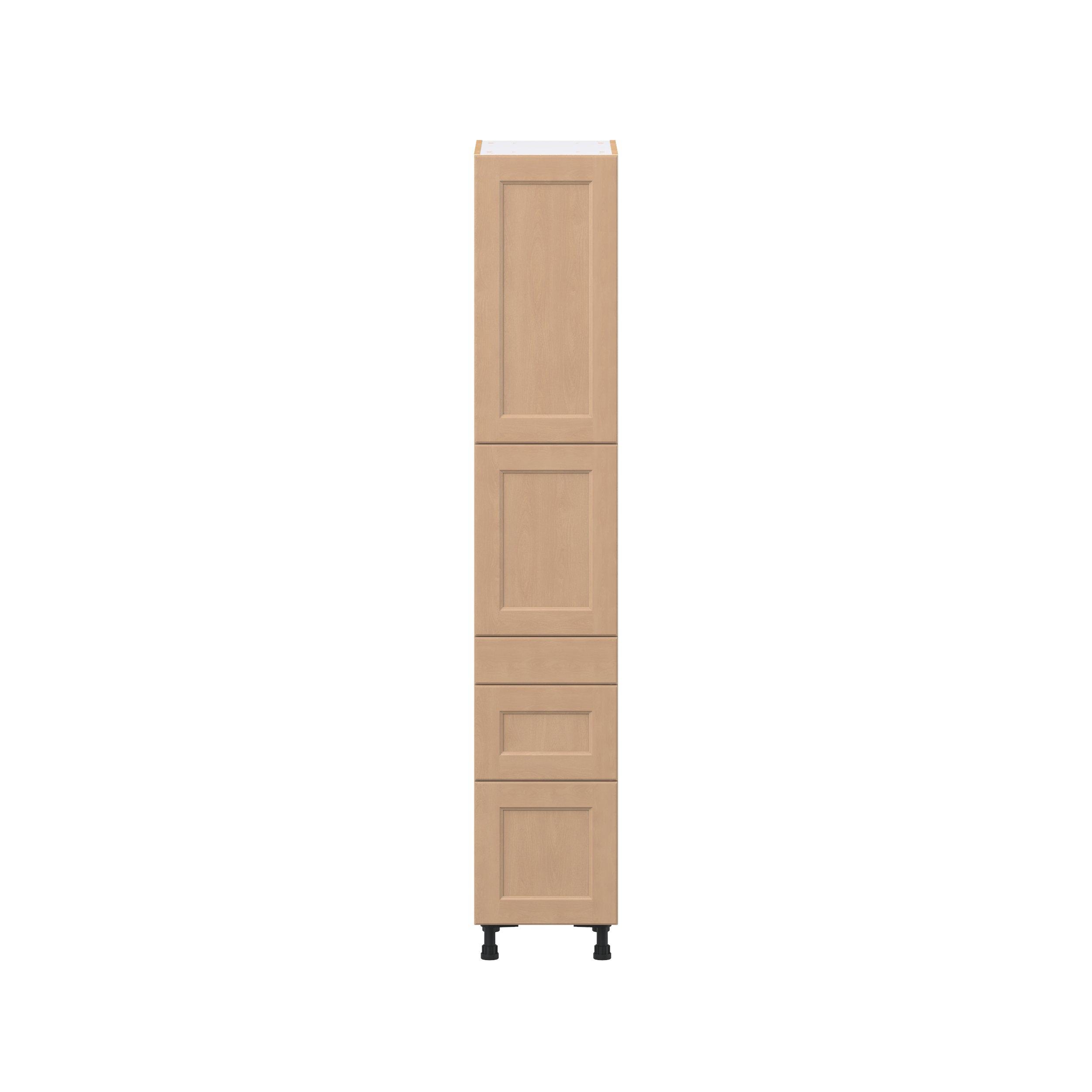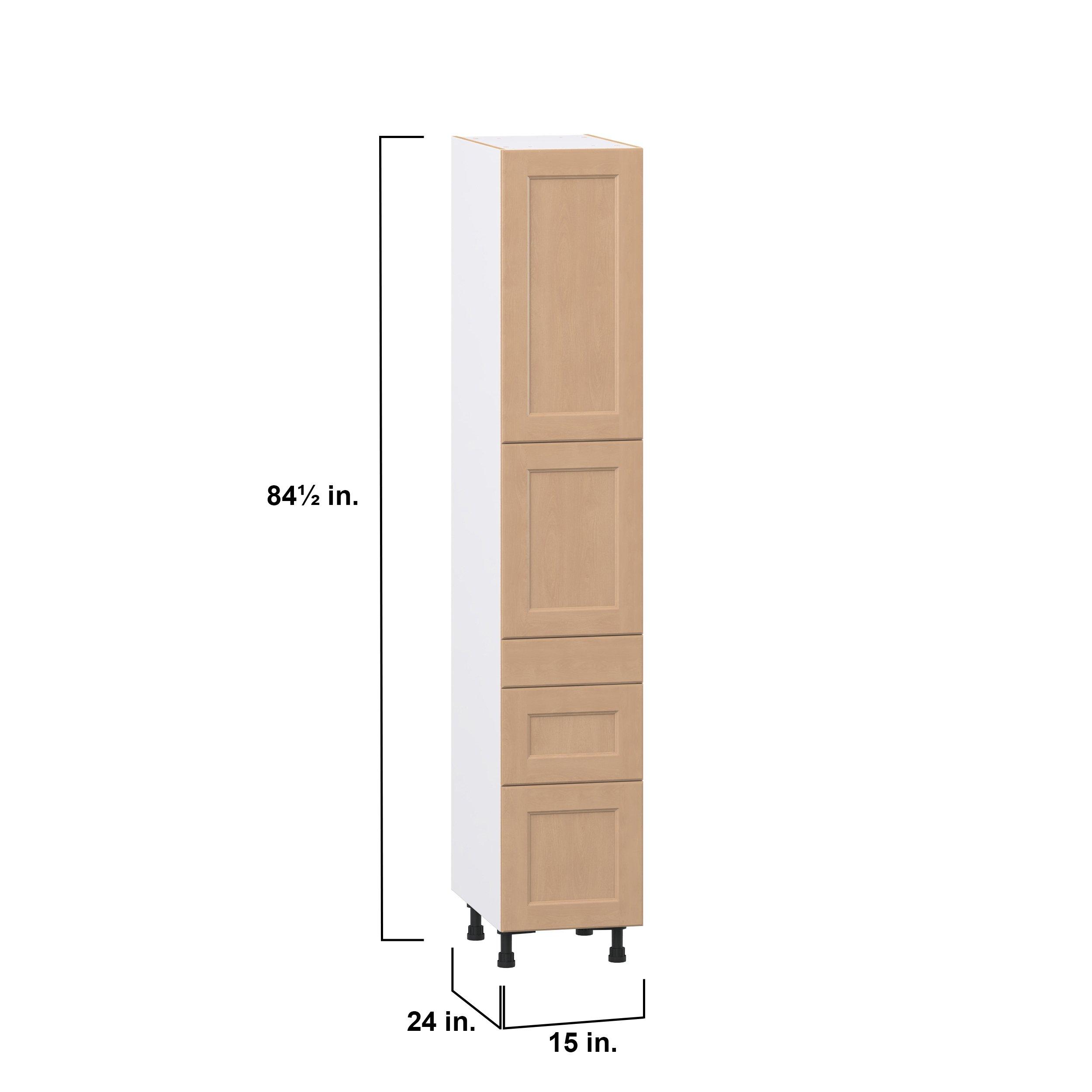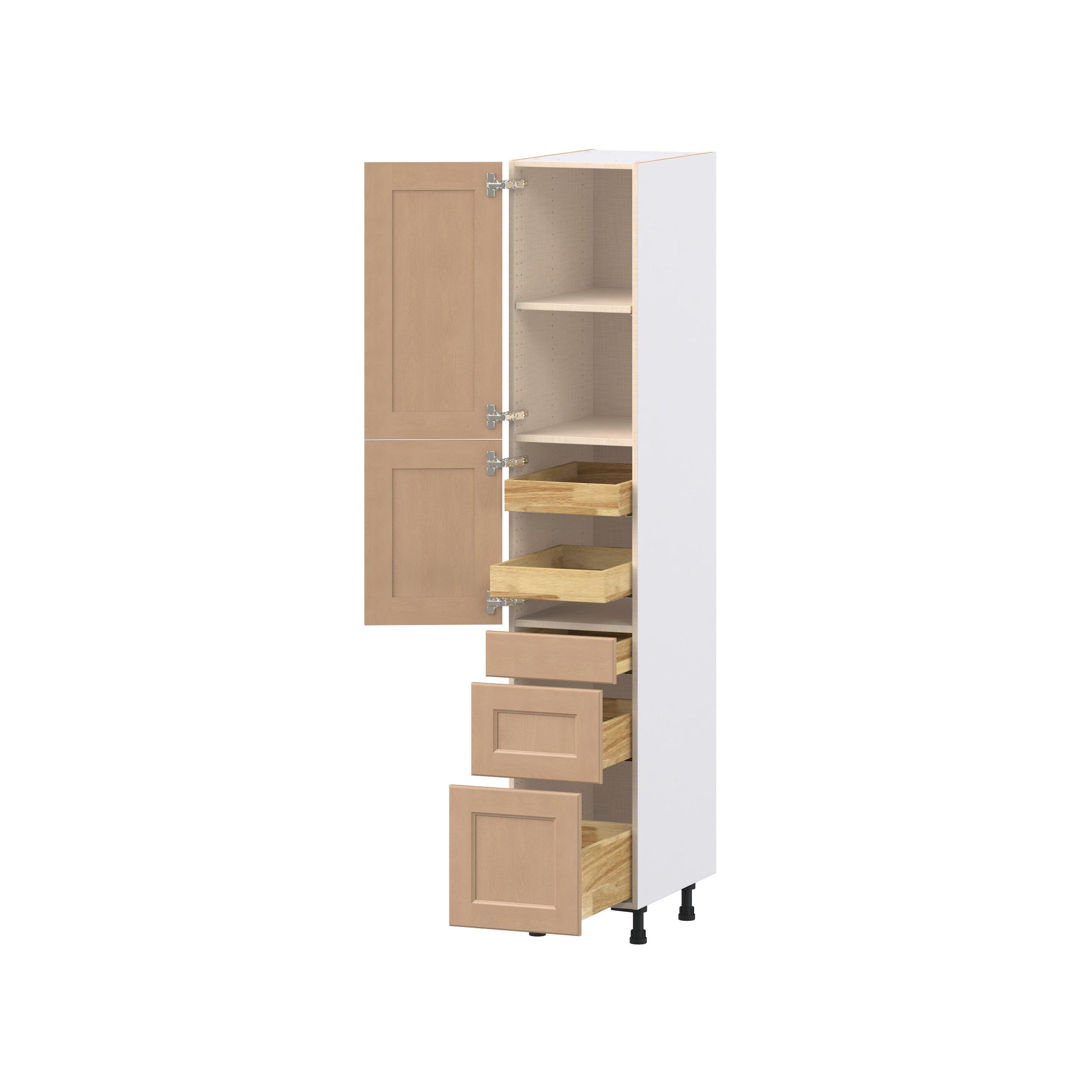 Experience the striking beauty of Sugarhill wide-rail shaker-inspired cabinets. Available in a warm and light sugar cookie finish, this collection will add warmth and lasting elegance to any space. Crafted from one-piece MDF Studio Design Collection Sugarhill 15 in. Stained Sugar Cookie Door and Drawer Pantry Cabinet with Inner Pull-Out is designed to resist hairline cracks while the easy-to-clean finish stands up to stains and moisture. Featuring 5-piece doors and dovetail drawer joints, these cabinets offer durability and elegance. This collection combines style with everyday storage solutions.