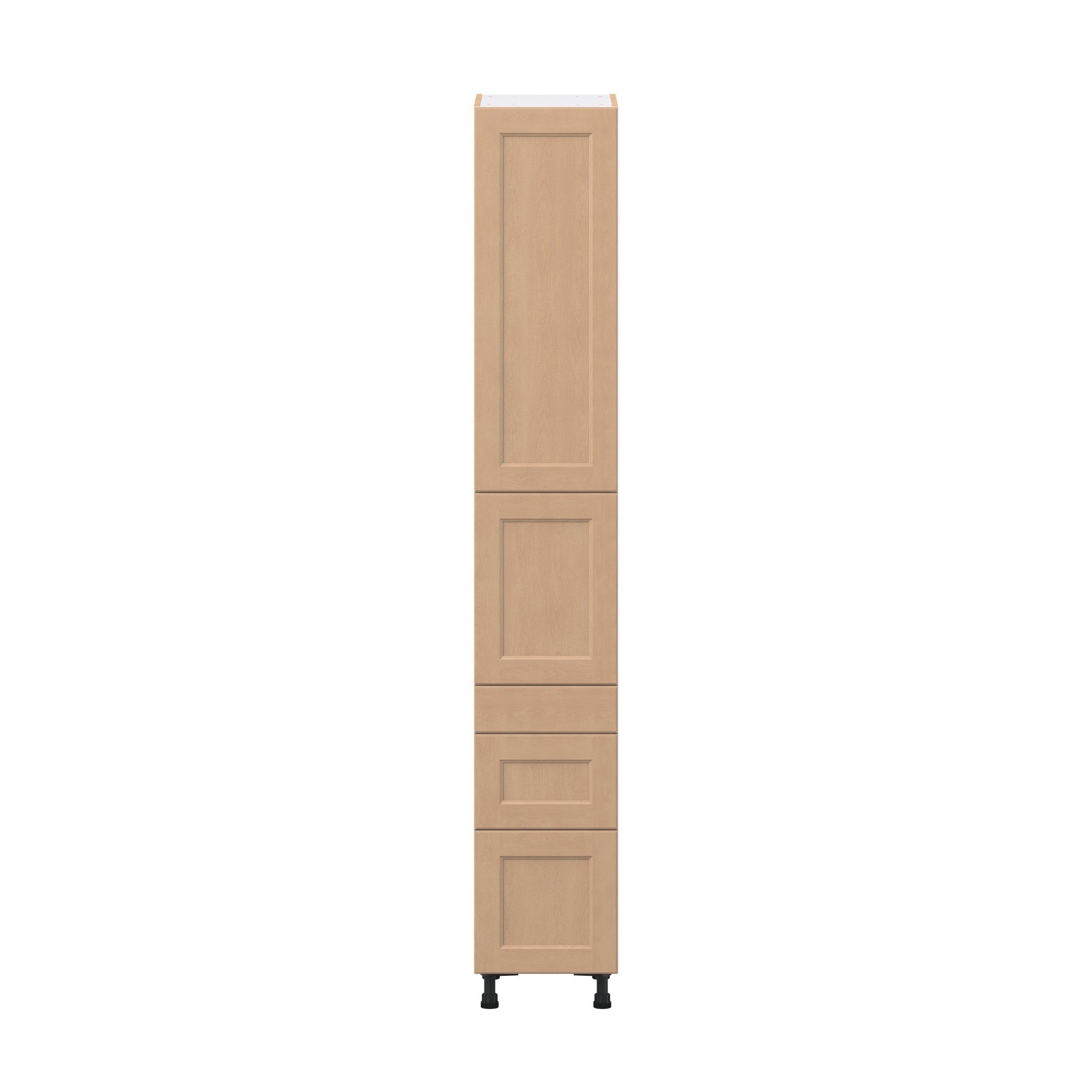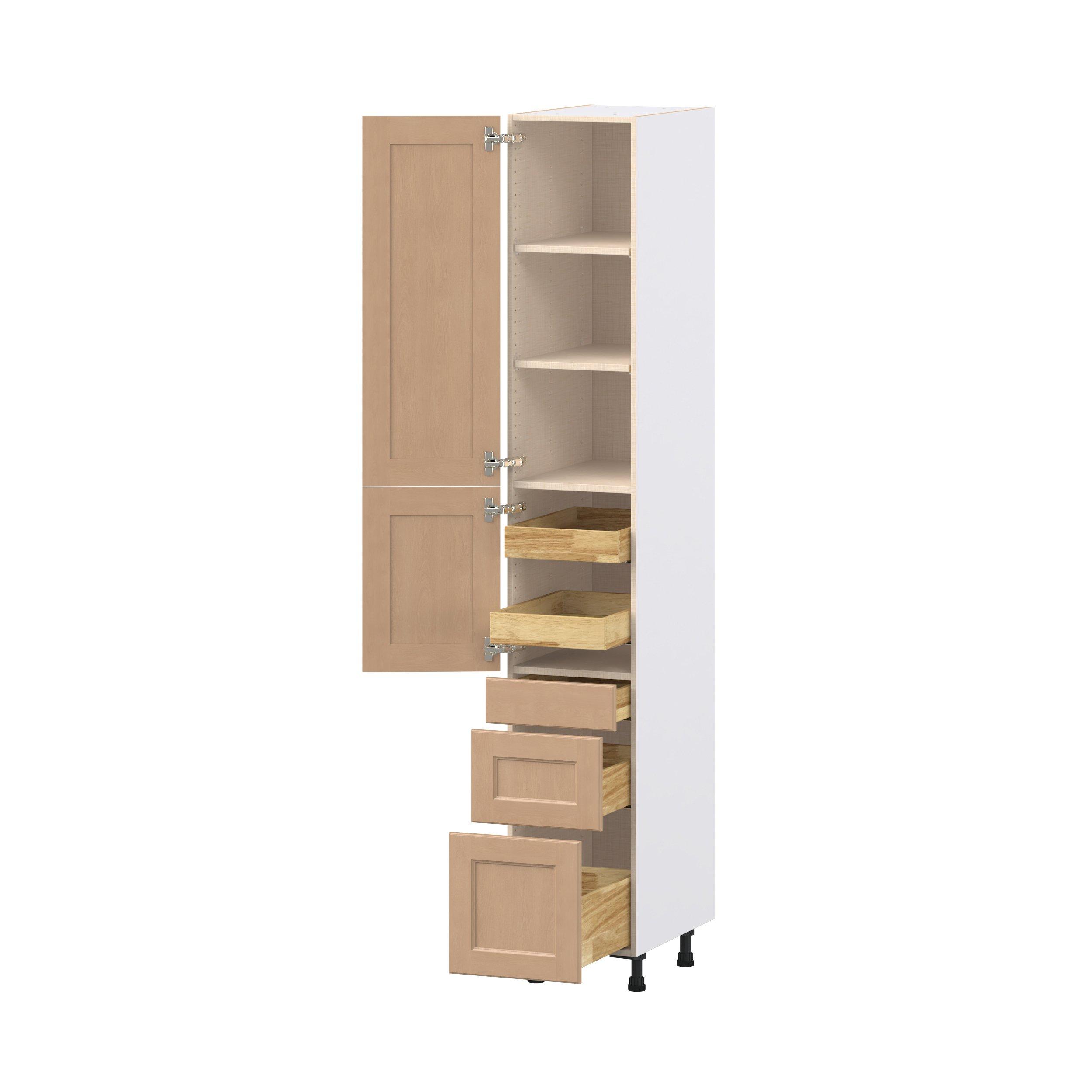 Experience the striking beauty of Sugarhill wide-rail shaker-inspired cabinets. Available in a warm and light sugar cookie finish, this collection will add warmth and lasting elegance to any space. Crafted from one-piece MDF Studio Design Collection Sugarhill 15 in. Stained Sugar Cookie Door and Drawer Pantry Cabinet with Inner Pull-Out is designed to resist hairline cracks while the easy-to-clean finish stands up to stains and moisture. Featuring 5-piece doors and dovetail drawer joints, these cabinets offer durability and elegance. This collection combines style with everyday storage solutions.