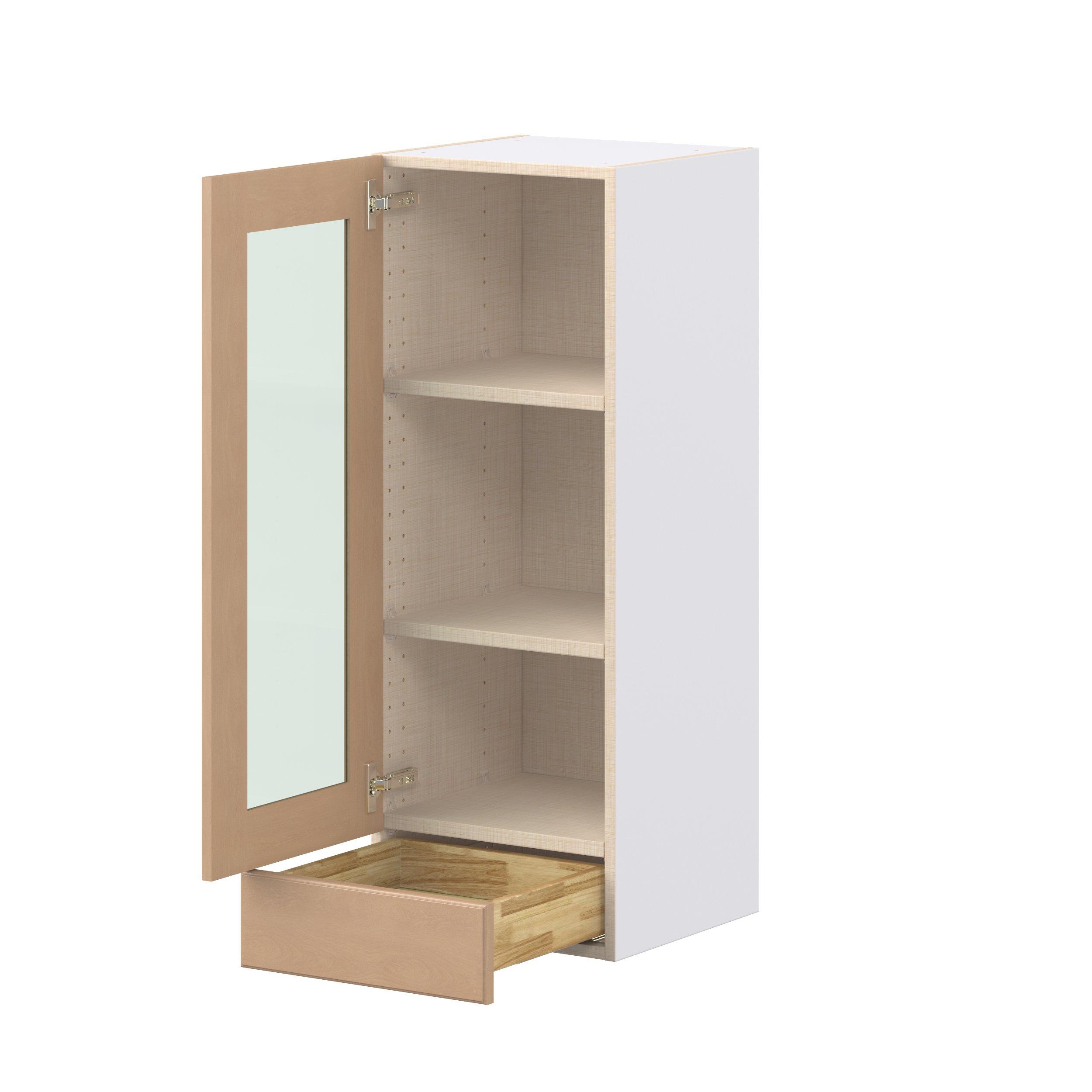 Experience the striking beauty of Sugarhill wide-rail shaker-inspired cabinets. Available in a warm and light sugar cookie finish, this collection will add warmth and lasting elegance to any space. Crafted from one-piece MDF Studio Design Collection Sugarhill 15 in. Stained Sugar Cookie Drawer Wall Cabinet with Glass Door is designed to resist hairline cracks while the easy-to-clean finish stands up to stains and moisture. Featuring 5-piece doors and dovetail drawer joints, these cabinets offer durability and elegance. This collection combines style with everyday storage solutions.