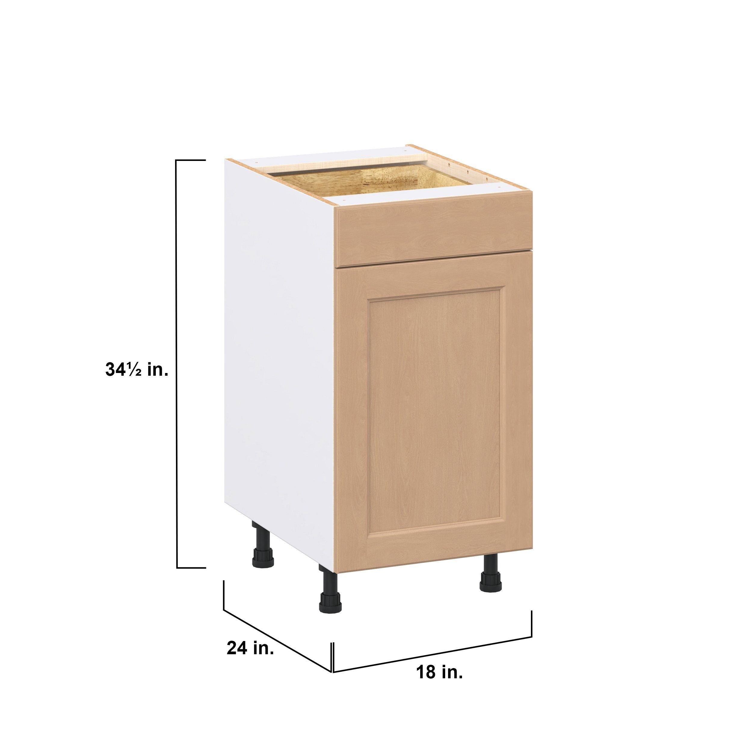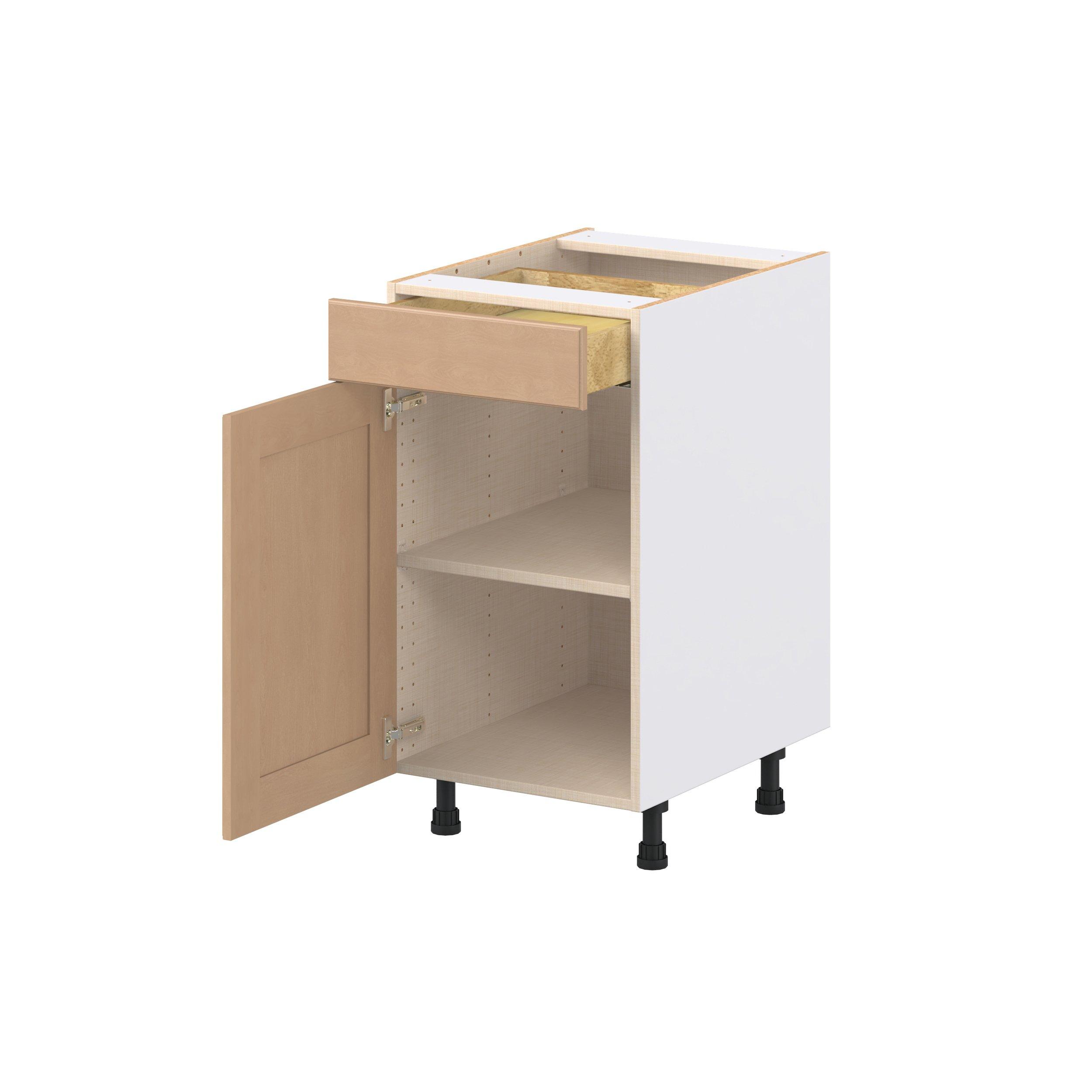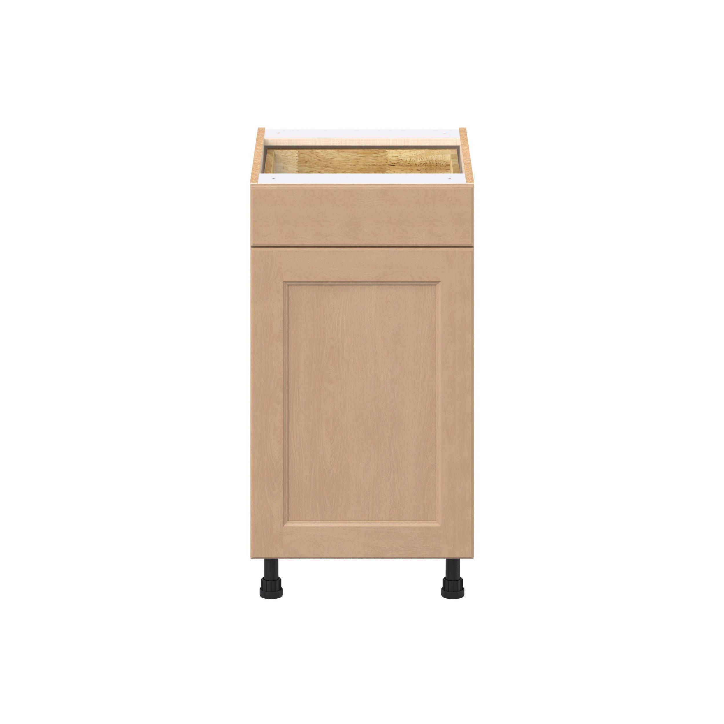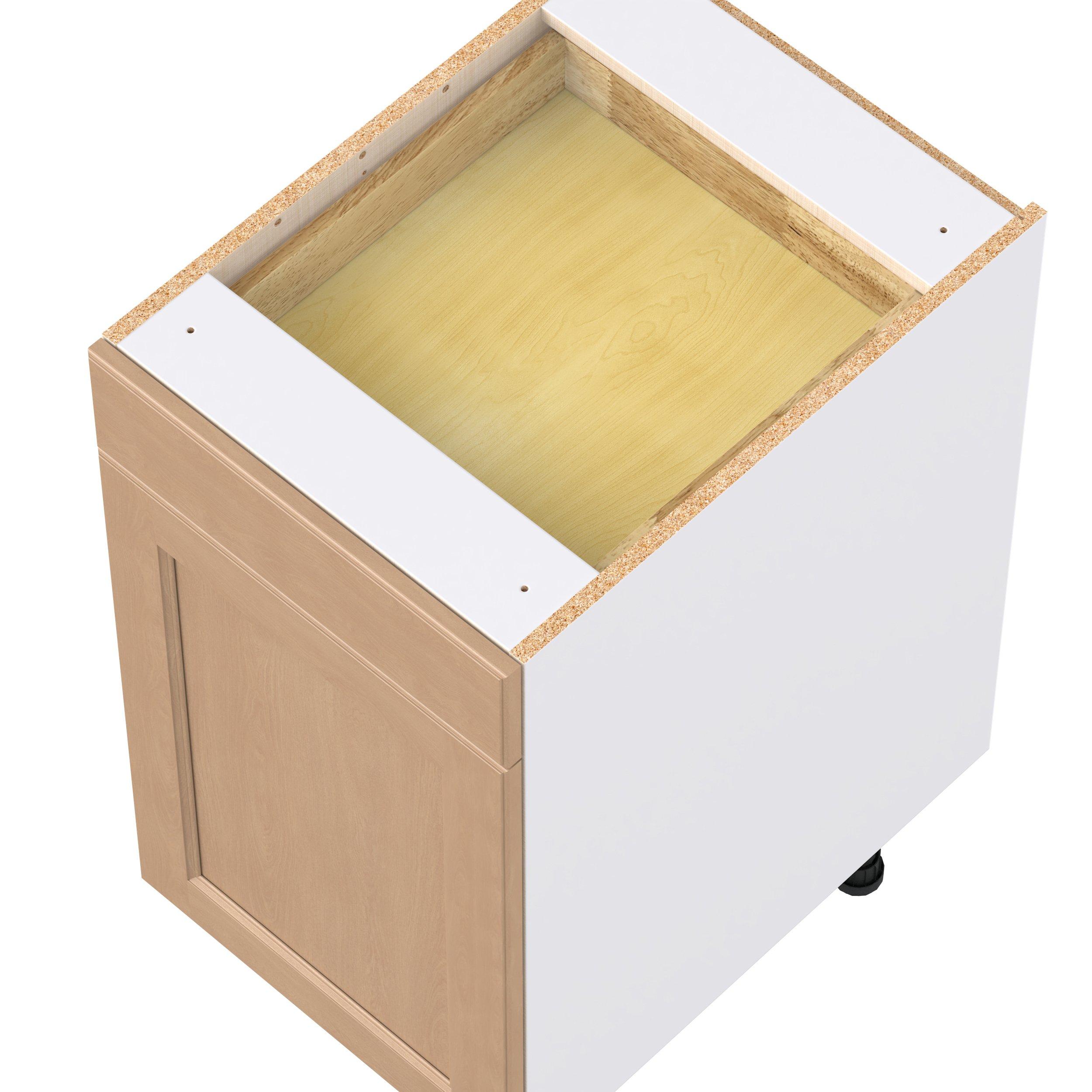 Experience the striking beauty of Sugarhill wide-rail shaker-inspired cabinets. Available in a warm and light sugar cookie finish, this collection will add warmth and lasting elegance to any space. Crafted from one-piece MDF Studio Design Collection Sugarhill 18 in. Stained Sugar Cookie Door and Drawer Base Cabinet is designed to resist hairline cracks while the easy-to-clean finish stands up to stains and moisture. Featuring 5-piece doors and dovetail drawer joints, these cabinets offer durability and elegance. This collection combines style with everyday storage solutions.