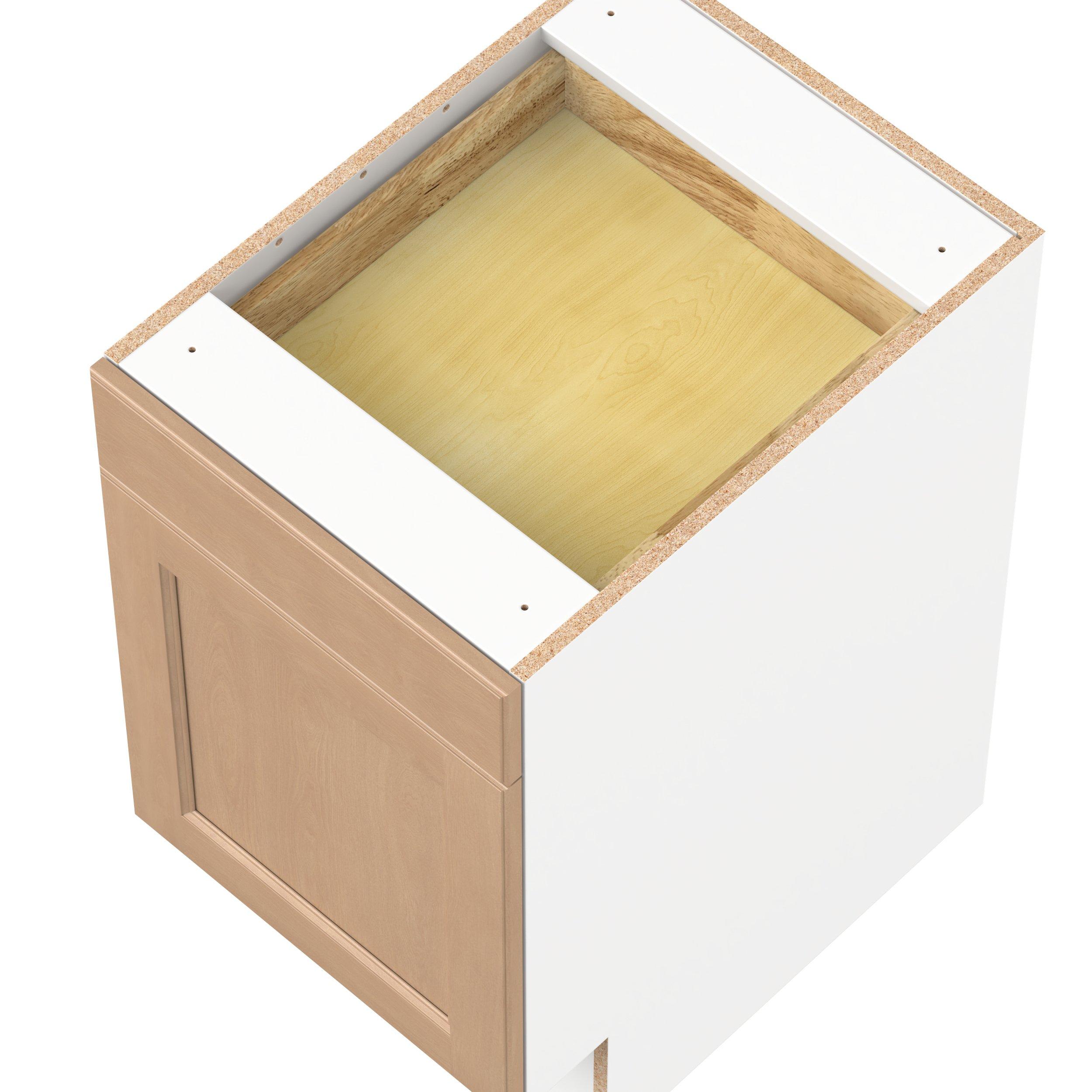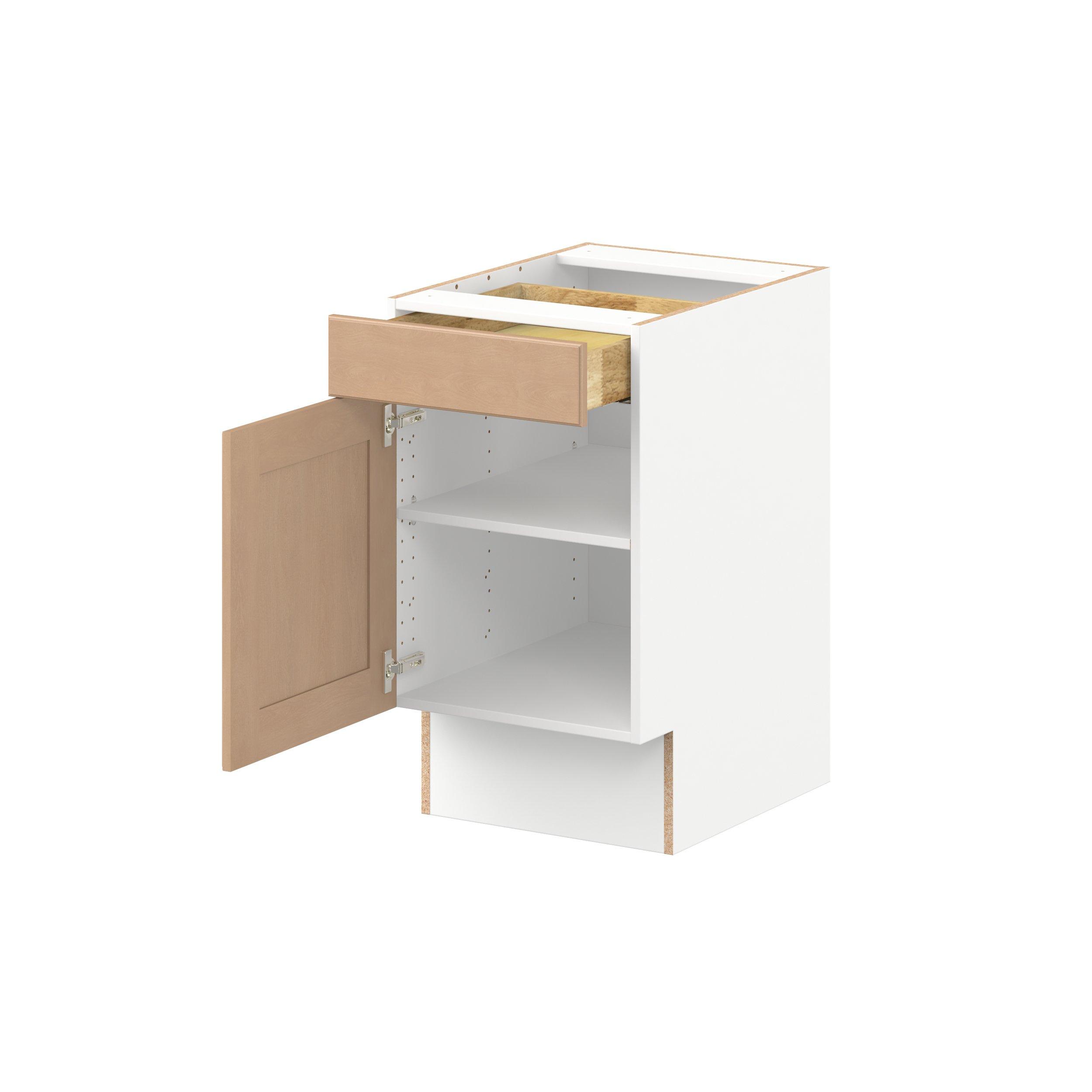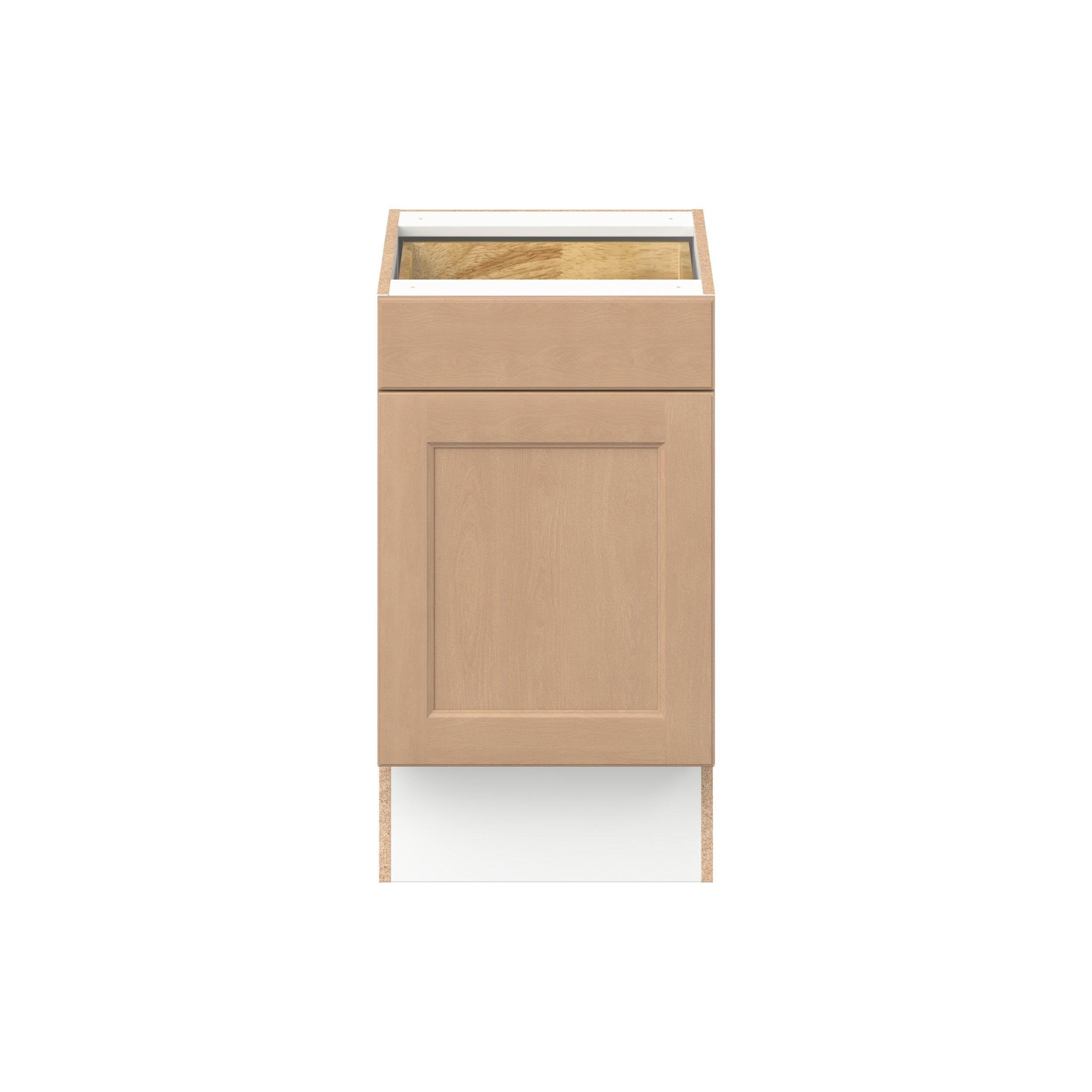 Experience the striking beauty of Sugarhill wide-rail shaker-inspired cabinets. Available in a warm and light sugar cookie finish, this collection will add warmth and lasting elegance to any space. Crafted from one-piece MDF Studio Design Collection Sugarhill 18 in. Stained Sugar Cookie Door and Drawer Base Cabinet is designed to resist hairline cracks while the easy-to-clean finish stands up to stains and moisture. Featuring 5-piece doors and dovetail drawer joints, these cabinets offer durability and elegance. This collection combines style with everyday storage solutions.