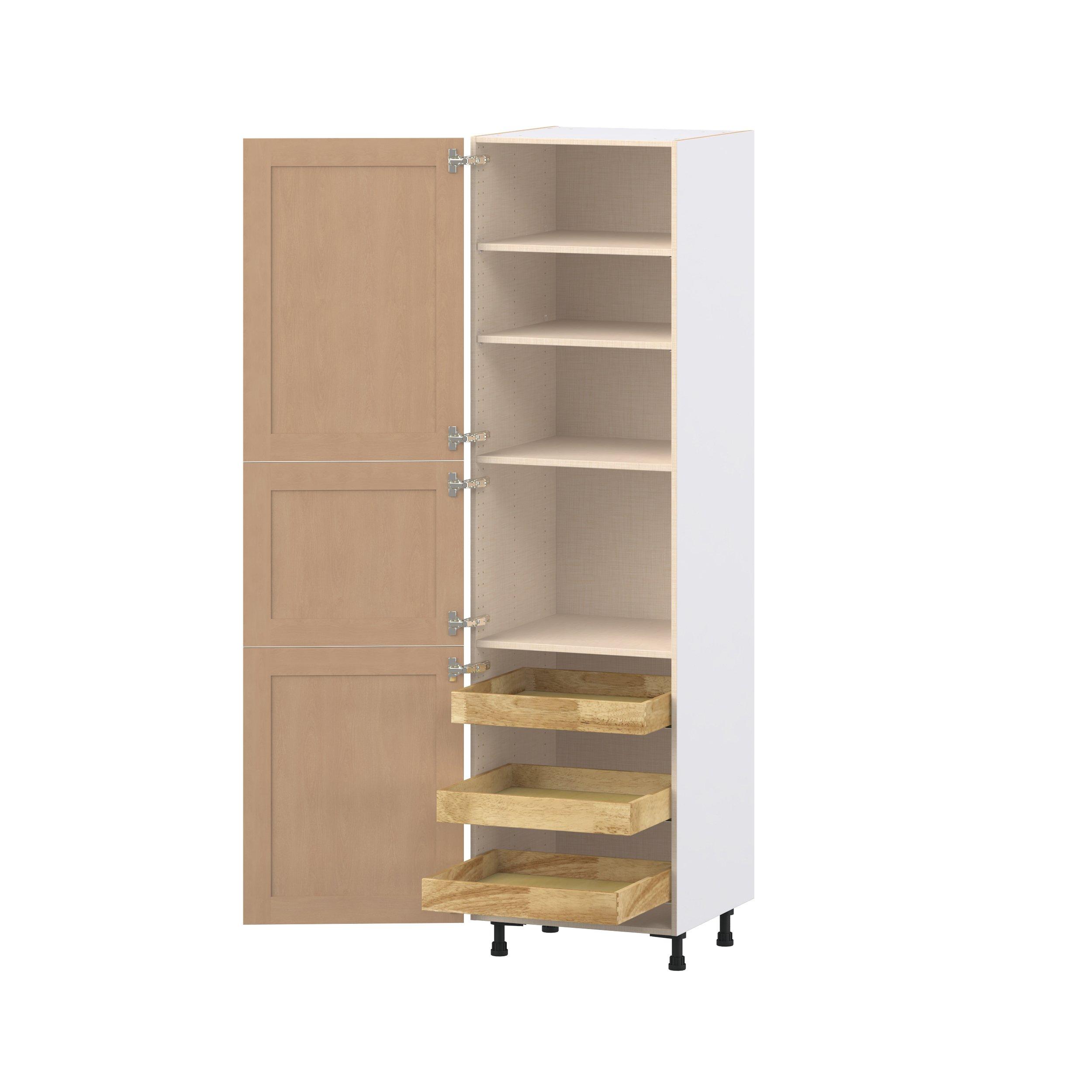 Experience the striking beauty of Sugarhill wide-rail shaker-inspired cabinets. Available in a warm and light sugar cookie finish, this collection will add warmth and lasting elegance to any space. Crafted from one-piece MDF Studio Design Collection Sugarhill 24 in. Stained Sugar Cookie Pantry Cabinet with Inner Pull-Out Drawer is designed to resist hairline cracks while the easy-to-clean finish stands up to stains and moisture. Featuring 5-piece doors and dovetail drawer joints, these cabinets offer durability and elegance. This collection combines style with everyday storage solutions.