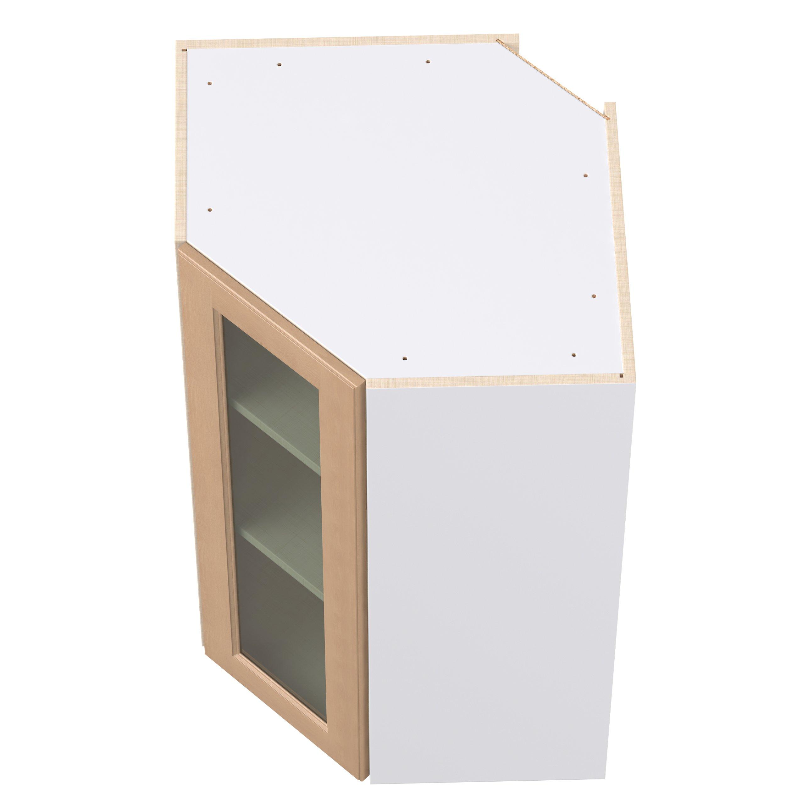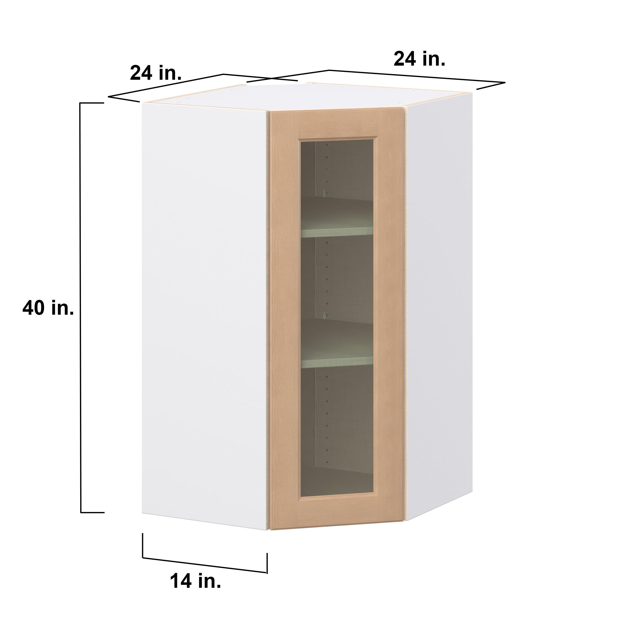 Experience the striking beauty of Sugarhill wide-rail shaker-inspired cabinets. Available in a warm and light sugar cookie finish, this collection will add warmth and lasting elegance to any space. Crafted from one-piece MDF Studio Design Collection Sugarhill 24 in. Stained Sugar Cookie Wall Angle Corner Cabinet with Glass Door is designed to resist hairline cracks while the easy-to-clean finish stands up to stains and moisture. Featuring 5-piece doors and dovetail drawer joints, these cabinets offer durability and elegance. This collection combines style with everyday storage solutions.