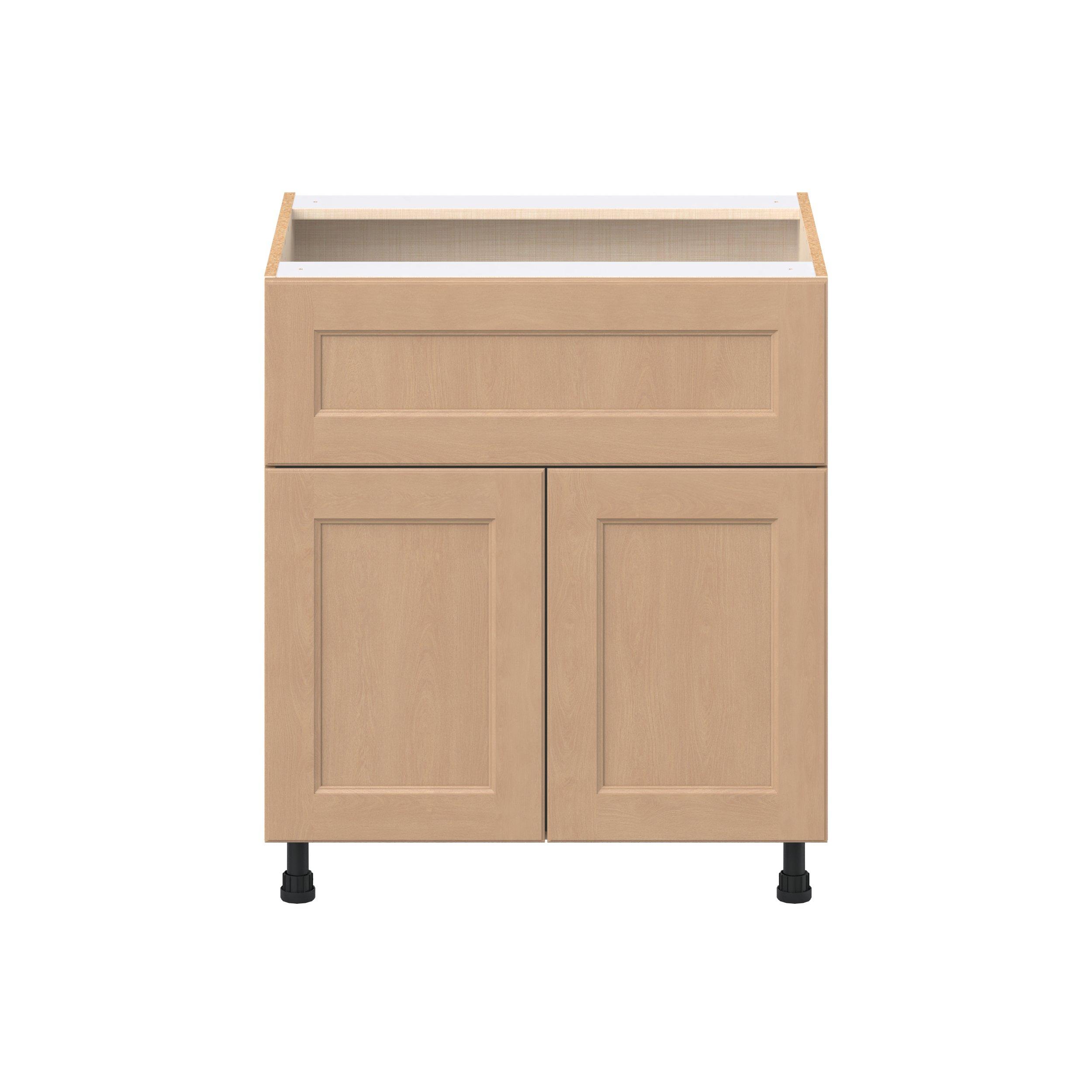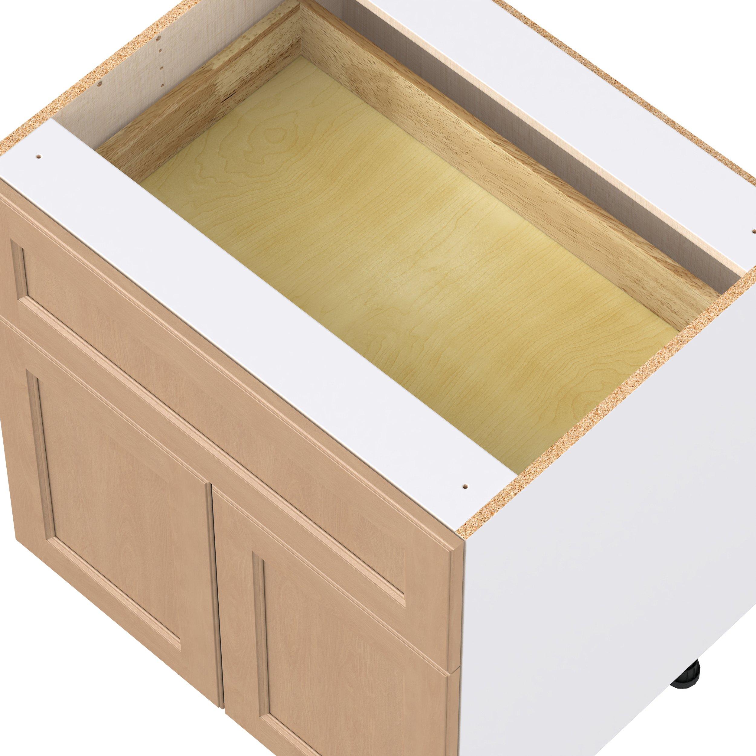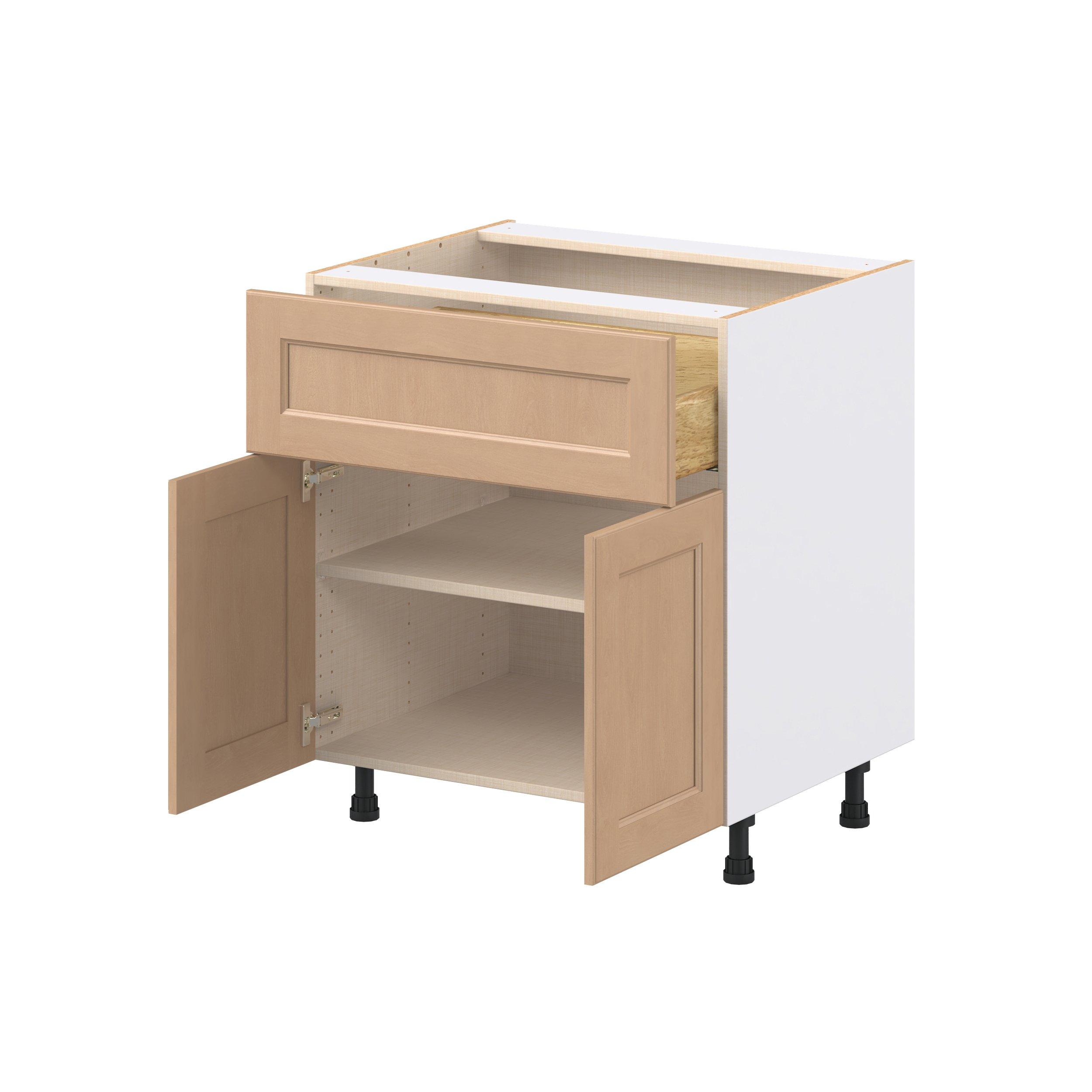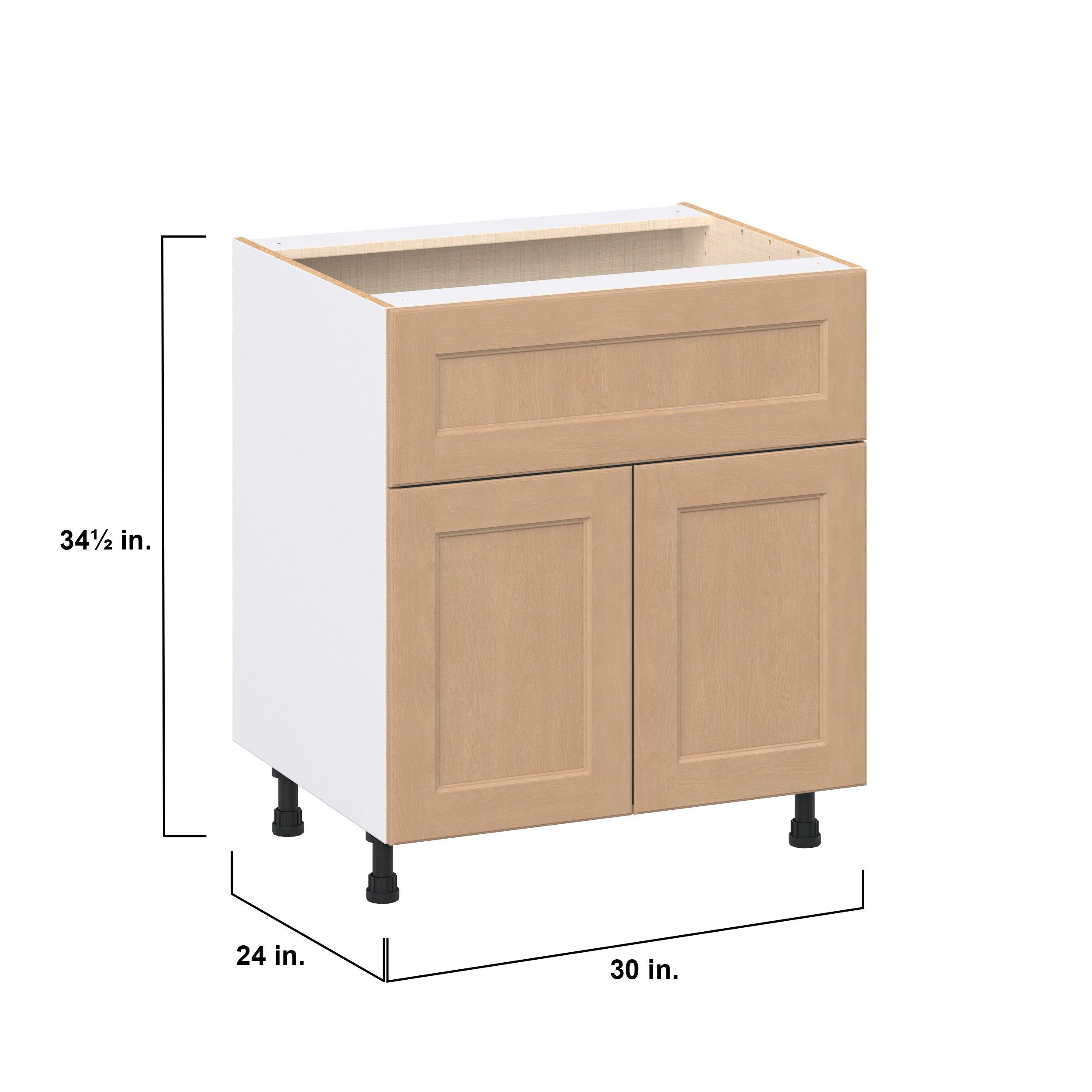 Experience the striking beauty of Sugarhill wide-rail shaker-inspired cabinets. Available in a warm and light sugar cookie finish, this collection will add warmth and lasting elegance to any space. Crafted from one-piece MDF Studio Design Collection Sugarhill 30 in. Stained Sugar Cookie Door and Drawer Base Cabinet is designed to resist hairline cracks while the easy-to-clean finish stands up to stains and moisture. Featuring 5-piece doors and dovetail drawer joints, these cabinets offer durability and elegance. This collection combines style with everyday storage solutions.
