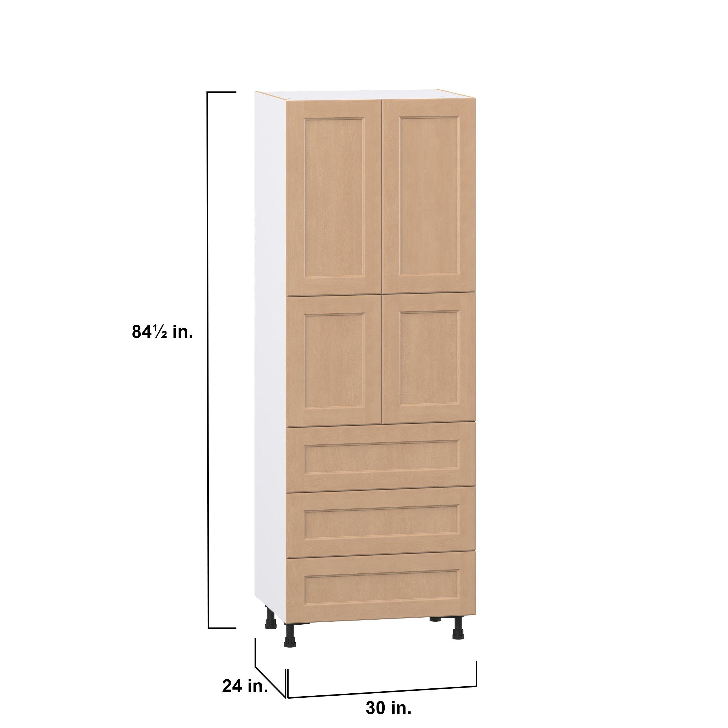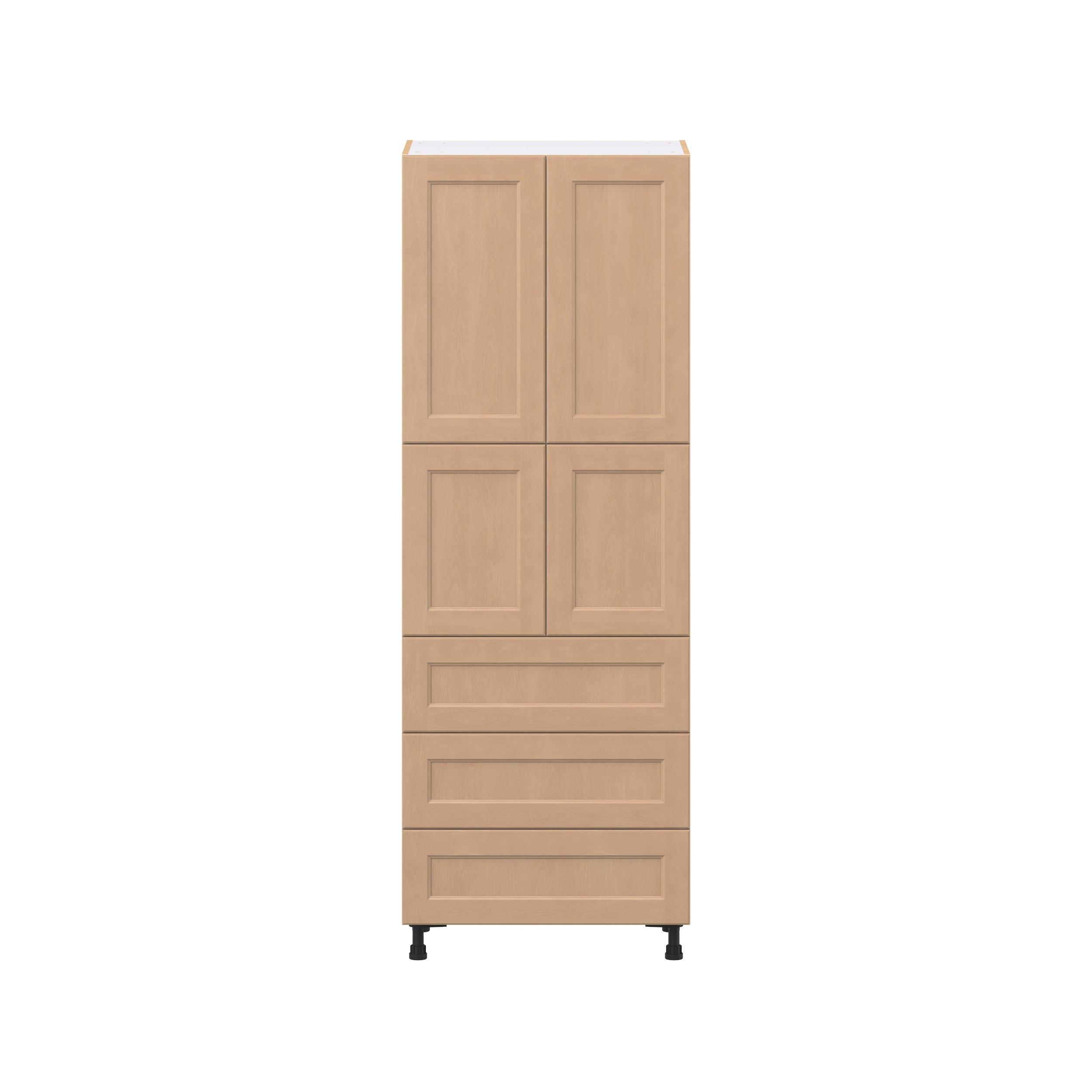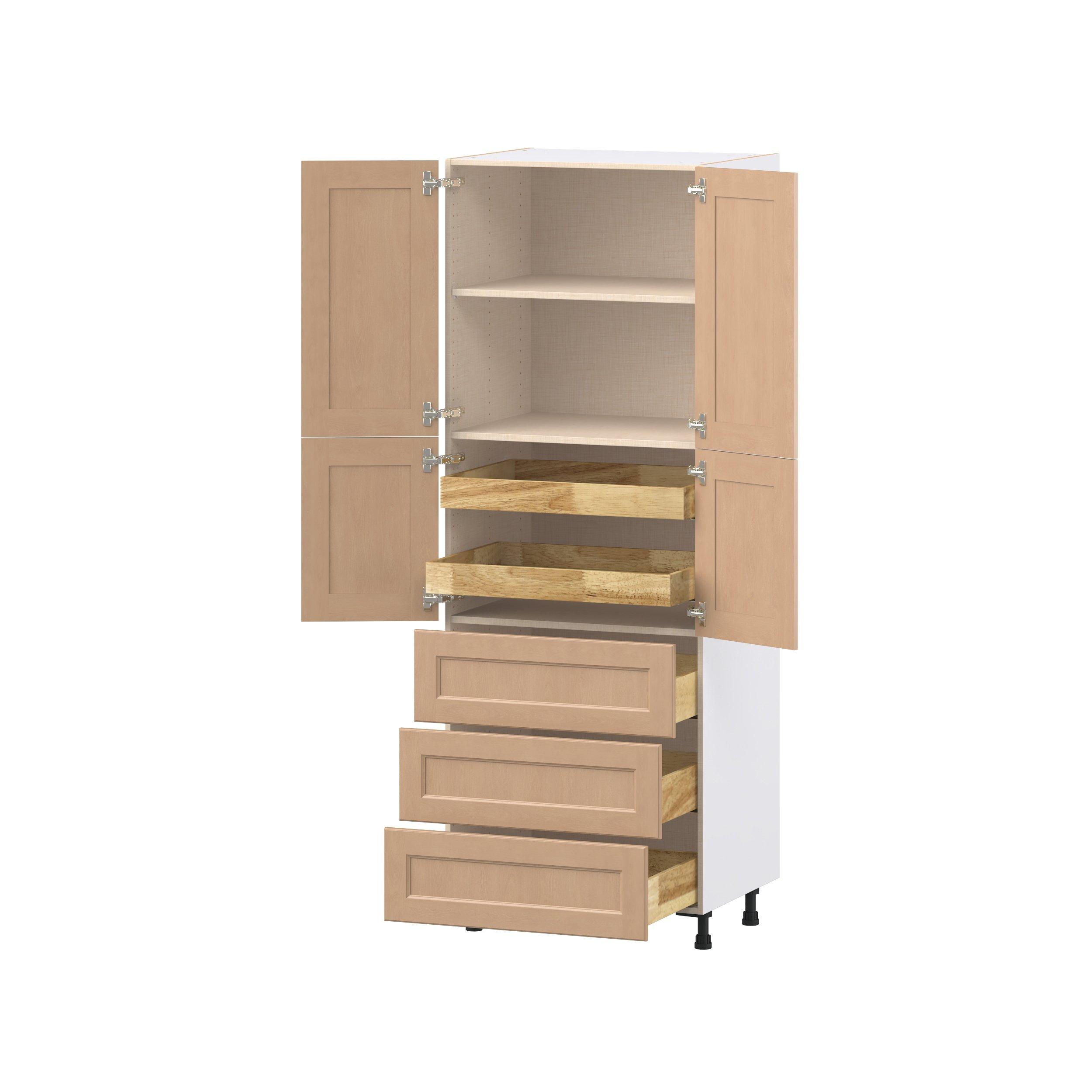 Experience the striking beauty of Sugarhill wide-rail shaker-inspired cabinets. Available in a warm and light sugar cookie finish, this collection will add warmth and lasting elegance to any space. Crafted from one-piece MDF Studio Design Collection Sugarhill 30 in. Stained Sugar Cookie Door and Drawer Pantry Cabinet with Inner Pull-Out is designed to resist hairline cracks while the easy-to-clean finish stands up to stains and moisture. Featuring 5-piece doors and dovetail drawer joints, these cabinets offer durability and elegance. This collection combines style with everyday storage solutions.
