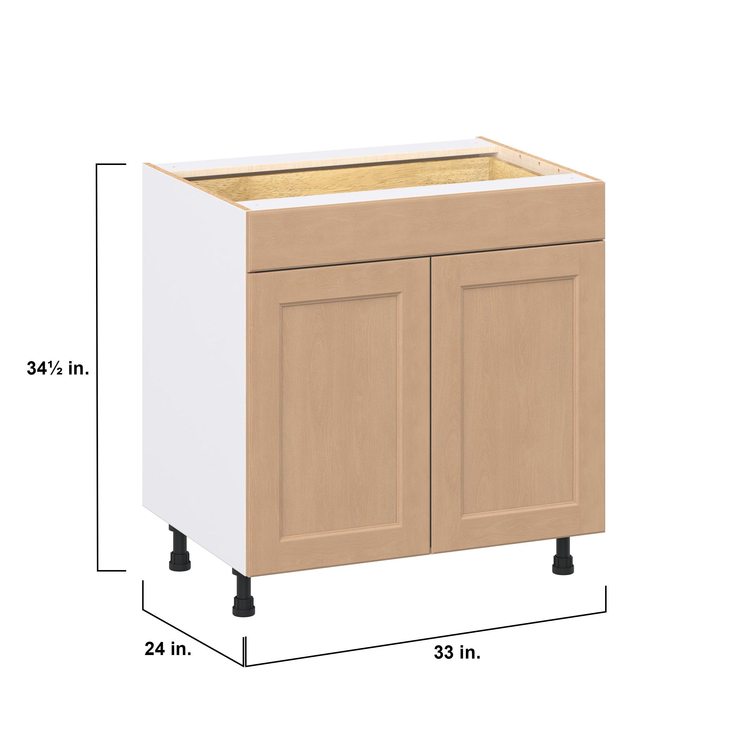 Experience the striking beauty of Sugarhill wide-rail shaker-inspired cabinets. Available in a warm and light sugar cookie finish, this collection will add warmth and lasting elegance to any space. Crafted from one-piece MDF Studio Design Collection Sugarhill 33 in. Stained Sugar Cookie Door and Drawer Base Cabinet is designed to resist hairline cracks while the easy-to-clean finish stands up to stains and moisture. Featuring 5-piece doors and dovetail drawer joints, these cabinets offer durability and elegance. This collection combines style with everyday storage solutions.