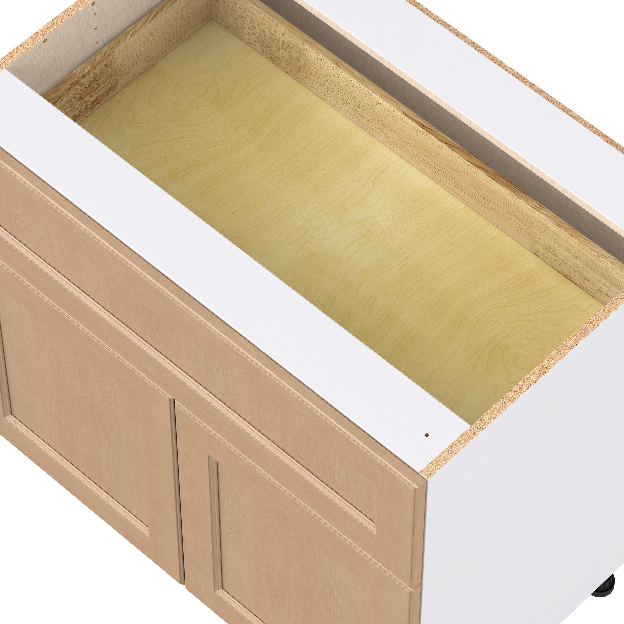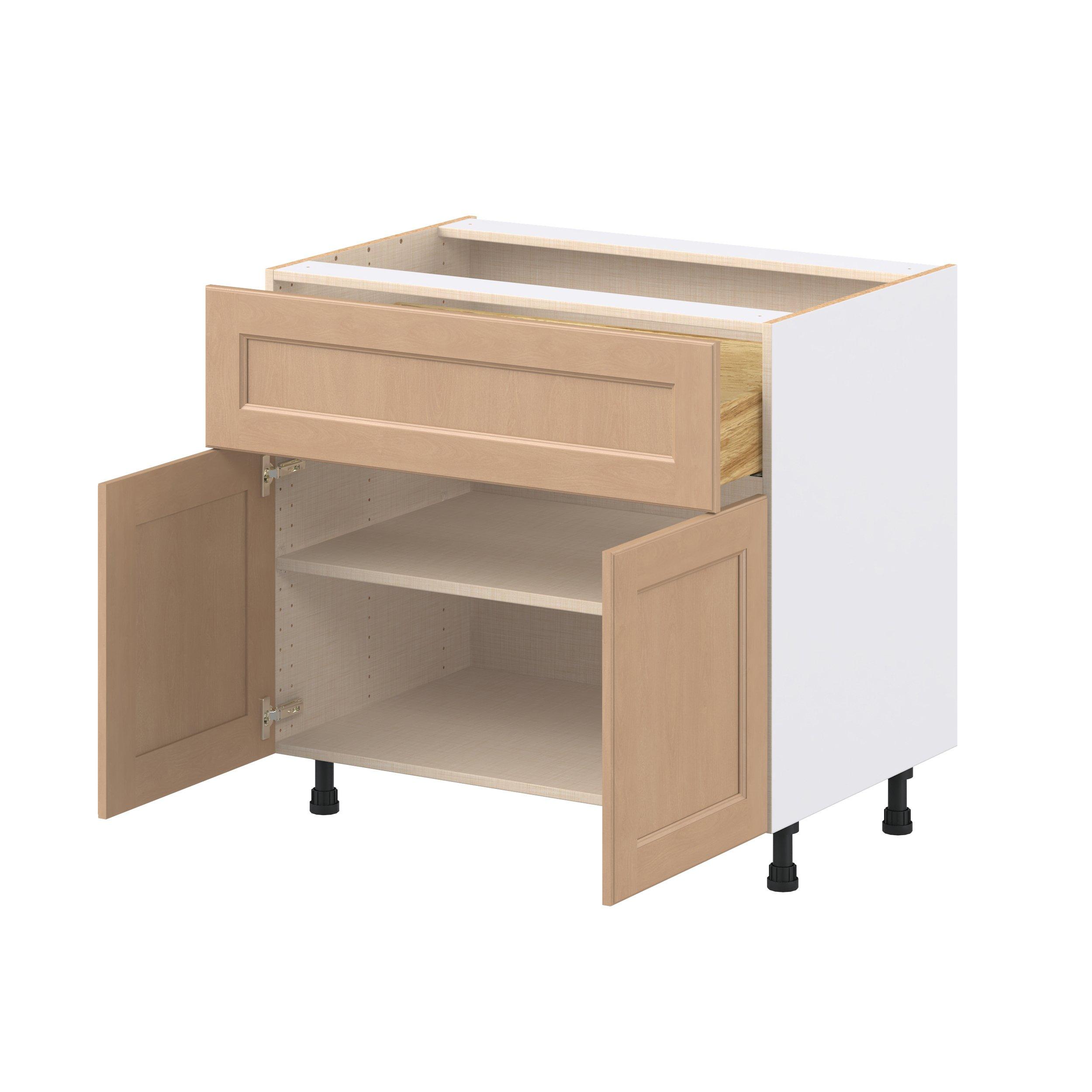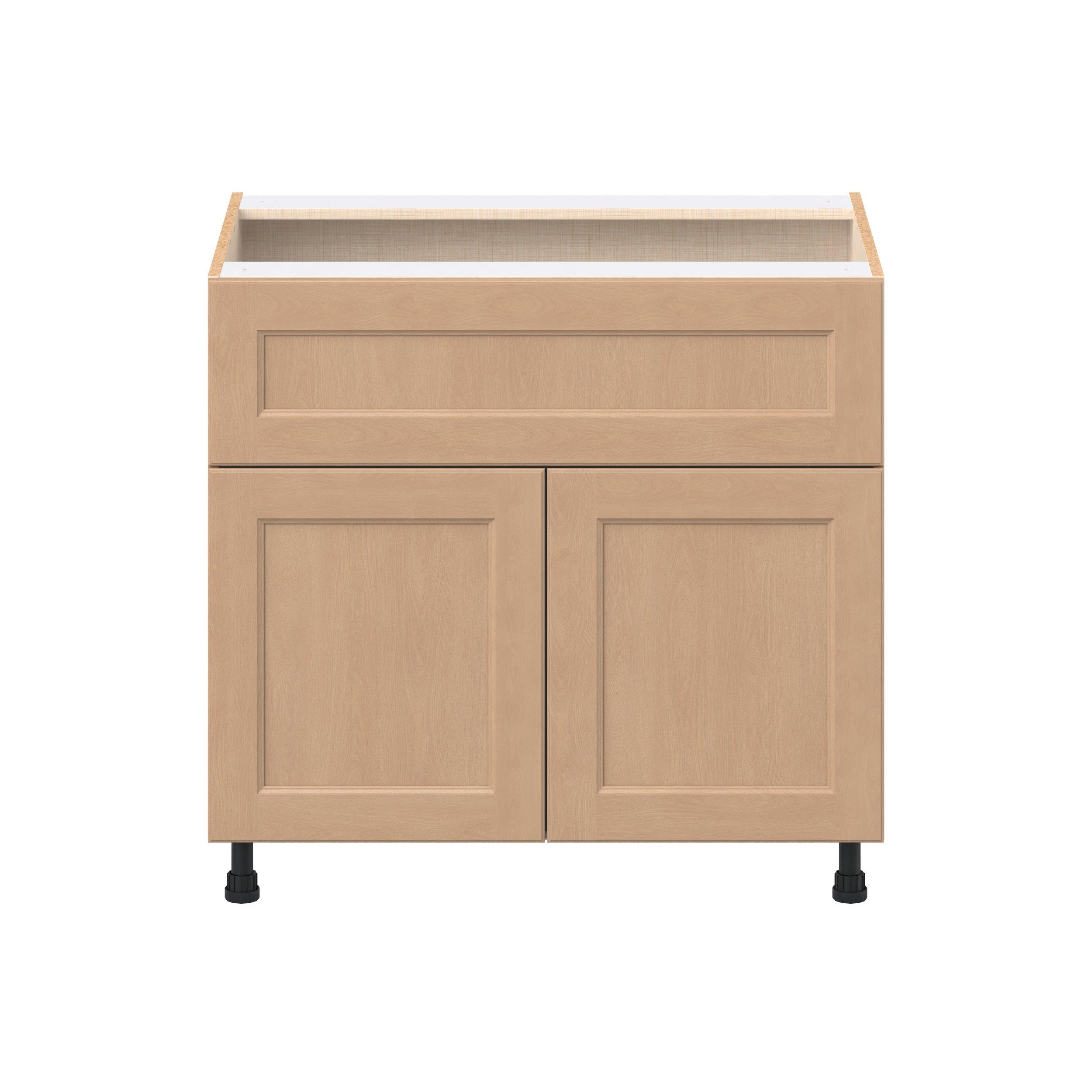Experience the striking beauty of Sugarhill wide-rail shaker-inspired cabinets. Available in a warm and light sugar cookie finish, this collection will add warmth and lasting elegance to any space. Crafted from one-piece MDF Studio Design Collection Sugarhill 36 in. Stained Sugar Cookie Door and Drawer Base Cabinet is designed to resist hairline cracks while the easy-to-clean finish stands up to stains and moisture. Featuring 5-piece doors and dovetail drawer joints, these cabinets offer durability and elegance. This collection combines style with everyday storage solutions.