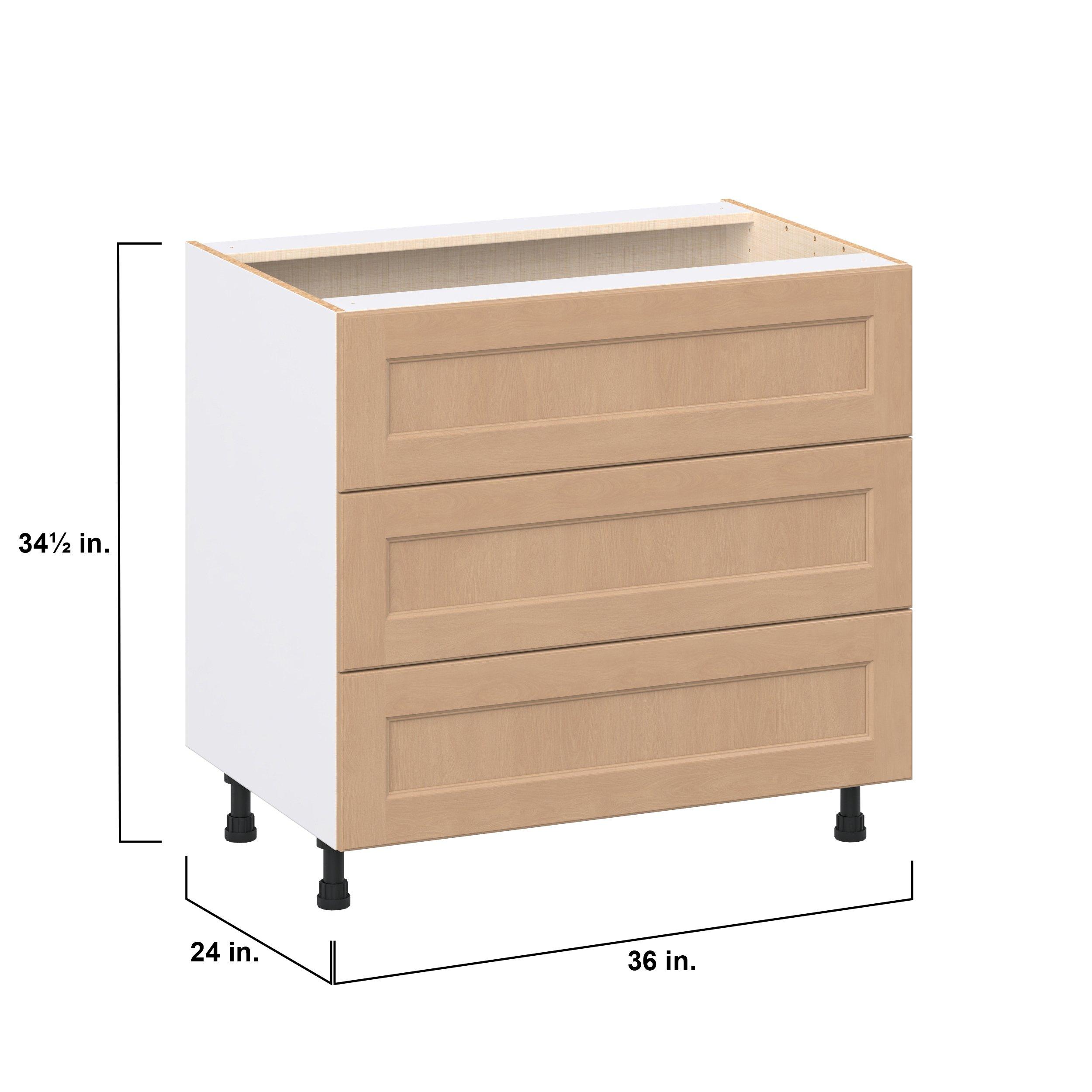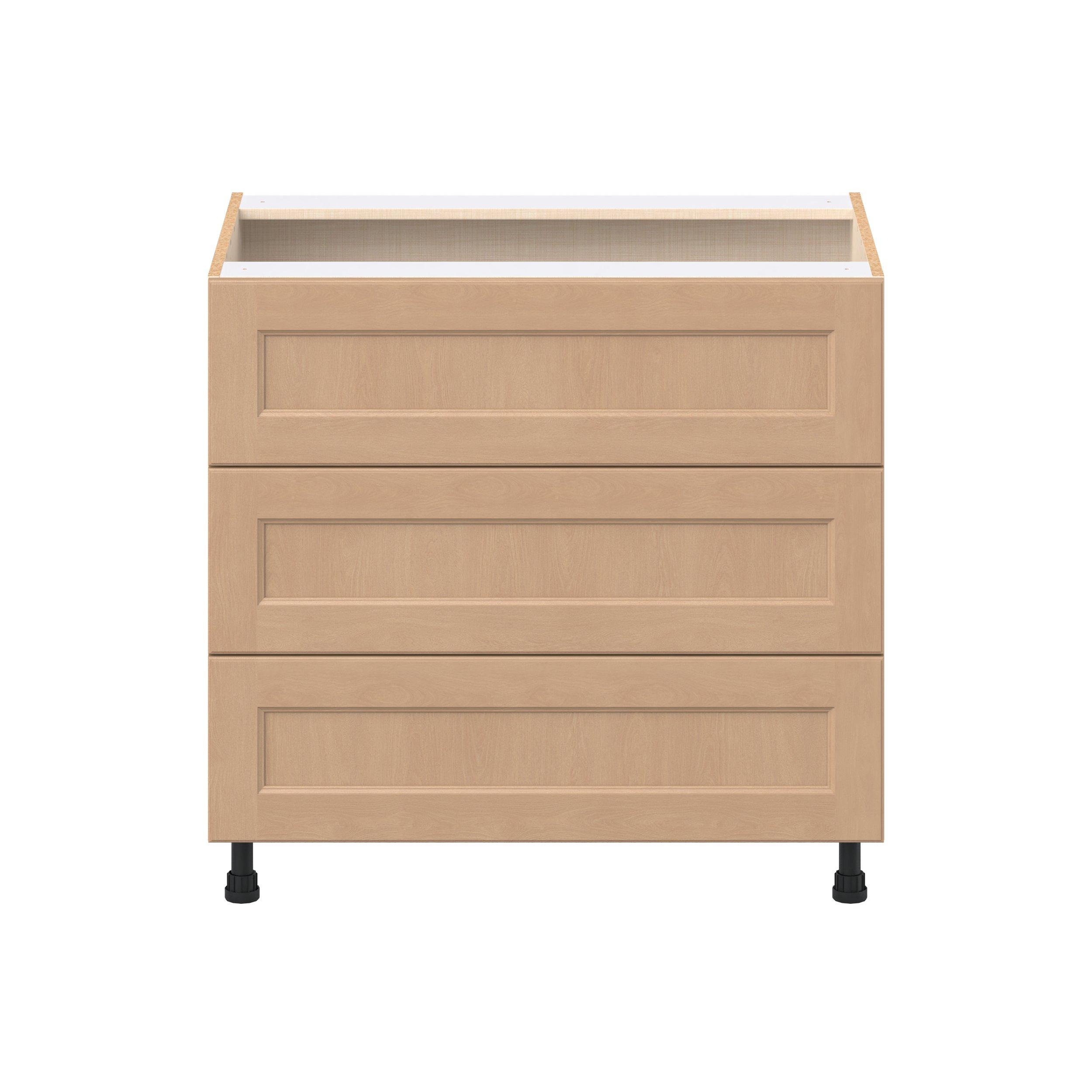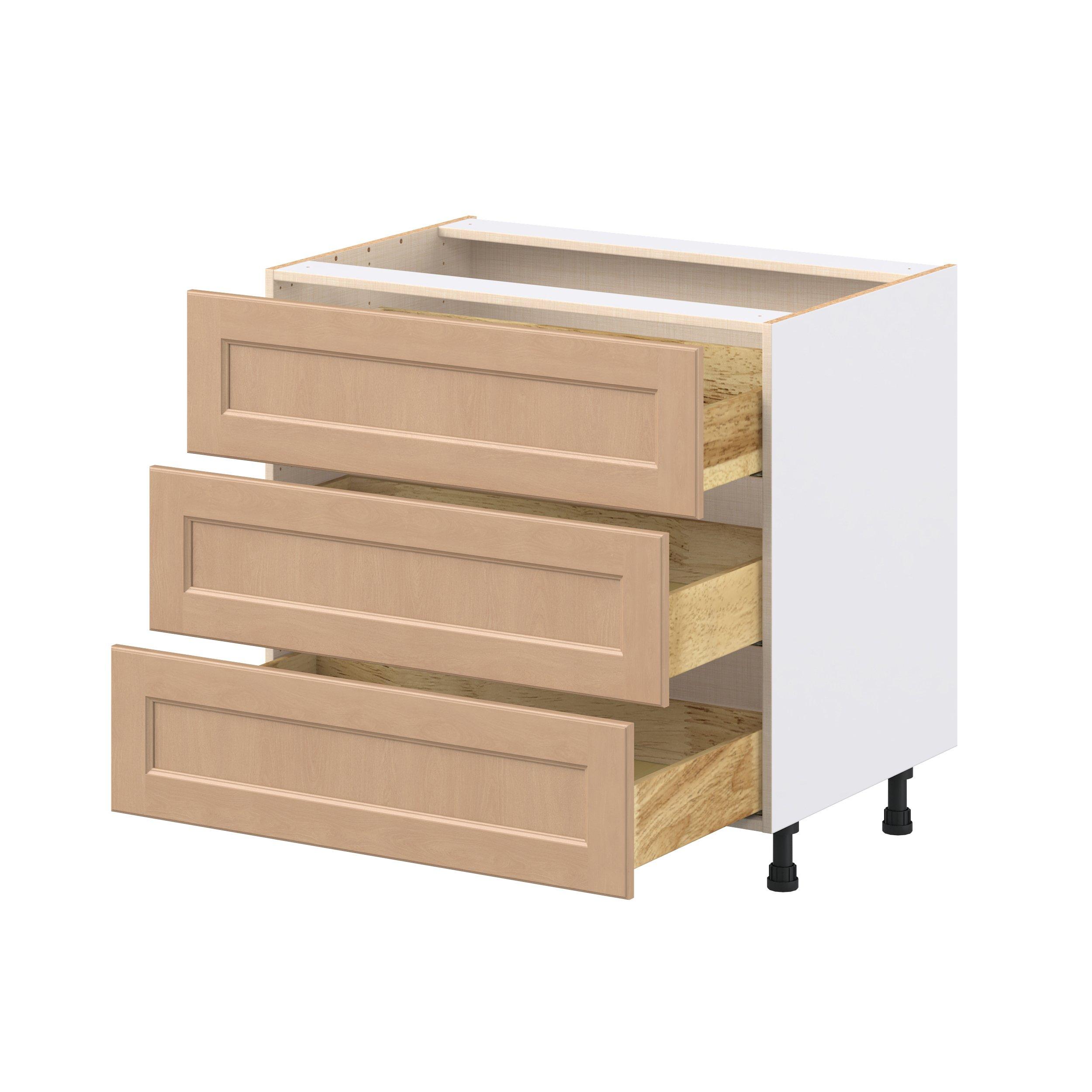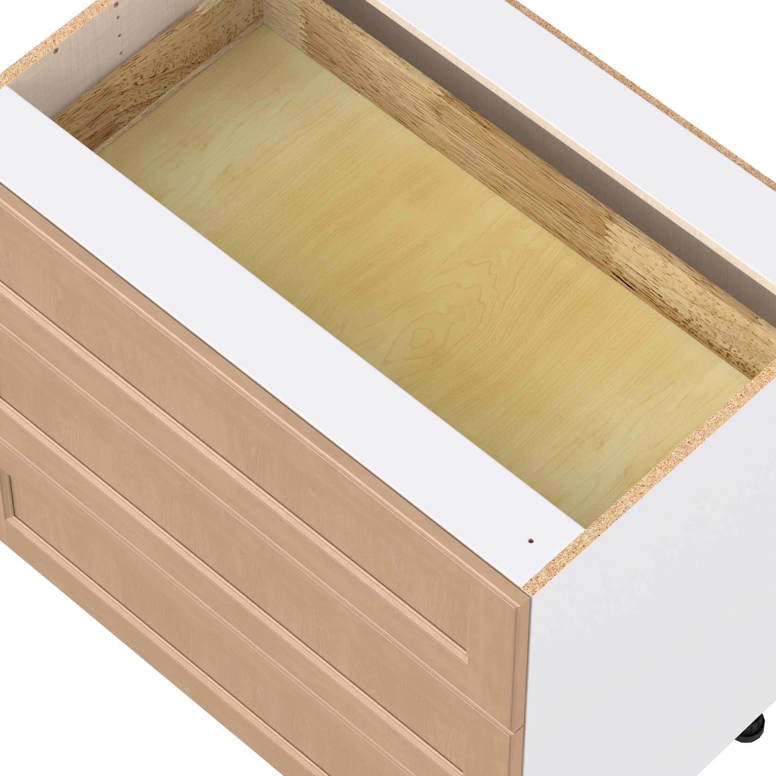Experience the striking beauty of Sugarhill wide-rail shaker-inspired cabinets. Available in a warm and light sugar cookie finish, this collection will add warmth and lasting elegance to any space. Crafted from one-piece MDF Studio Design Collection Sugarhill 36 in. Stained Sugar Cookie Drawer Base Cabinet is designed to resist hairline cracks while the easy-to-clean finish stands up to stains and moisture. Featuring 5-piece doors and dovetail drawer joints, these cabinets offer durability and elegance. This collection combines style with everyday storage solutions.