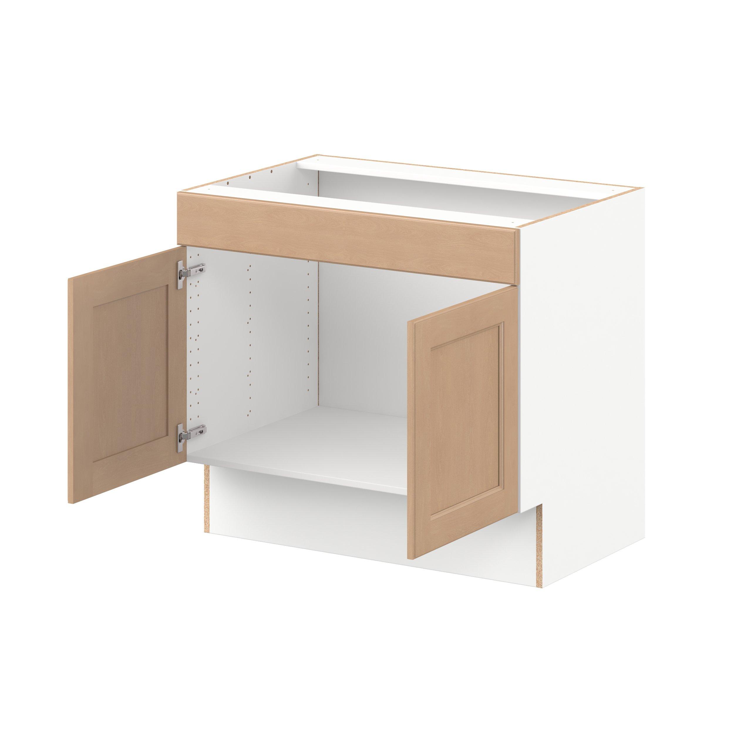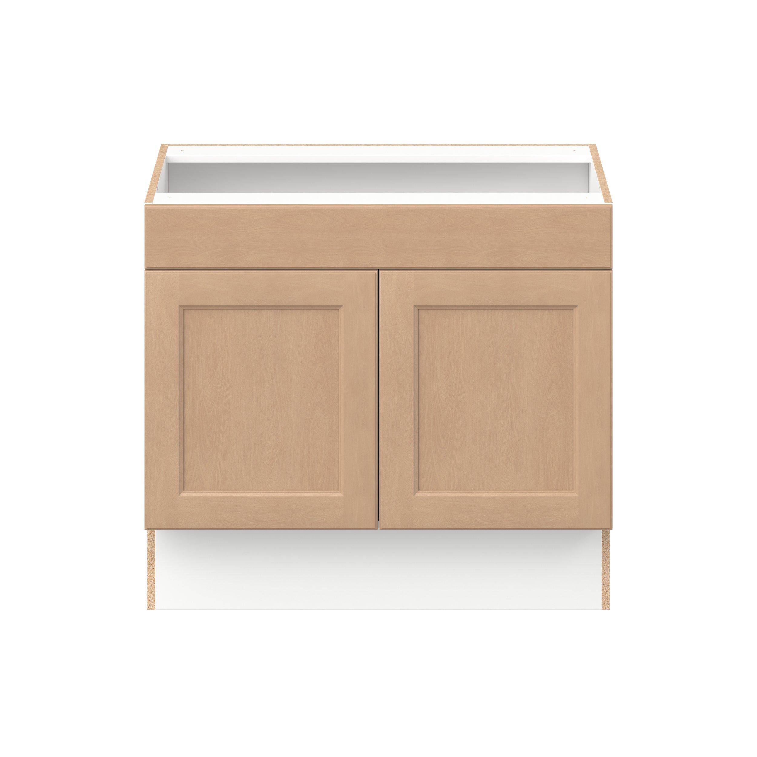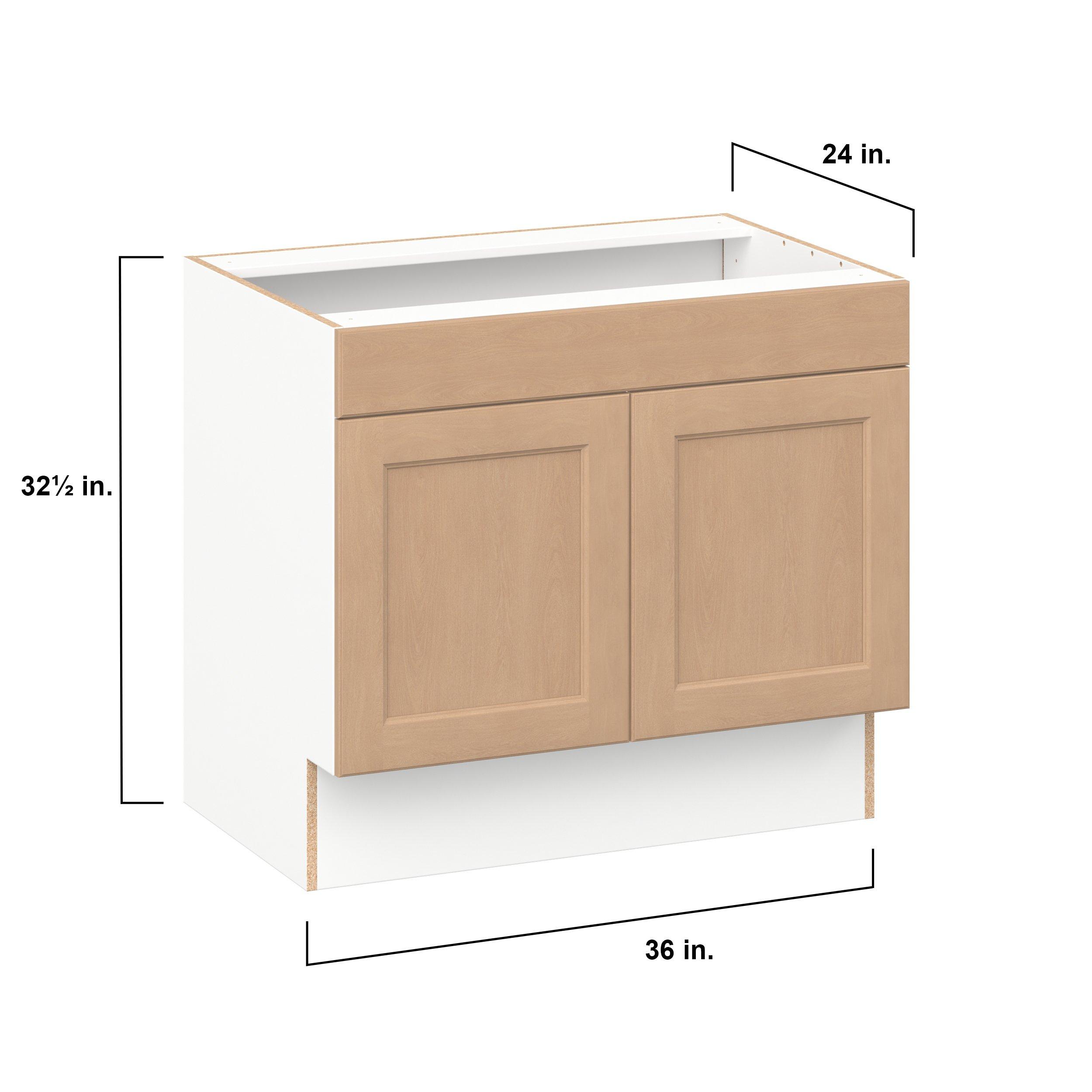 Experience the striking beauty of Sugarhill wide-rail shaker-inspired cabinets. Available in a warm and light sugar cookie finish, this collection will add warmth and lasting elegance to any space. Crafted from one-piece MDF Studio Design Collection Sugarhill 36 in. Stained Sugar Cookie Sink Base Cabinet with False Front is designed to resist hairline cracks while the easy-to-clean finish stands up to stains and moisture. Featuring 5-piece doors and dovetail drawer joints, these cabinets offer durability and elegance. This collection combines style with everyday storage solutions.