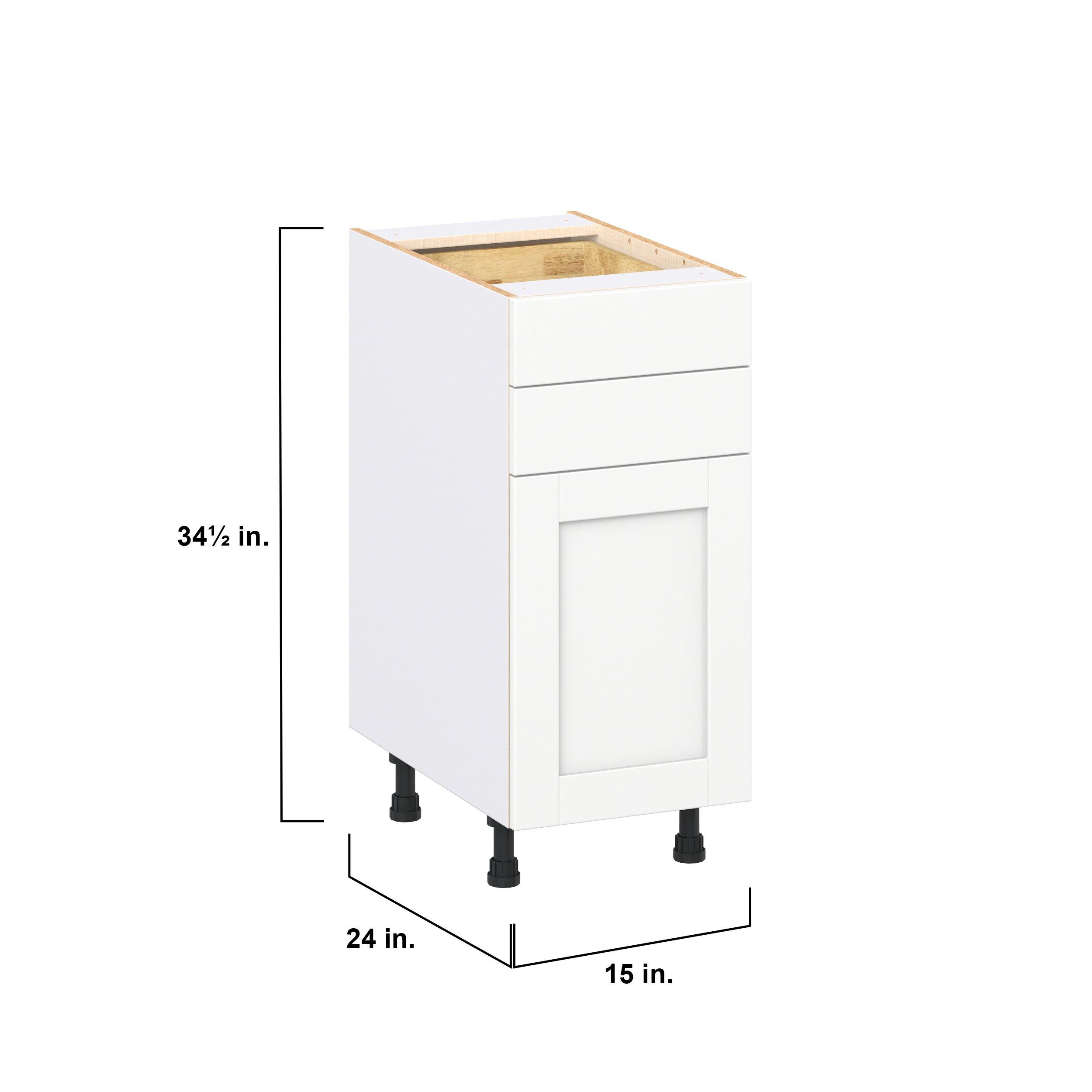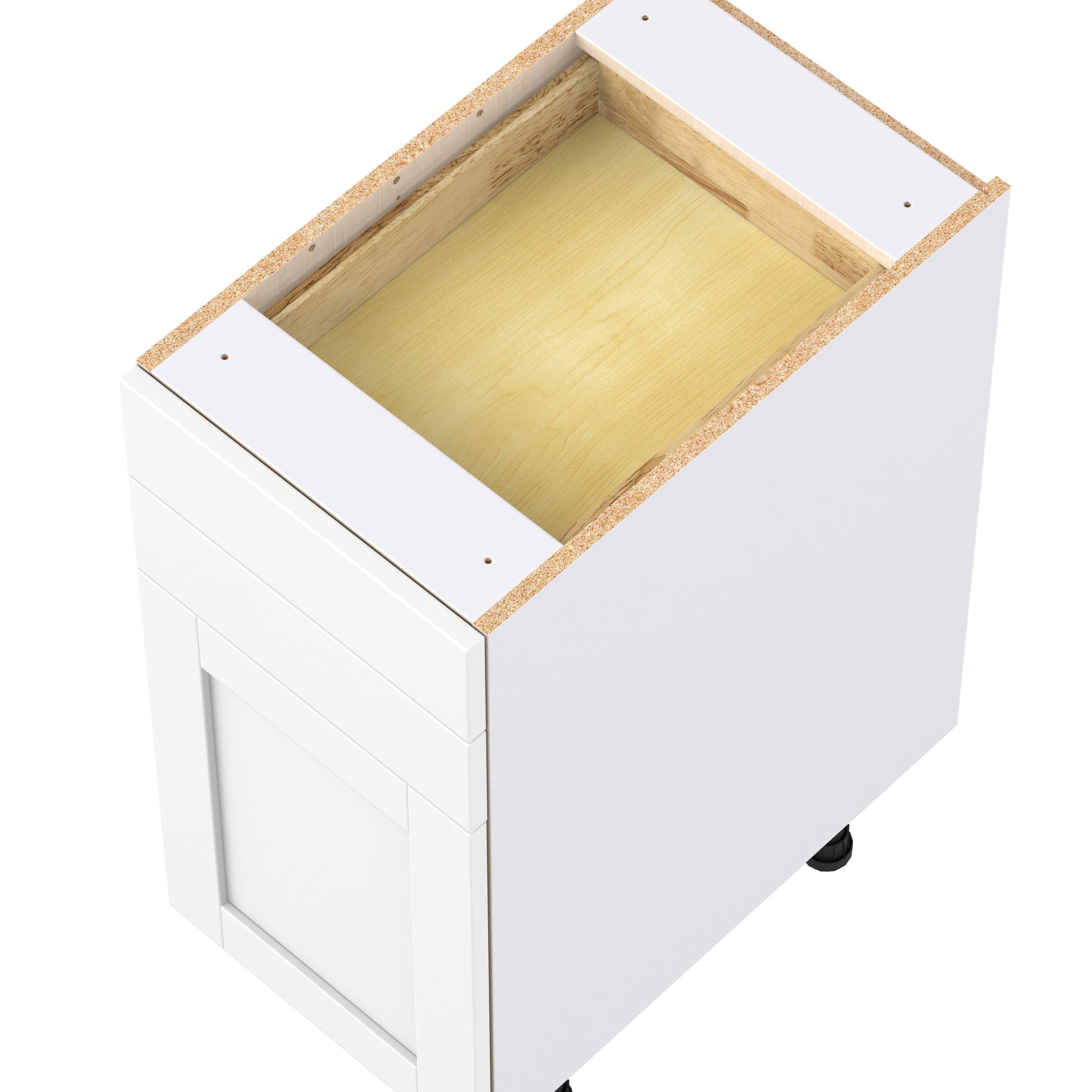 Enhance your home with the timeless beauty of Summerhill classic shaker cabinets, available in fresh bright white and neutral light gray colors. Crafted from one-piece MDF Studio Design Collection Summerhill 15 in. Bright White Door and Drawer Base Cabinet is designed to resist hairline cracks while the easy-to-clean finish stands up to stains and moisture. Featuring 5-piece doors and dovetail drawer joints, these cabinets offer durability and elegance. This collection combines style with everyday storage solutions.