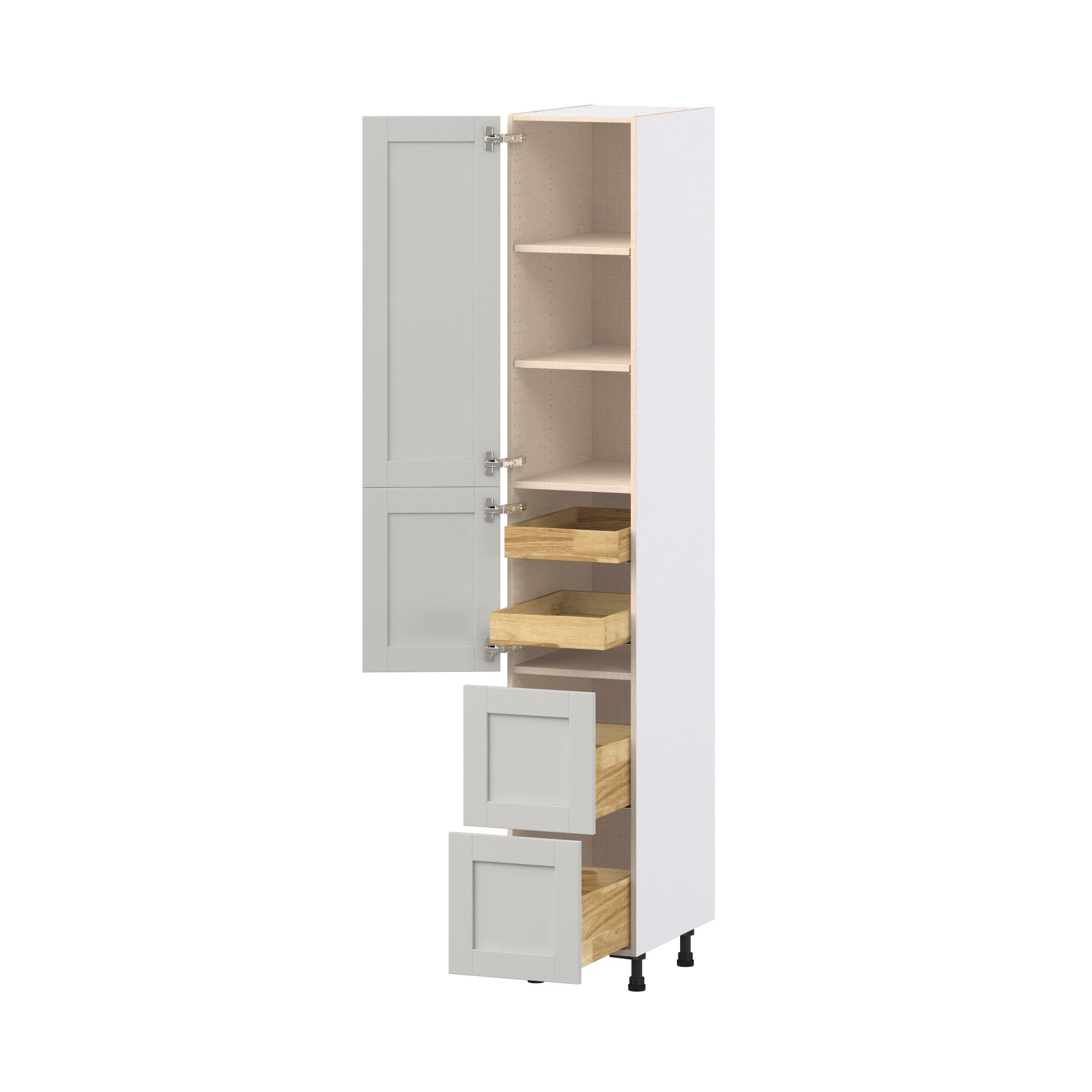 Enhance your home with the timeless beauty of Summerhill classic shaker cabinets, available in fresh bright white and neutral light gray colors. Crafted from one-piece MDF Studio Design Collection Summerhill 15 in. Light Gray Door and Drawer Pantry Cabinet with Inner Pull-Out is designed to resist hairline cracks while the easy-to-clean finish stands up to stains and moisture. Featuring 5-piece doors and dovetail drawer joints, these cabinets offer durability and elegance. This collection combines style with everyday storage solutions.