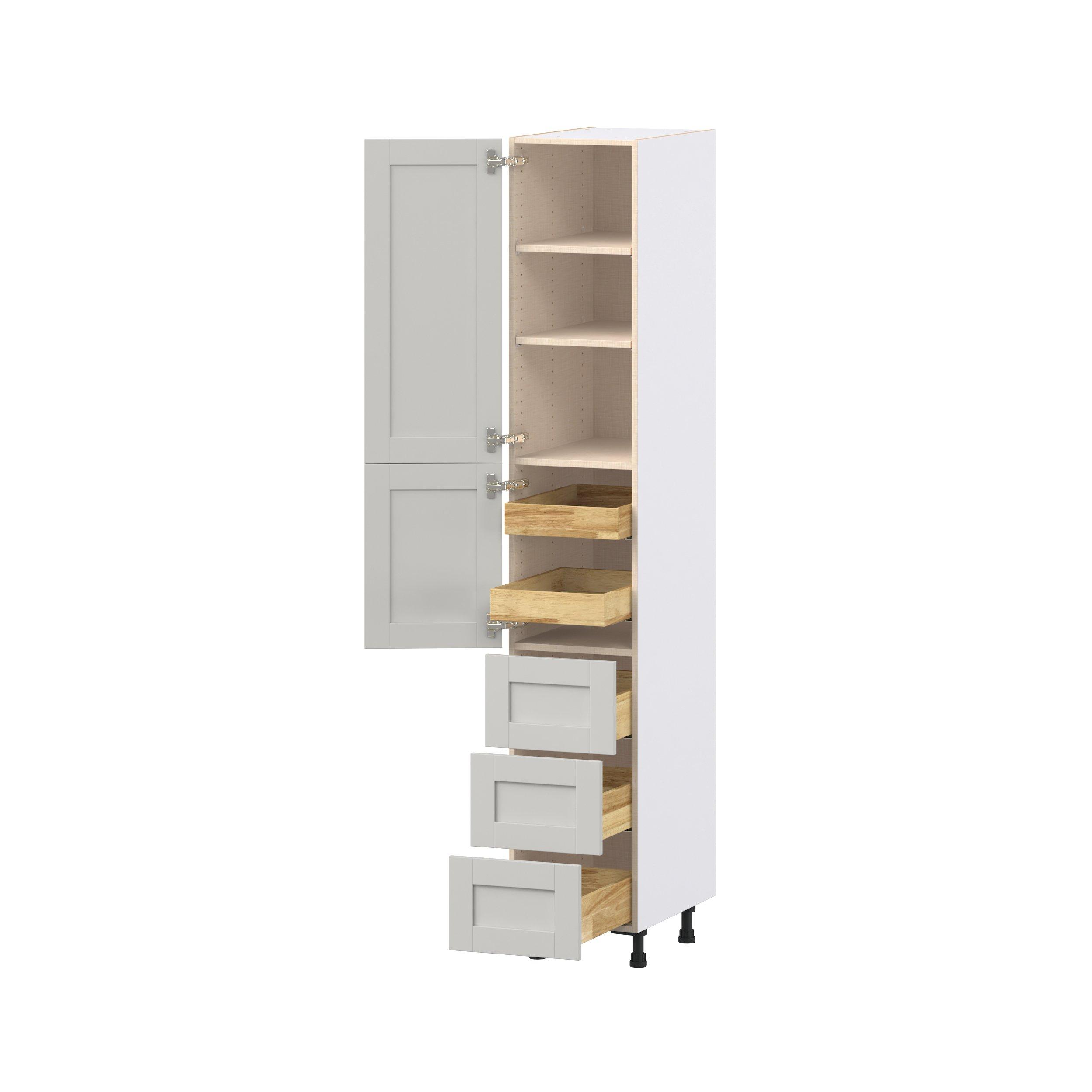 Enhance your home with the timeless beauty of Summerhill classic shaker cabinets, available in fresh bright white and neutral light gray colors. Crafted from one-piece MDF Studio Design Collection Summerhill 15 in. Light Gray Door and Drawer Pantry Cabinet with Inner Pull-Out is designed to resist hairline cracks while the easy-to-clean finish stands up to stains and moisture. Featuring 5-piece doors and dovetail drawer joints, these cabinets offer durability and elegance. This collection combines style with everyday storage solutions.