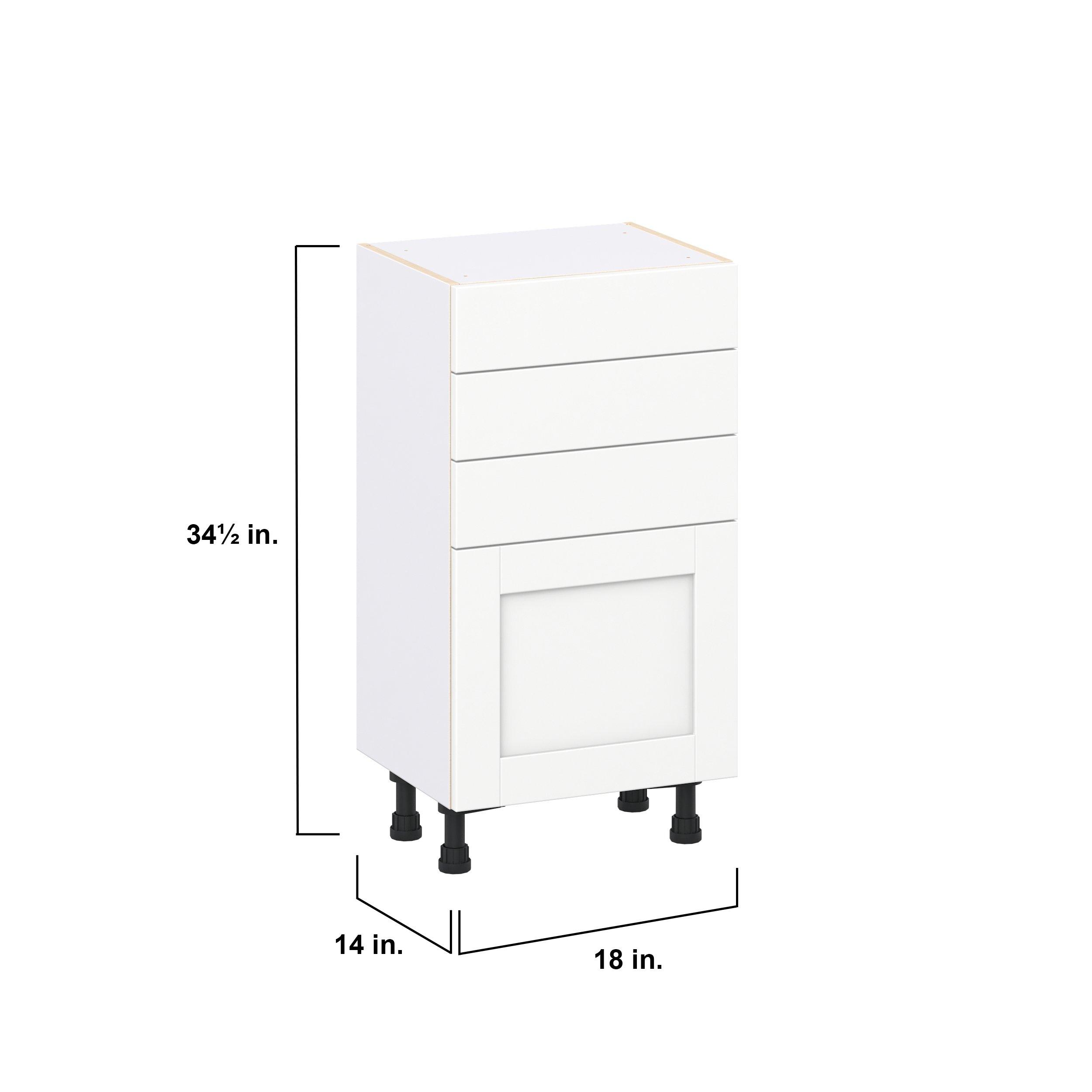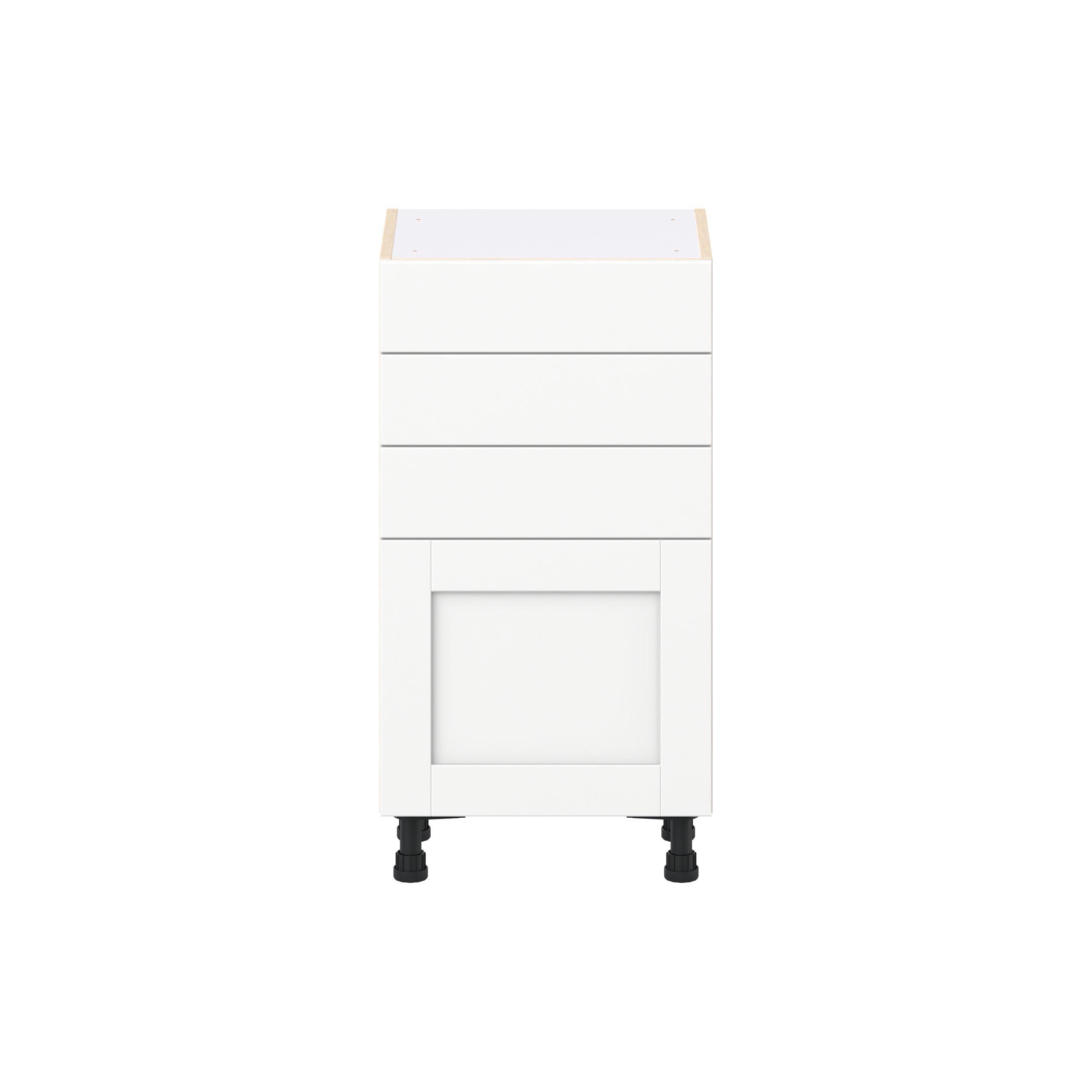Enhance your home with the timeless beauty of Summerhill classic shaker cabinets, available in fresh bright white and neutral light gray colors. Crafted from one-piece MDF Studio Design Collection Summerhill 18 in. Bright White Shallow Base Cabinet is designed to resist hairline cracks while the easy-to-clean finish stands up to stains and moisture. Featuring 5-piece doors and dovetail drawer joints, these cabinets offer durability and elegance. This collection combines style with everyday storage solutions.