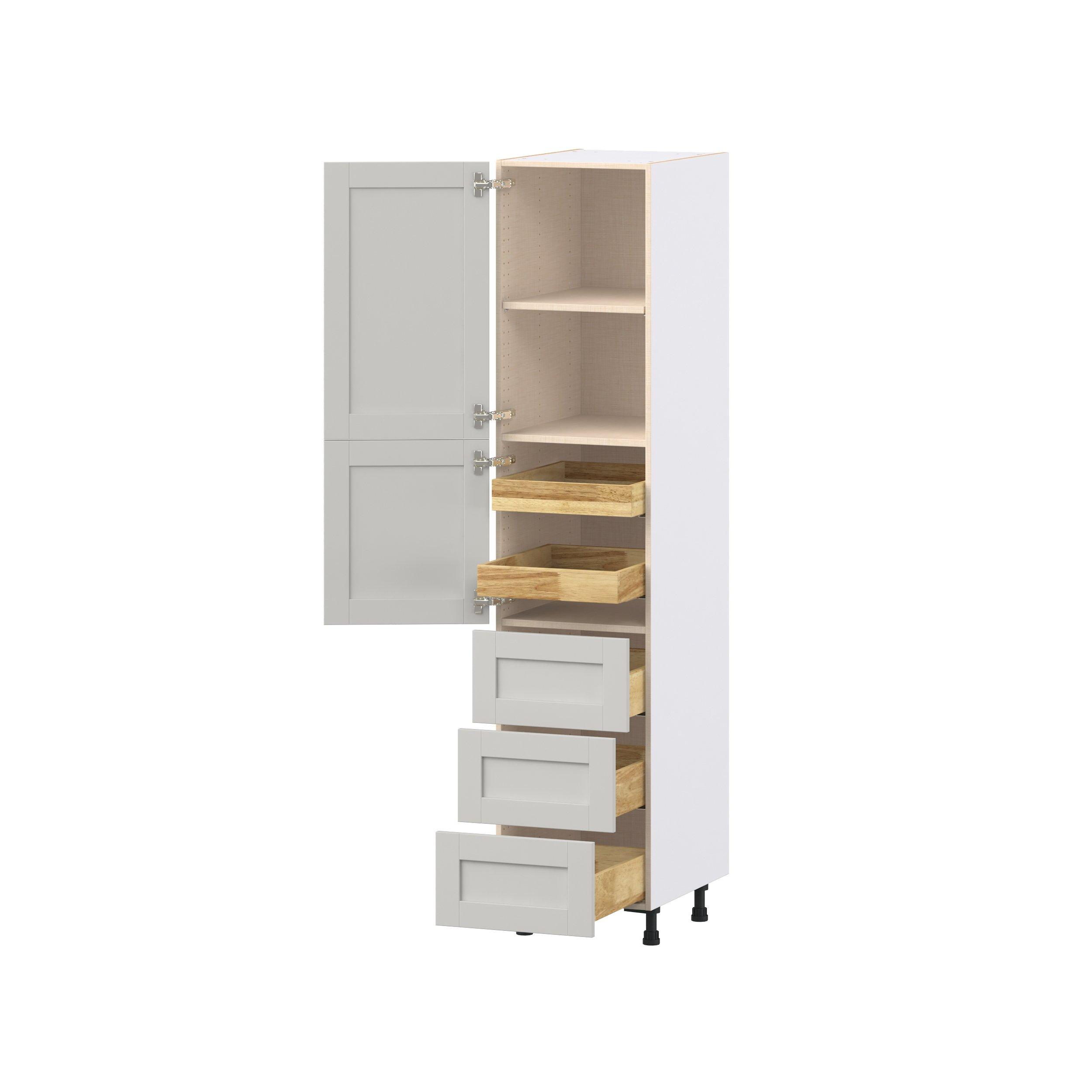 Enhance your home with the timeless beauty of Summerhill classic shaker cabinets, available in fresh bright white and neutral light gray colors. Crafted from one-piece MDF Studio Design Collection Summerhill 18 in. Light Gray Door and Drawer Pantry Cabinet with Inner Pull-Out is designed to resist hairline cracks while the easy-to-clean finish stands up to stains and moisture. Featuring 5-piece doors and dovetail drawer joints, these cabinets offer durability and elegance. This collection combines style with everyday storage solutions.