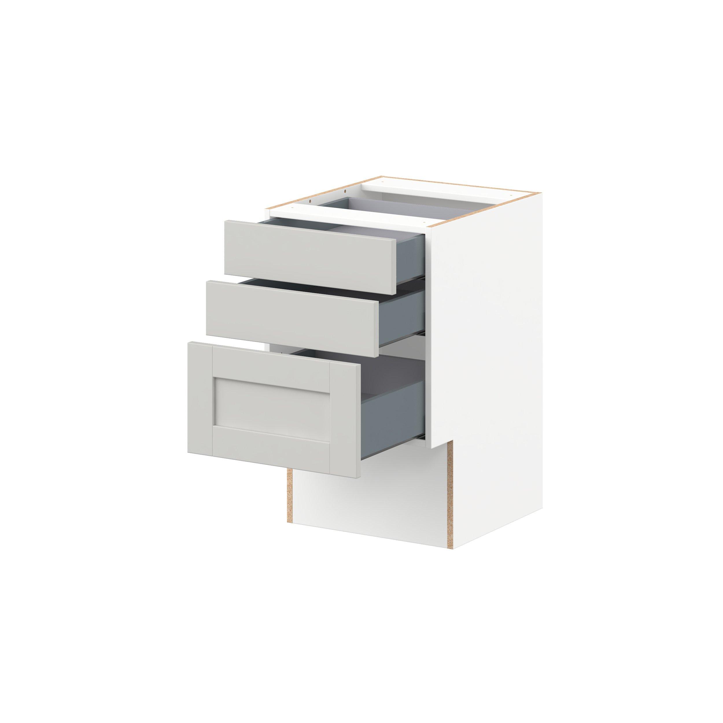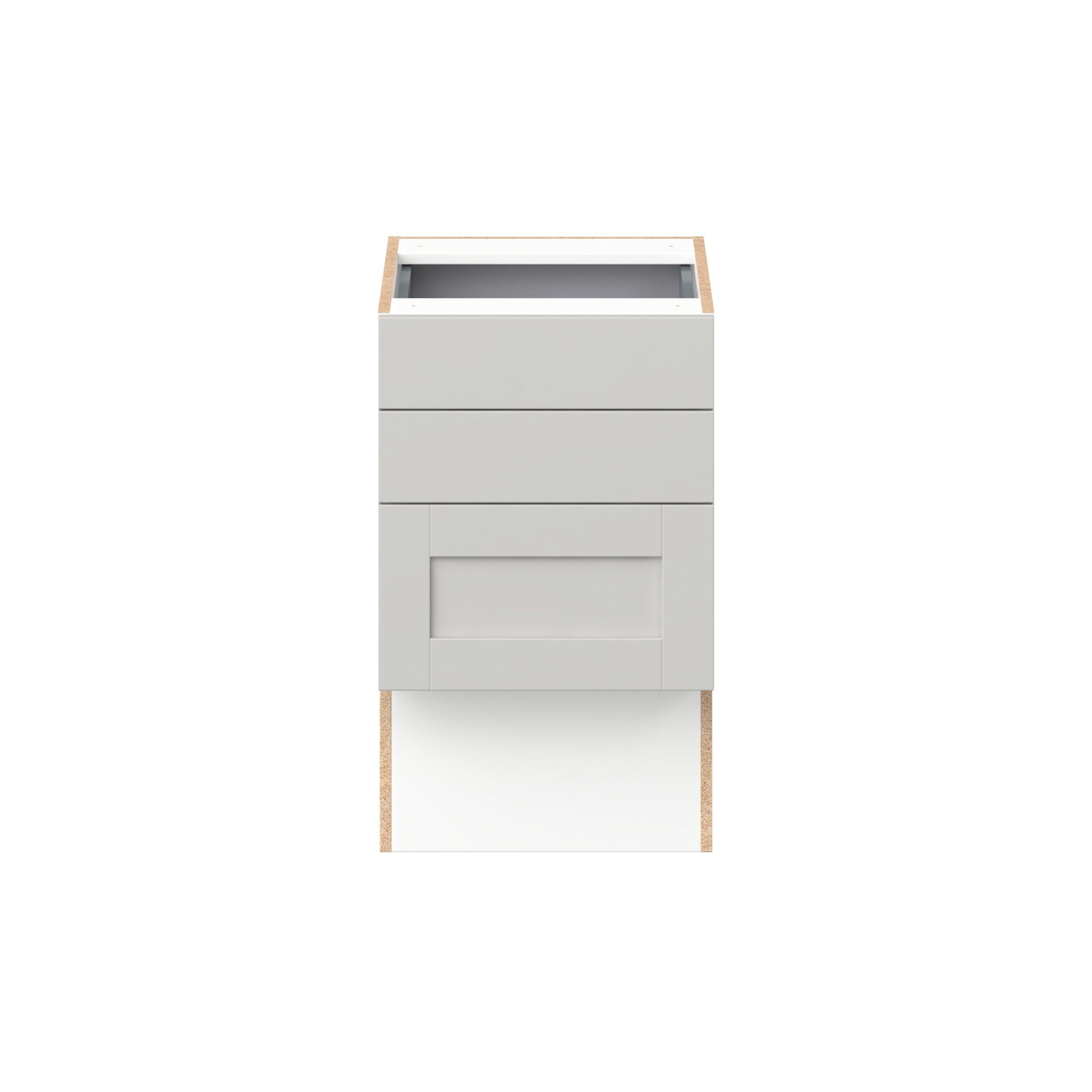 Enhance your home with the timeless beauty of Summerhill classic shaker cabinets, available in fresh bright white and neutral light gray colors. Crafted from one-piece MDF Studio Design Collection Summerhill 18 in. Light Gray Vanity Drawer Base Cabinet is designed to resist hairline cracks while the easy-to-clean finish stands up to stains and moisture. Featuring 5-piece doors and dovetail drawer joints, these cabinets offer durability and elegance. This collection combines style with everyday storage solutions.