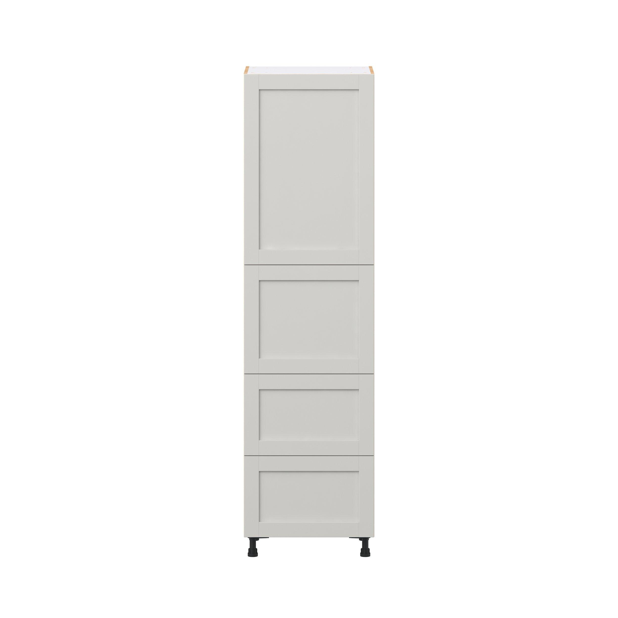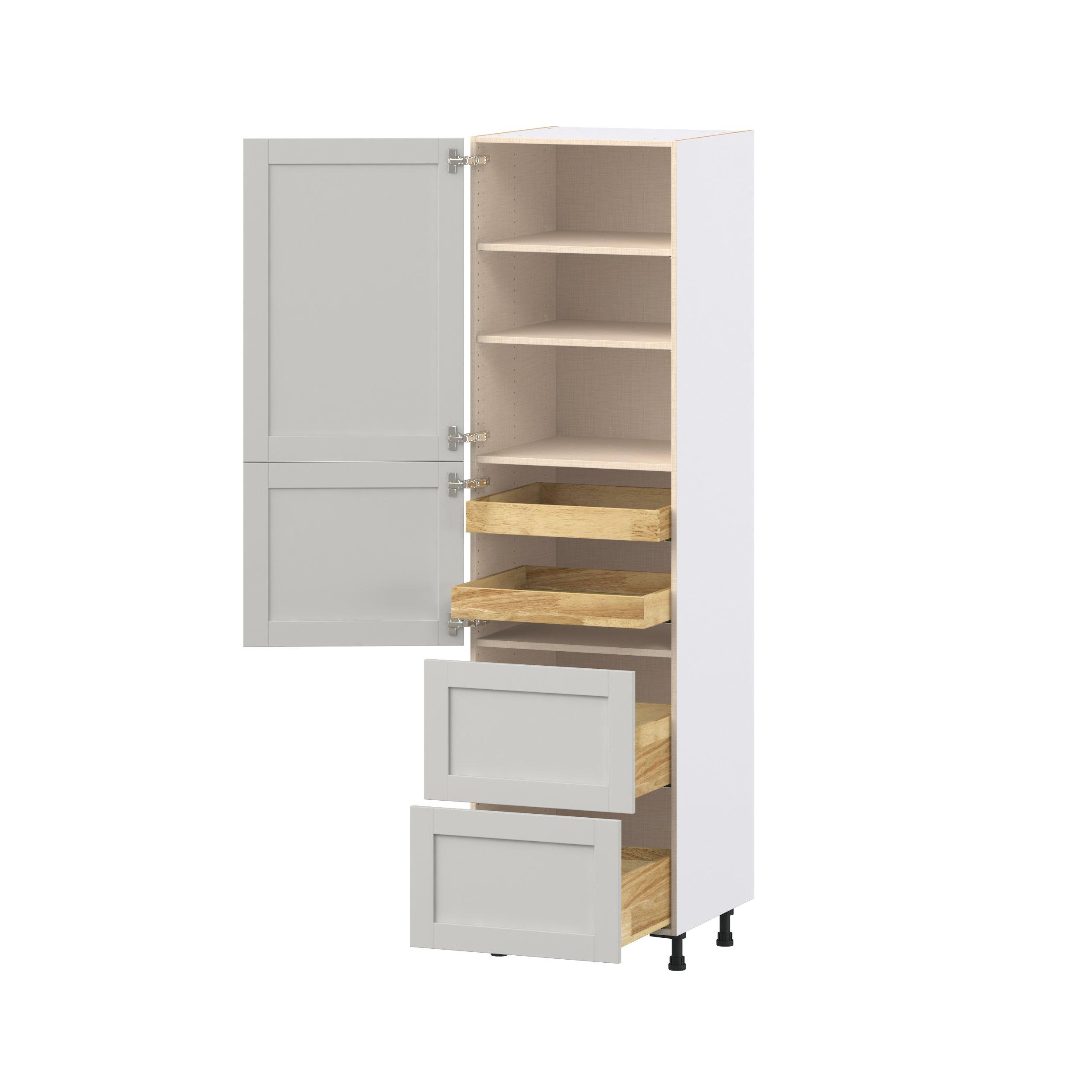 Enhance your home with the timeless beauty of Summerhill classic shaker cabinets, available in fresh bright white and neutral light gray colors. Crafted from one-piece MDF Studio Design Collection Summerhill 24 in. Light Gray Door and Drawer Pantry Cabinet with Inner Pull-Out is designed to resist hairline cracks while the easy-to-clean finish stands up to stains and moisture. Featuring 5-piece doors and dovetail drawer joints, these cabinets offer durability and elegance. This collection combines style with everyday storage solutions.