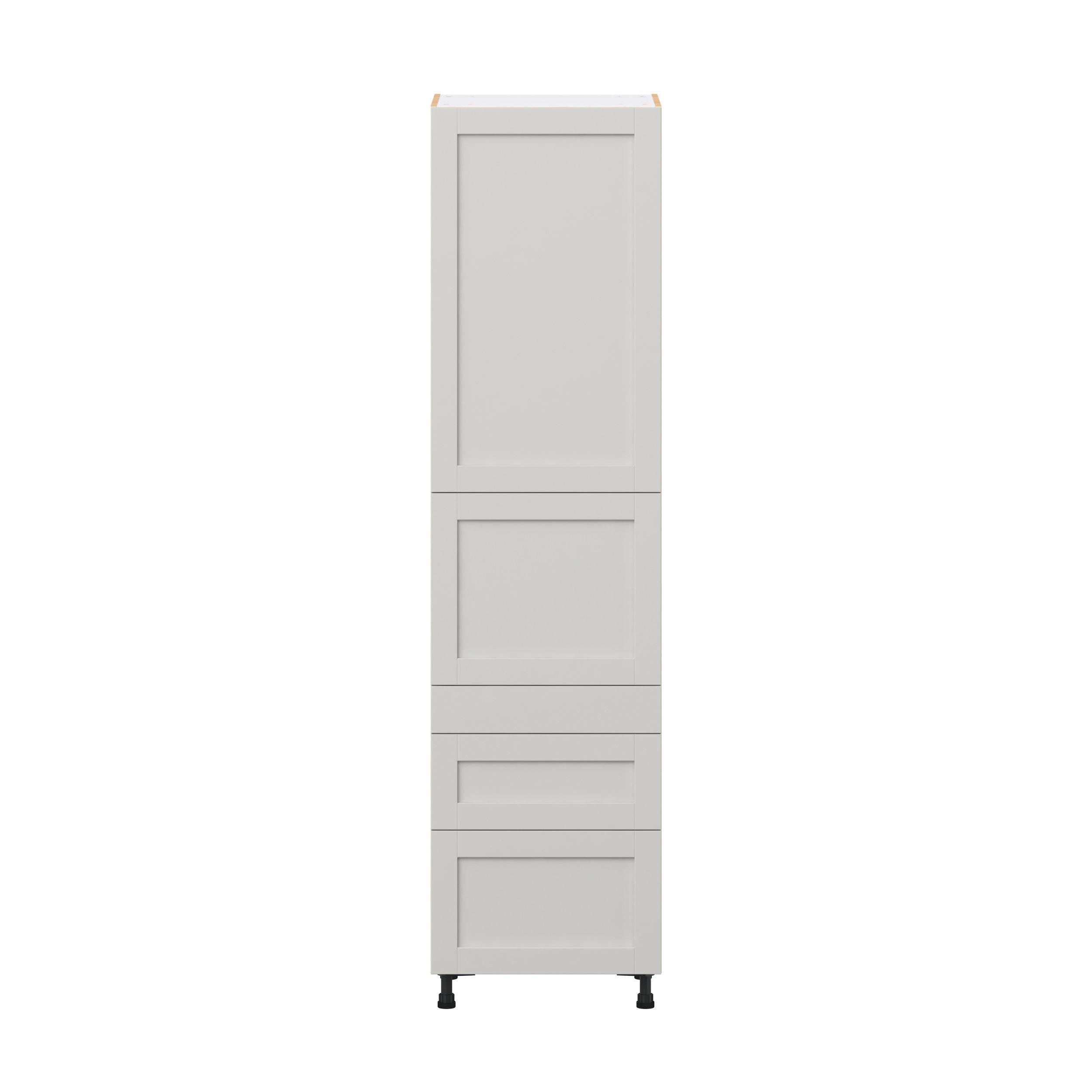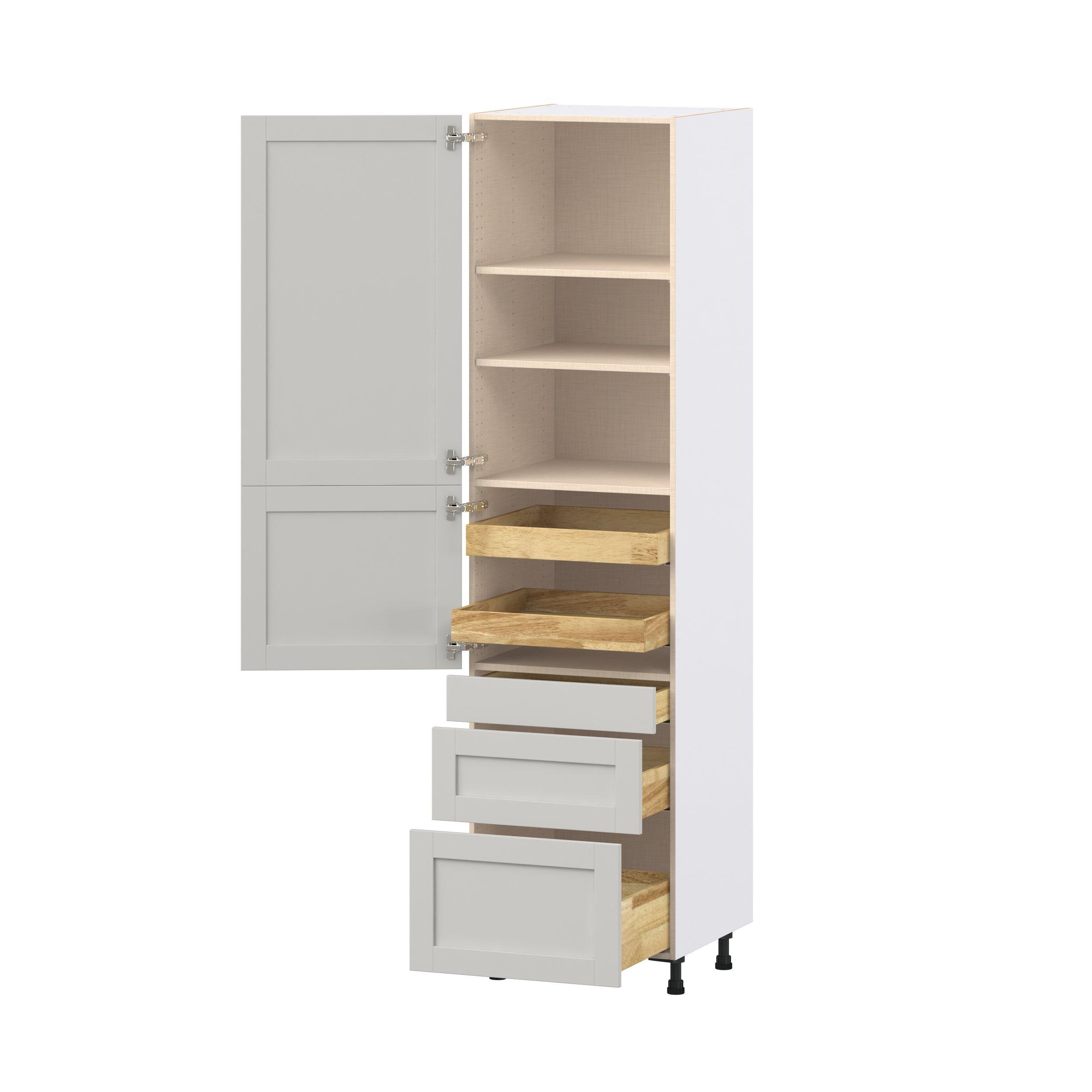 Enhance your home with the timeless beauty of Summerhill classic shaker cabinets, available in fresh bright white and neutral light gray colors. Crafted from one-piece MDF Studio Design Collection Summerhill 24 in. Light Gray Door and Drawer Pantry Cabinet with Inner Pull-Out is designed to resist hairline cracks while the easy-to-clean finish stands up to stains and moisture. Featuring 5-piece doors and dovetail drawer joints, these cabinets offer durability and elegance. This collection combines style with everyday storage solutions.