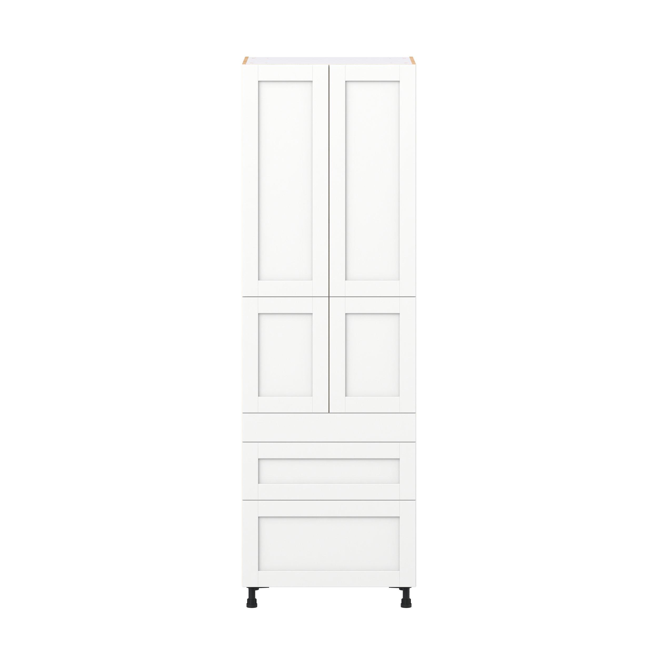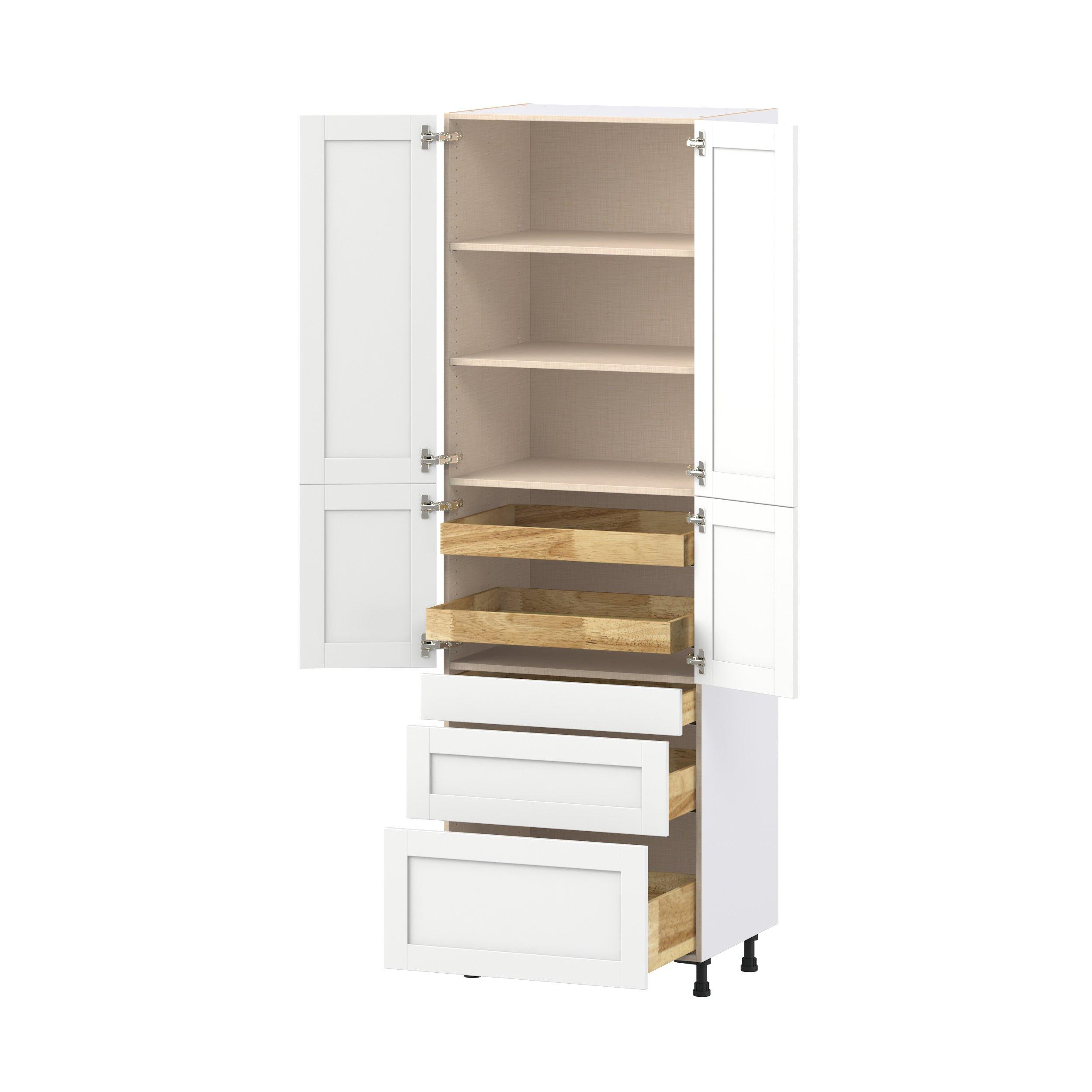 Enhance your home with the timeless beauty of Summerhill classic shaker cabinets, available in fresh bright white and neutral light gray colors. Crafted from one-piece MDF Studio Design Collection Summerhill 30 in. Bright White Door and Drawer Pantry Cabinet with Inner Pull-Out is designed to resist hairline cracks while the easy-to-clean finish stands up to stains and moisture. Featuring 5-piece doors and dovetail drawer joints, these cabinets offer durability and elegance. This collection combines style with everyday storage solutions.
