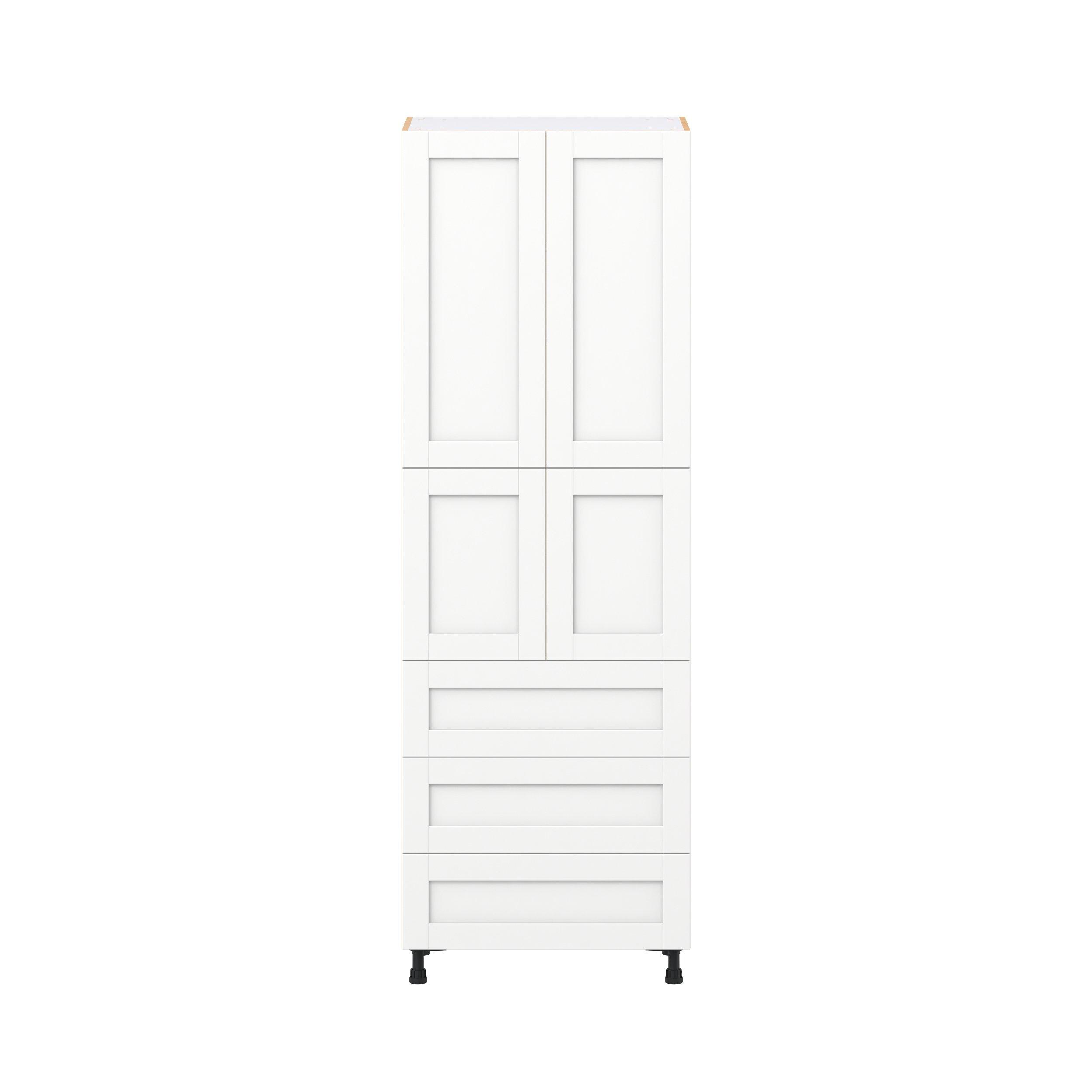 Enhance your home with the timeless beauty of Summerhill classic shaker cabinets, available in fresh bright white and neutral light gray colors. Crafted from one-piece MDF Studio Design Collection Summerhill 30 in. Bright White Door and Drawer Pantry Cabinet with Inner Pull-Out is designed to resist hairline cracks while the easy-to-clean finish stands up to stains and moisture. Featuring 5-piece doors and dovetail drawer joints, these cabinets offer durability and elegance. This collection combines style with everyday storage solutions.
