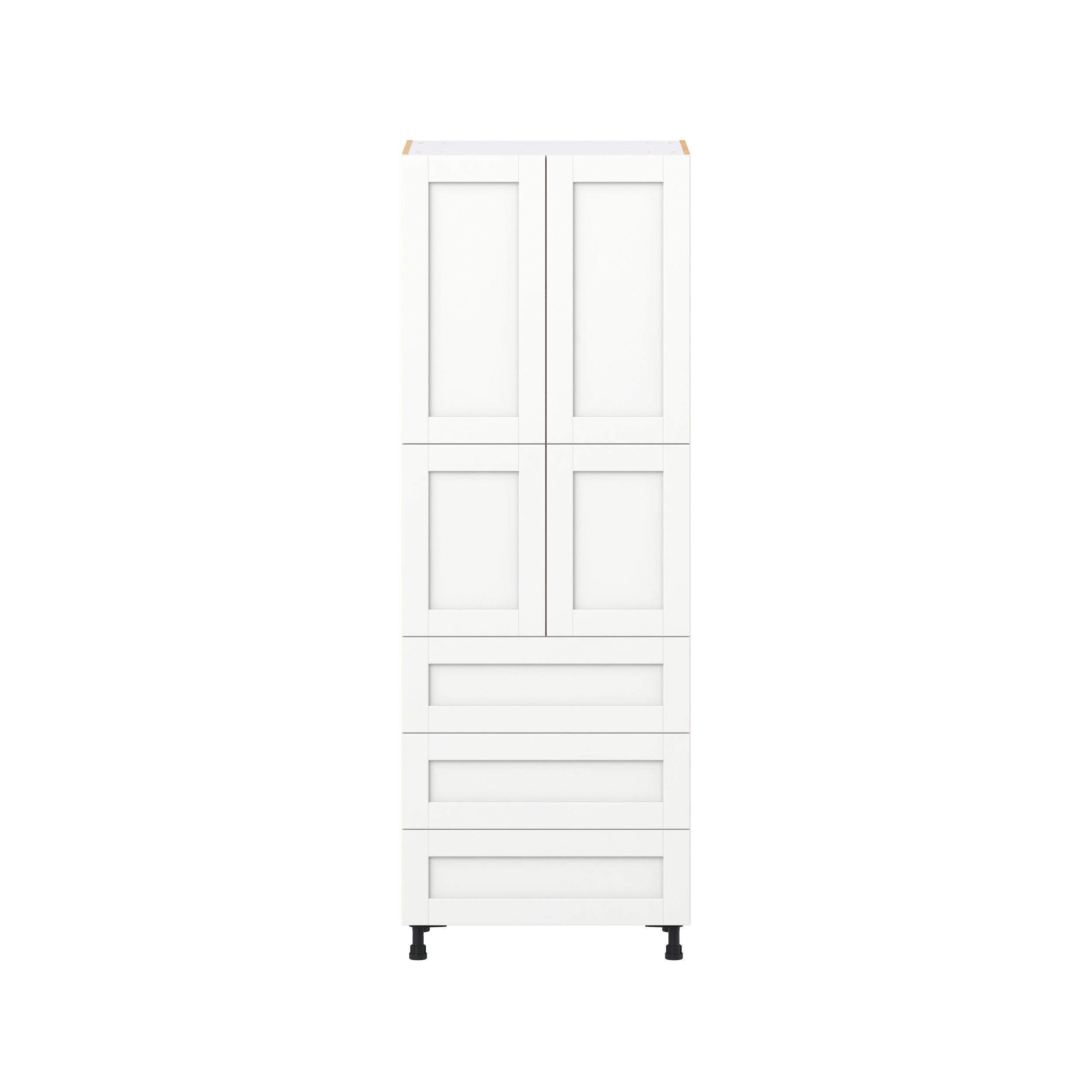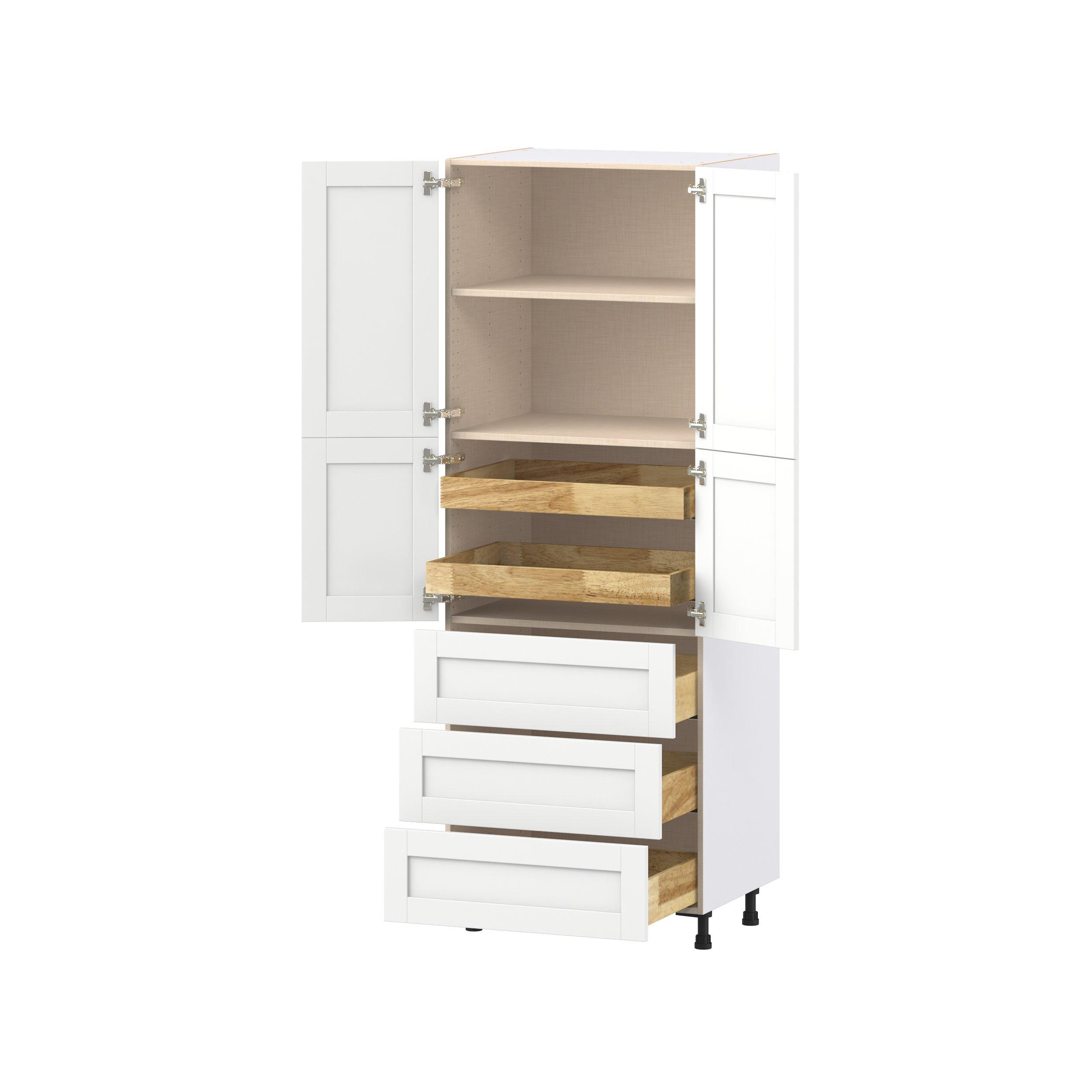 Enhance your home with the timeless beauty of Summerhill classic shaker cabinets, available in fresh bright white and neutral light gray colors. Crafted from one-piece MDF Studio Design Collection Summerhill 30 in. Bright White Door and Drawer Pantry Cabinet with Inner Pull-Out is designed to resist hairline cracks while the easy-to-clean finish stands up to stains and moisture. Featuring 5-piece doors and dovetail drawer joints, these cabinets offer durability and elegance. This collection combines style with everyday storage solutions.