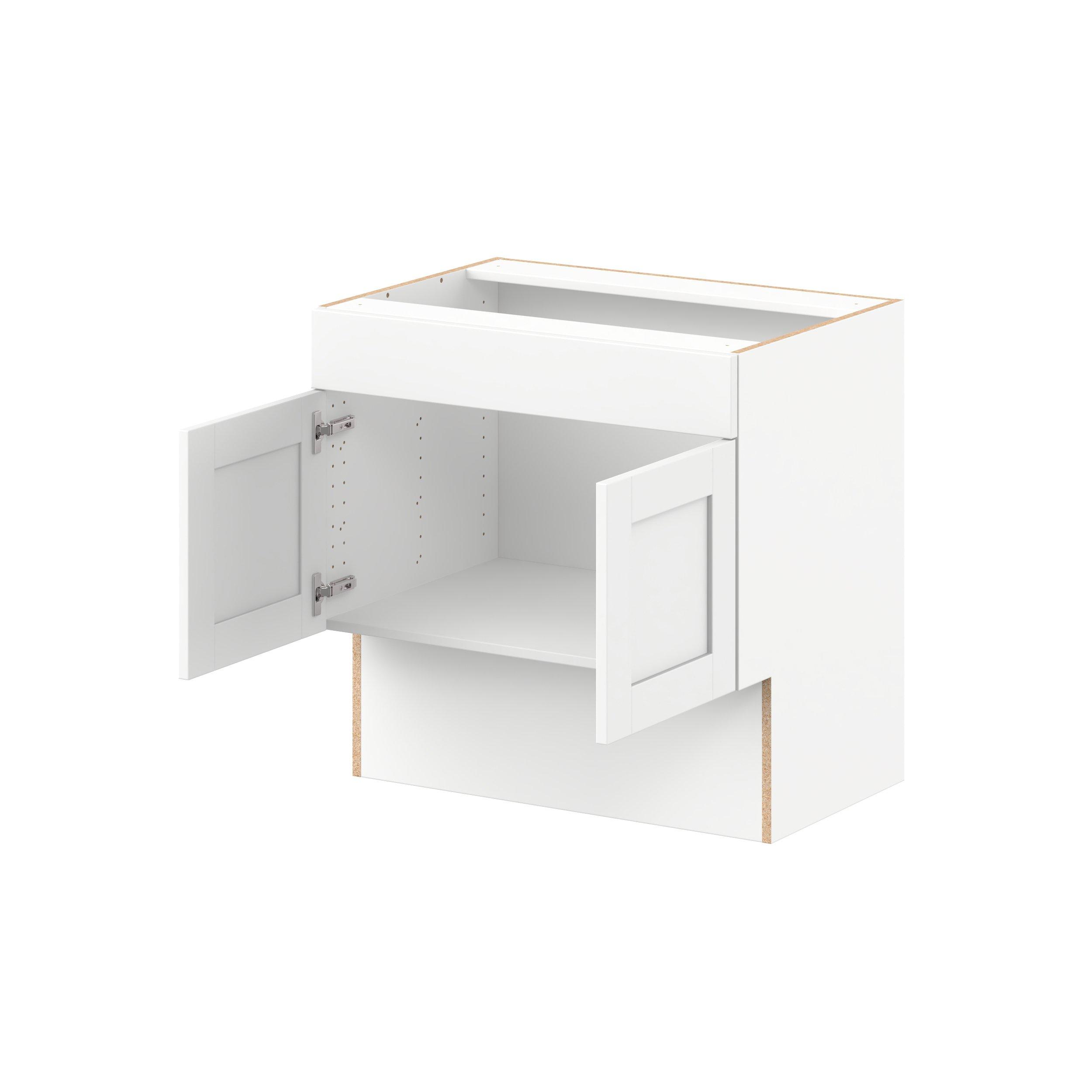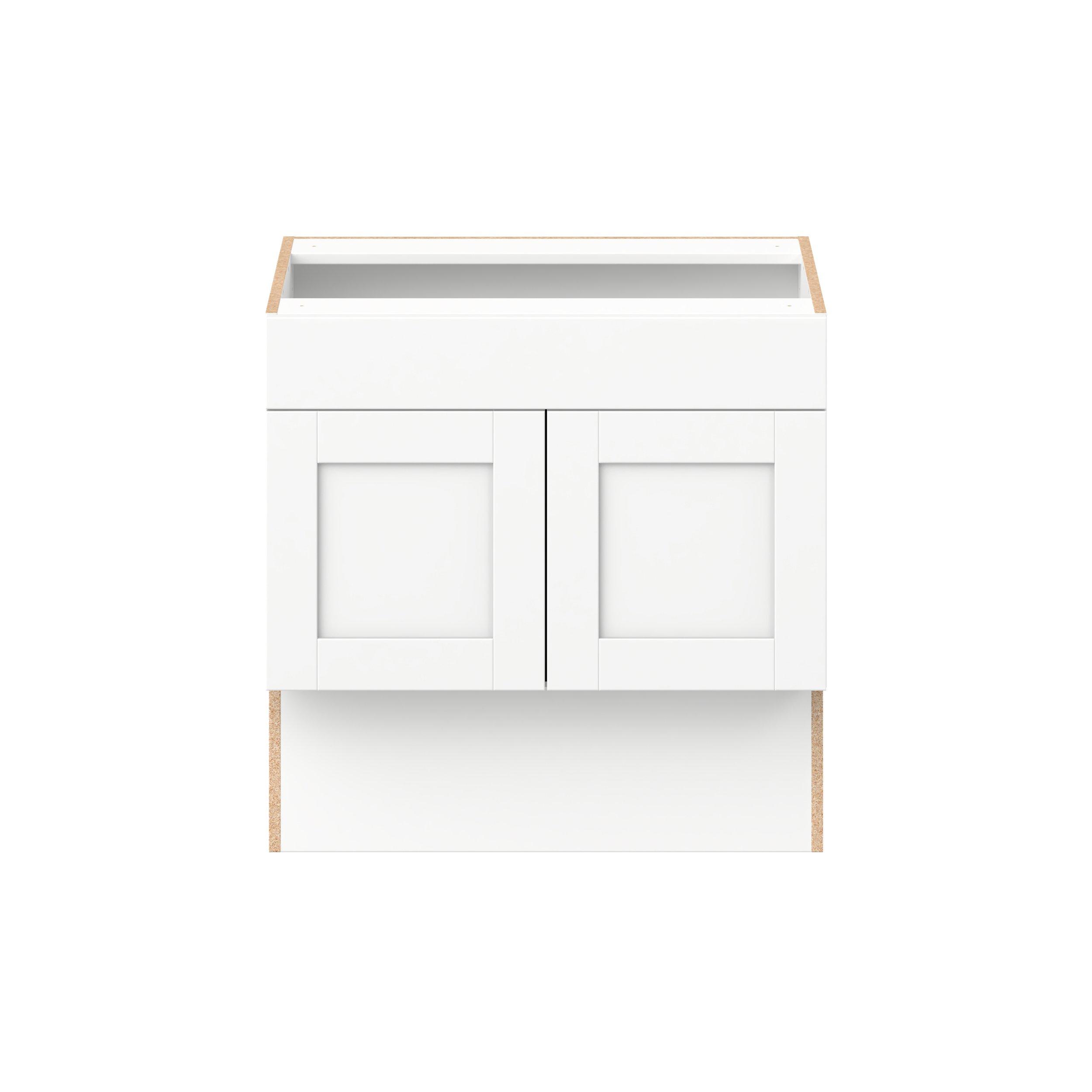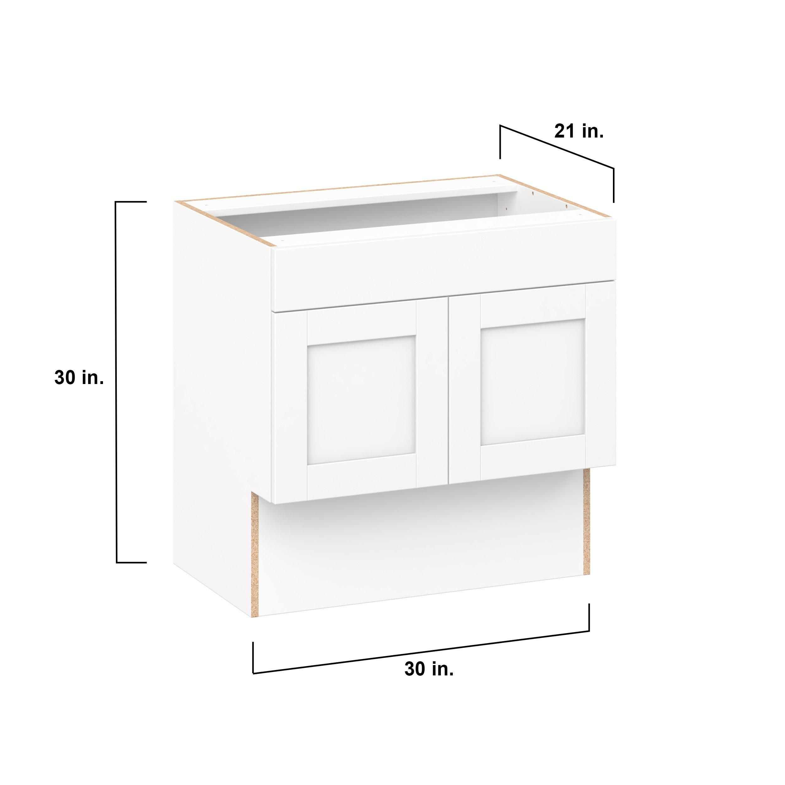Enhance your home with the timeless beauty of Summerhill classic shaker cabinets, available in fresh bright white and neutral light gray colors. Crafted from one-piece MDF Studio Design Collection Summerhill 30 in. Bright White Vanity Sink Base Cabinet with False Front is designed to resist hairline cracks while the easy-to-clean finish stands up to stains and moisture. Featuring 5-piece doors and dovetail drawer joints, these cabinets offer durability and elegance. This collection combines style with everyday storage solutions.