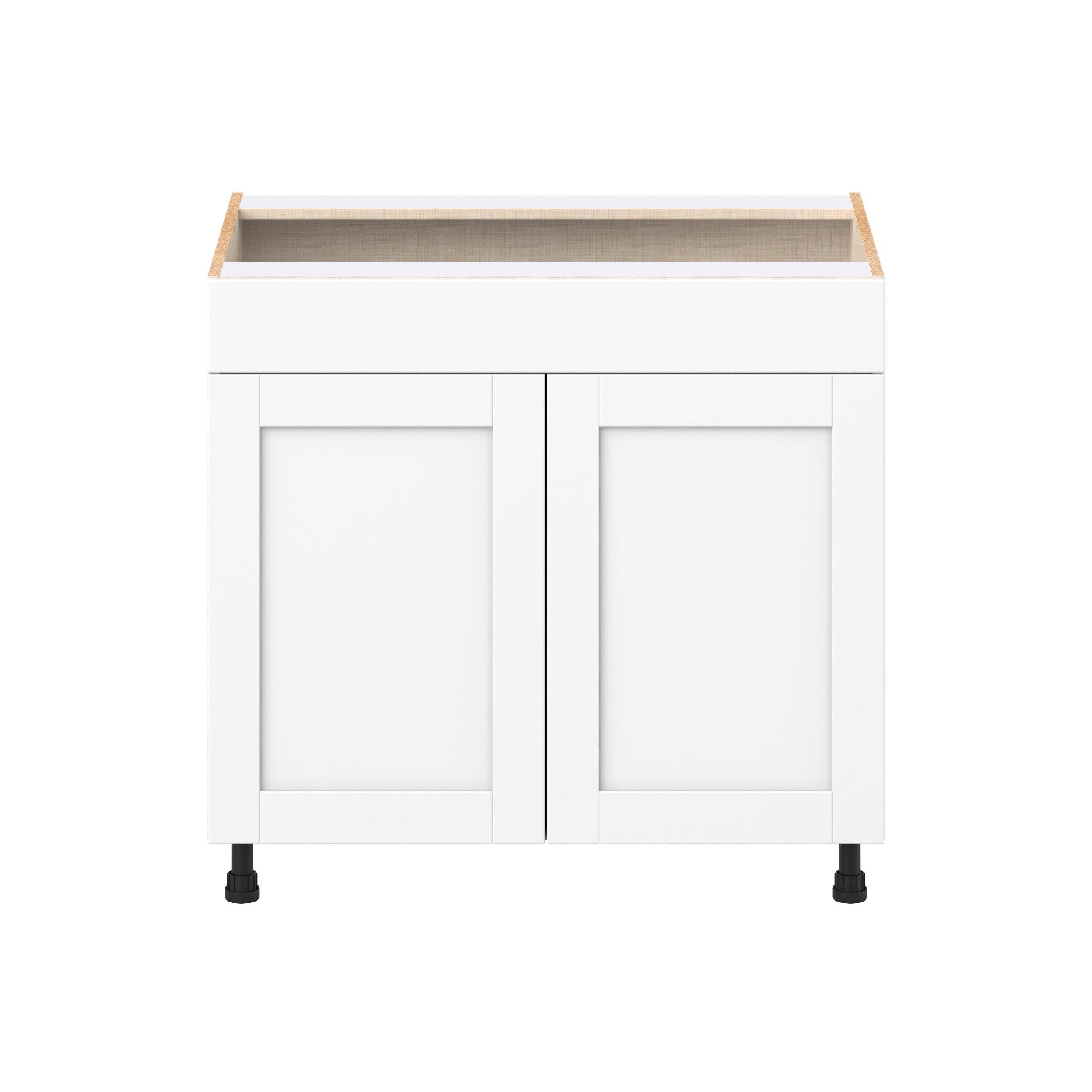 Enhance your home with the timeless beauty of Summerhill classic shaker cabinets, available in fresh bright white and neutral light gray colors. Crafted from one-piece MDF Studio Design Collection Summerhill 36 in. Bright White Sink Base Cabinet with False Front is designed to resist hairline cracks while the easy-to-clean finish stands up to stains and moisture. Featuring 5-piece doors and dovetail drawer joints, these cabinets offer durability and elegance. This collection combines style with everyday storage solutions.