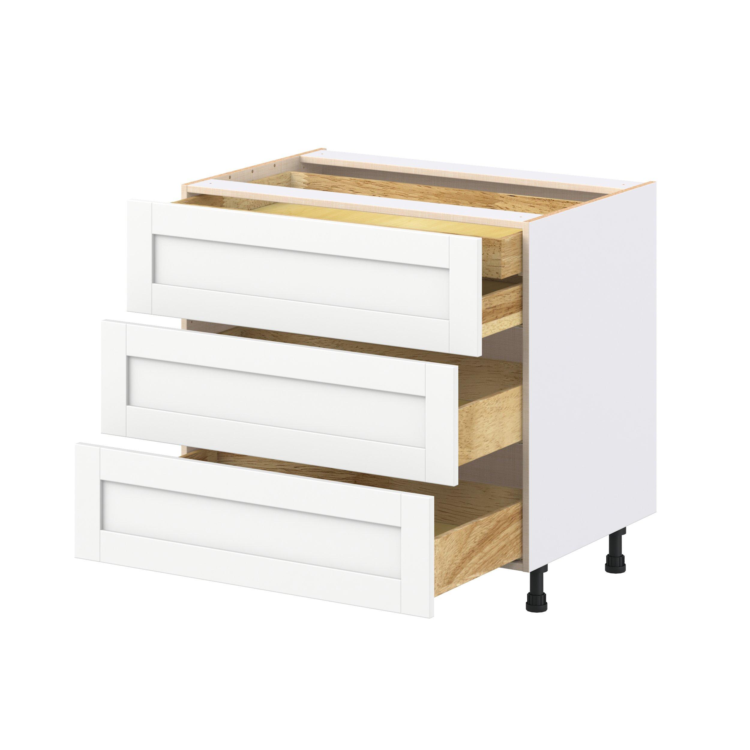 Enhance your home with the timeless beauty of Summerhill classic shaker cabinets, available in fresh bright white and neutral light gray colors. Crafted from one-piece MDF Studio Design Collection Summerhill 36 in. Bright White Base Cabinet with Inner Pull-Out Drawer is designed to resist hairline cracks while the easy-to-clean finish stands up to stains and moisture. Featuring 5-piece doors and dovetail drawer joints, these cabinets offer durability and elegance. This collection combines style with everyday storage solutions.