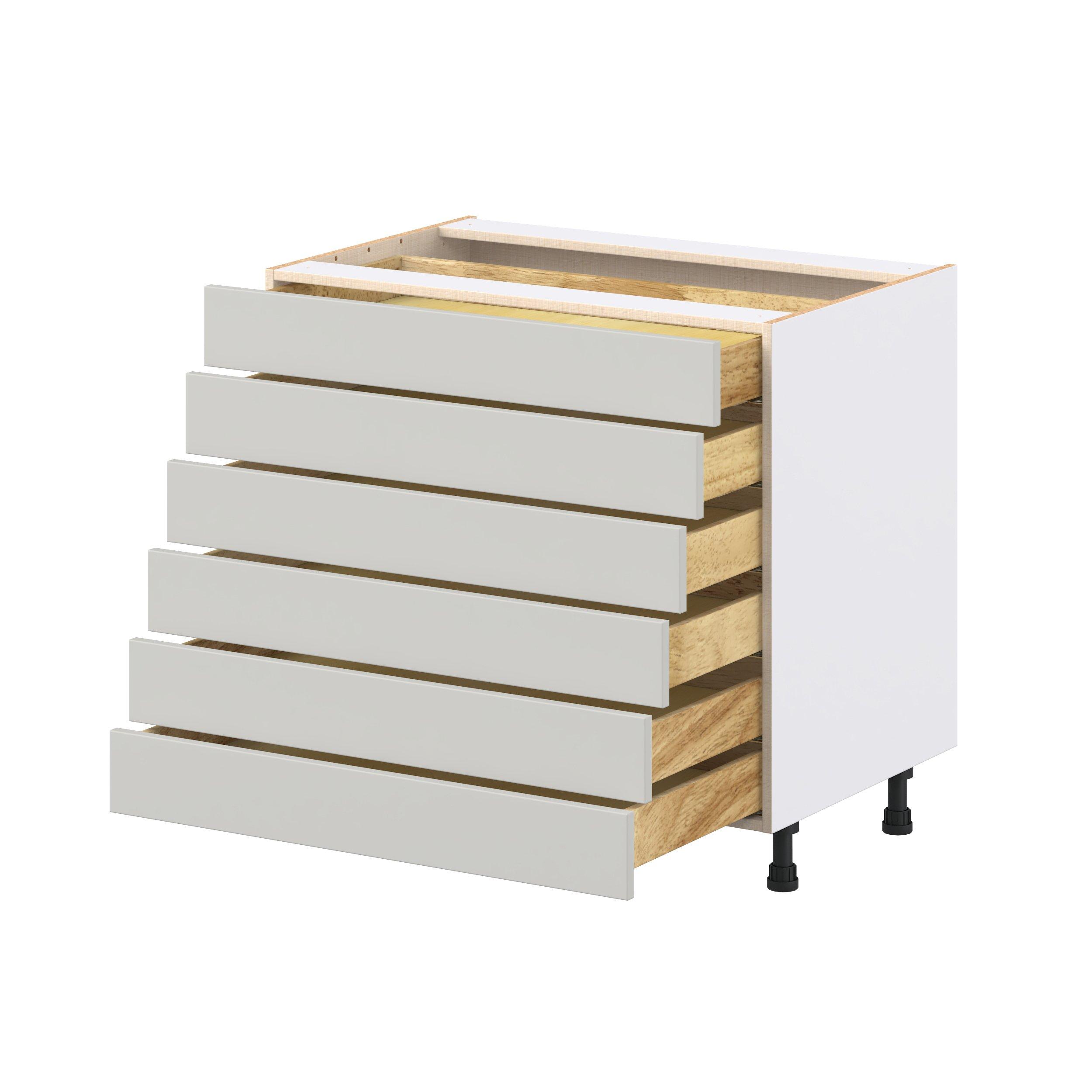 Enhance your home with the timeless beauty of Summerhill classic shaker cabinets, available in fresh bright white and neutral light gray colors. Crafted from one-piece MDF Studio Design Collection Summerhill 36 in. Light Gray Drawer Base Cabinet is designed to resist hairline cracks while the easy-to-clean finish stands up to stains and moisture. Featuring 5-piece doors and dovetail drawer joints, these cabinets offer durability and elegance. This collection combines style with everyday storage solutions.