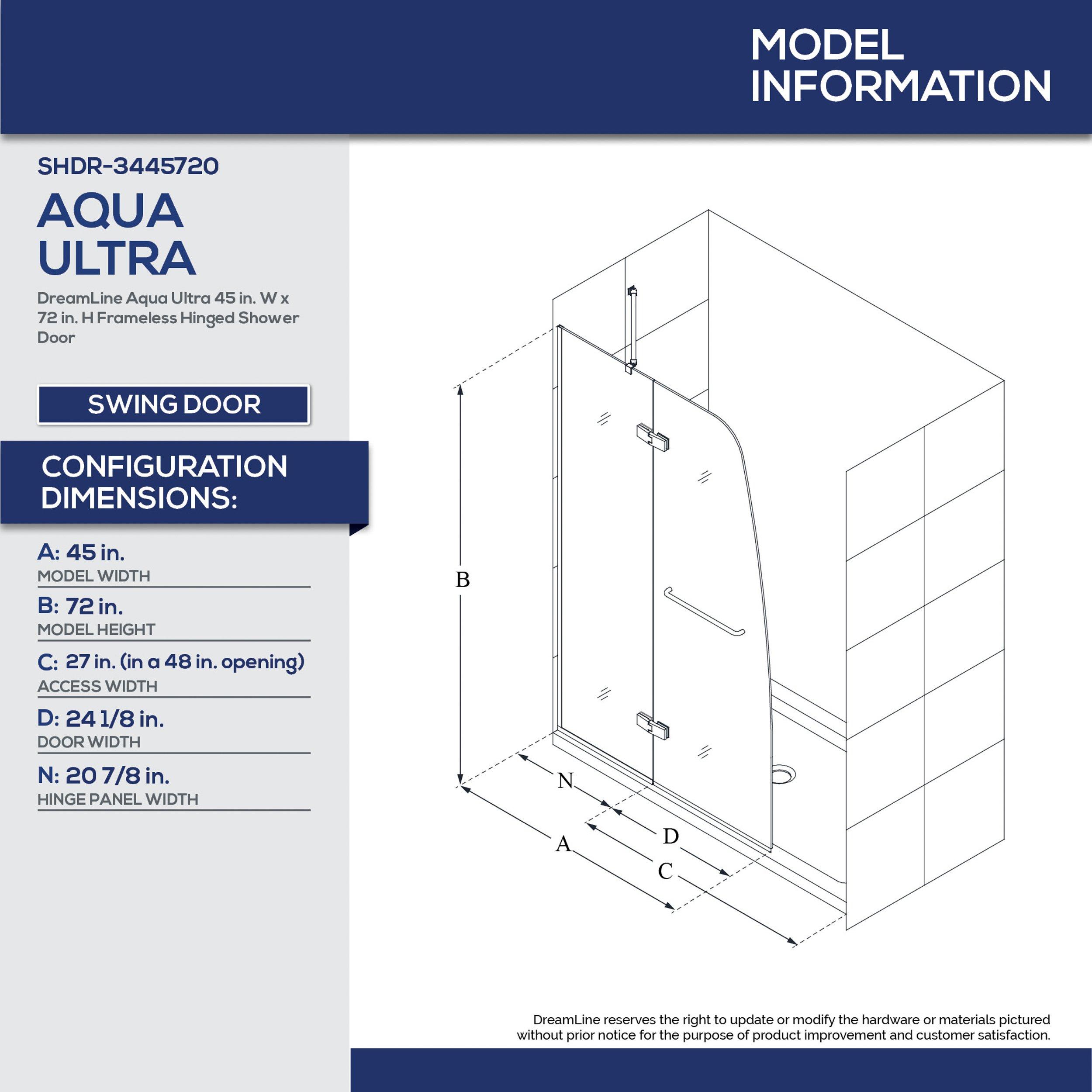 1 Year LimitedThe Aqua Ultra Chrome Hinged Shower Door makes your shower the focal point of the bathroom and provides the ultimate solution for your shower project. Glass is treated with DreamLine exclusive ClearMax water repellant and stain resistant coating for superior protection and easy maintenance.