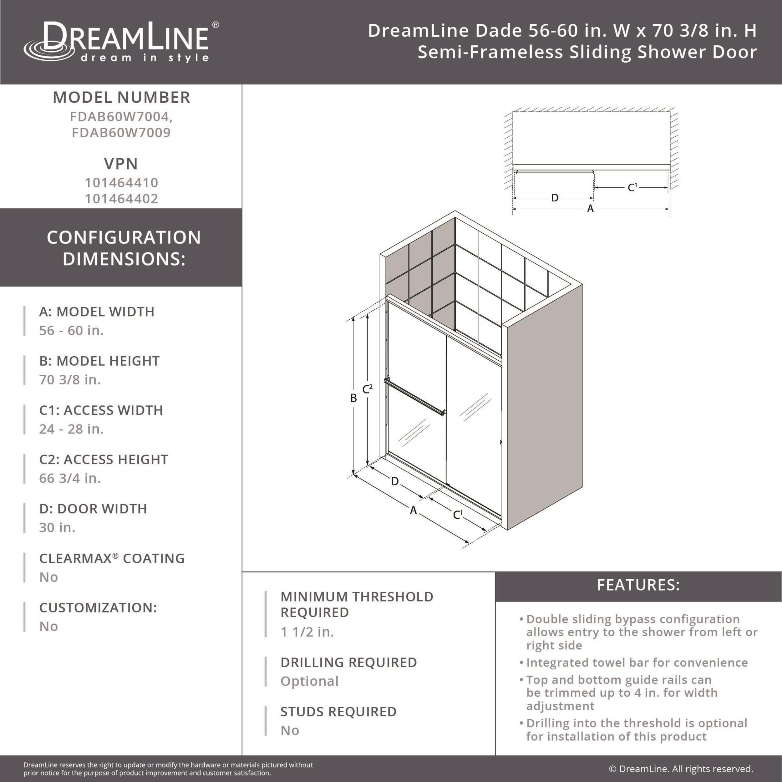 Lifetime LimitedThe Dade Collection by DreamLine is a budget-friendly semi-frameless sliding bypass shower door featuring a super sleek headrail for a modern design that will complement a variety of bathroom styles. The Dade Matte Black Bypass Sliding Shower Door offers unparalleled value with 3/16 in. certified clear tempered glass, smooth gliding rollers, and an integrated towel bar for convenience.