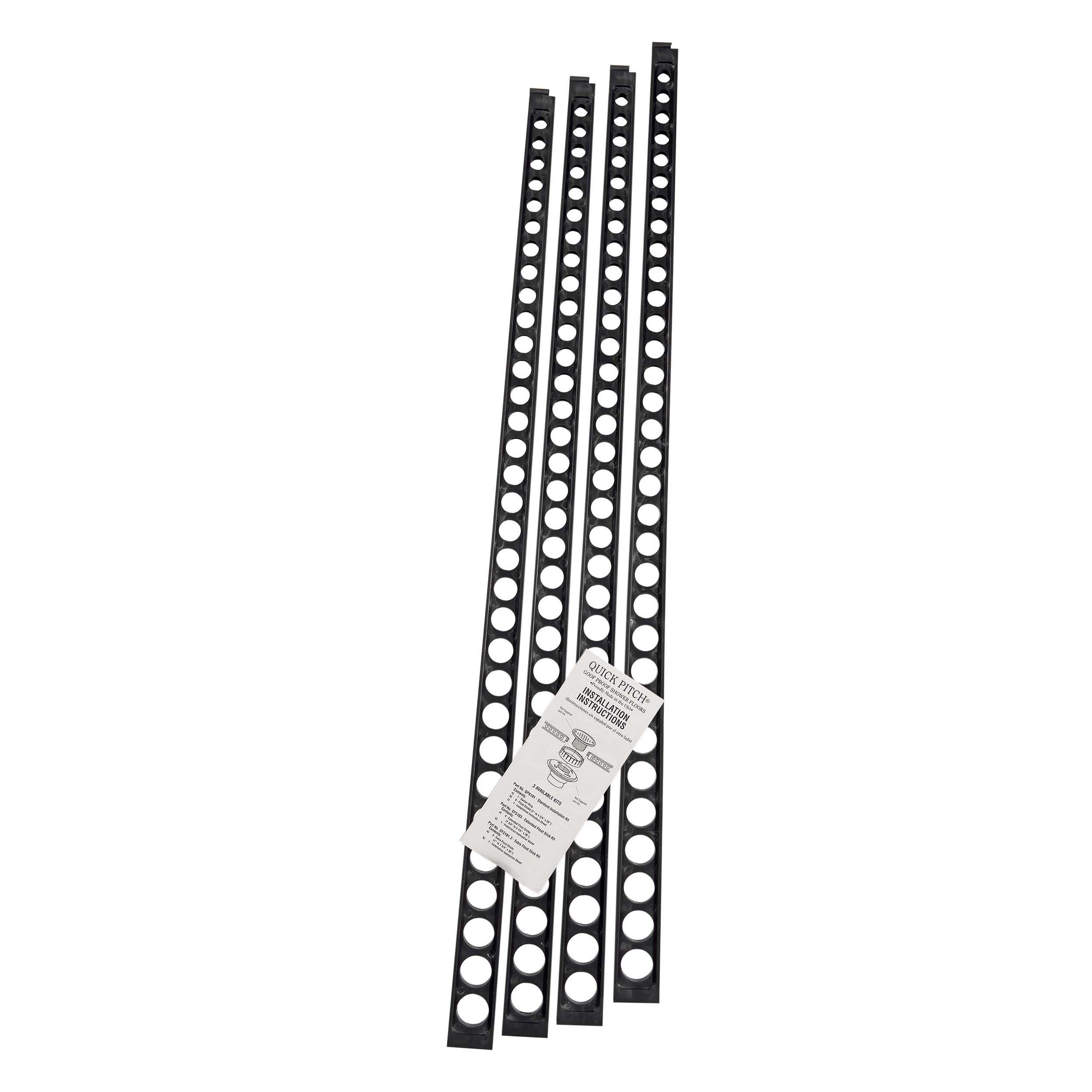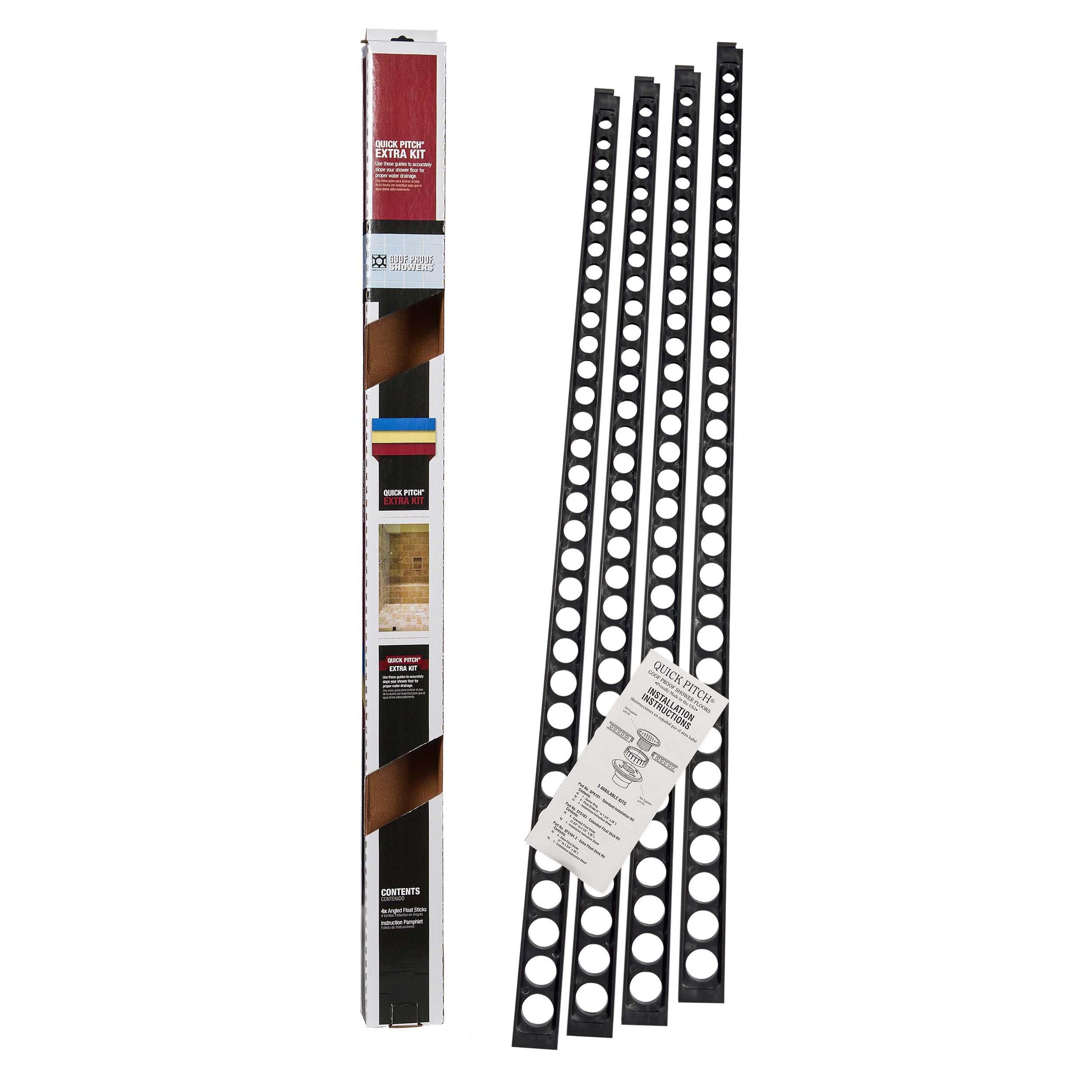 10 Year LimitedQuick-Pitch Extra Float Stick Kit is an add-on to the Standard QPK-101 Kit providing additional sticks for odd shaped showers or whenever more sticks are needed or desired. Extended sticks are available to continue the slope out to 72. Quick-Pitch sticks can be used with all waterproofing methods. Each stick measures 1 in. to 1 3/4 in. tapered x 36 in. length. Sold 4 sticks per package. Instructions included.