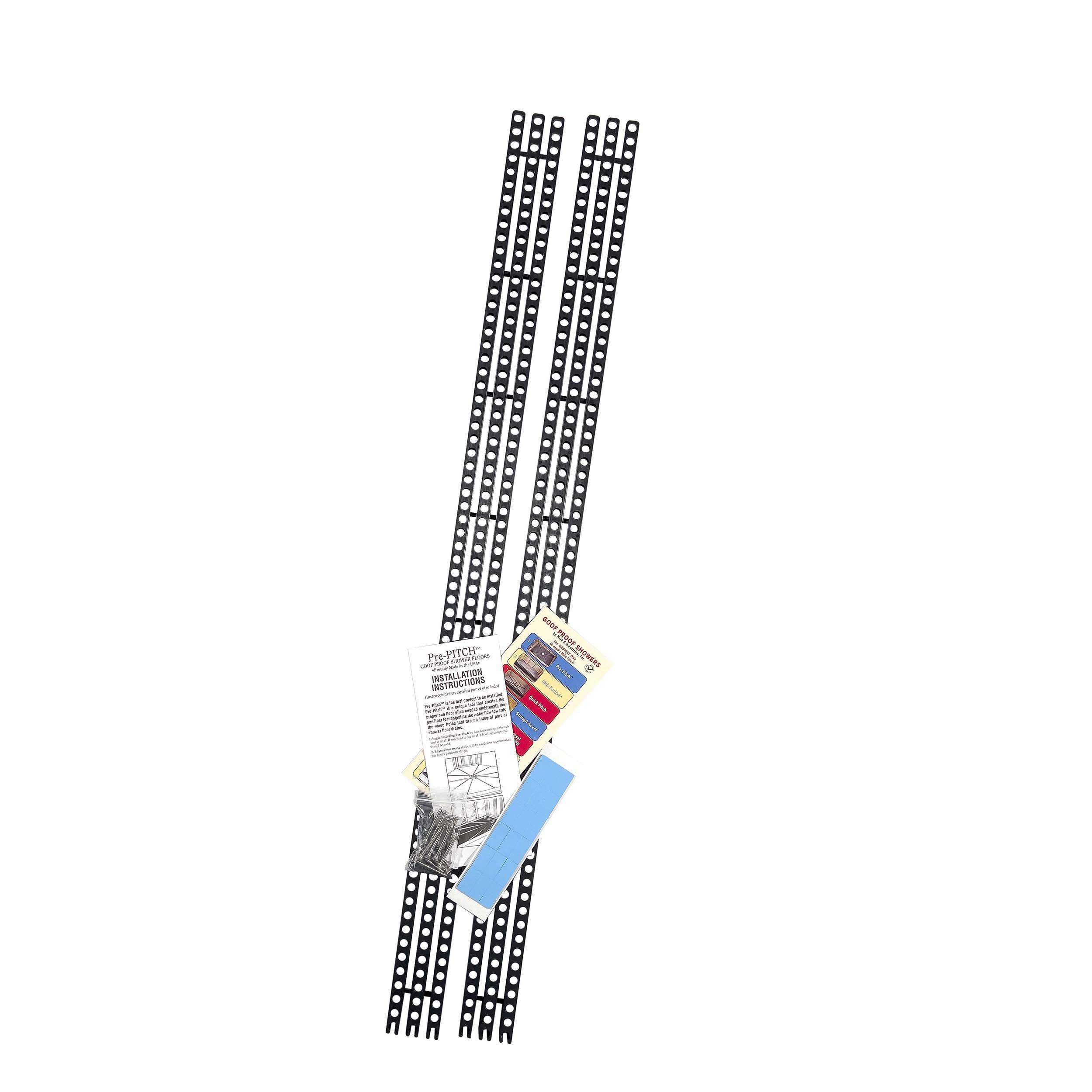 10 Year LimitedPre-Pitch is a sloping guide tool that forms a code compliant, subfloor pitched mudbed typically used underneath vinyl pan liner material to encourage water flow to the weep holes that are an integral part of all 3-piece shower floor drains. This ensures a properly functioning shower base. Pre-Pitch can also be used with roll-on liquid waterproofing and for thin-bed type foundations when using sheet membranes for controlling water. Can be used for both wood and concrete subfloors. Each stick measures 1/8 in. to 7/8 in. tapered x 36 in. length. Sold 6 sticks per package. Screws, 2-sided tape and complete instructions included.