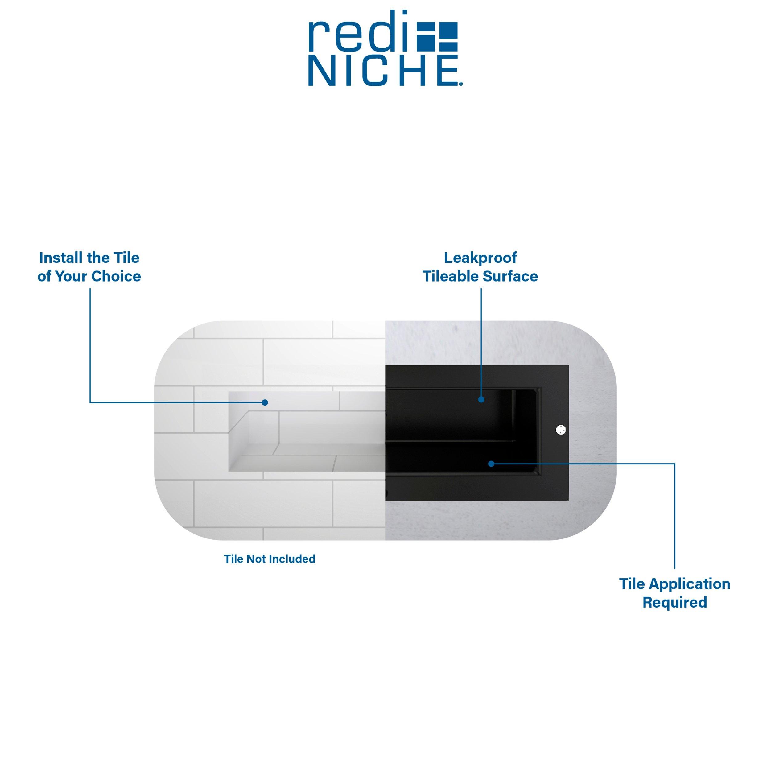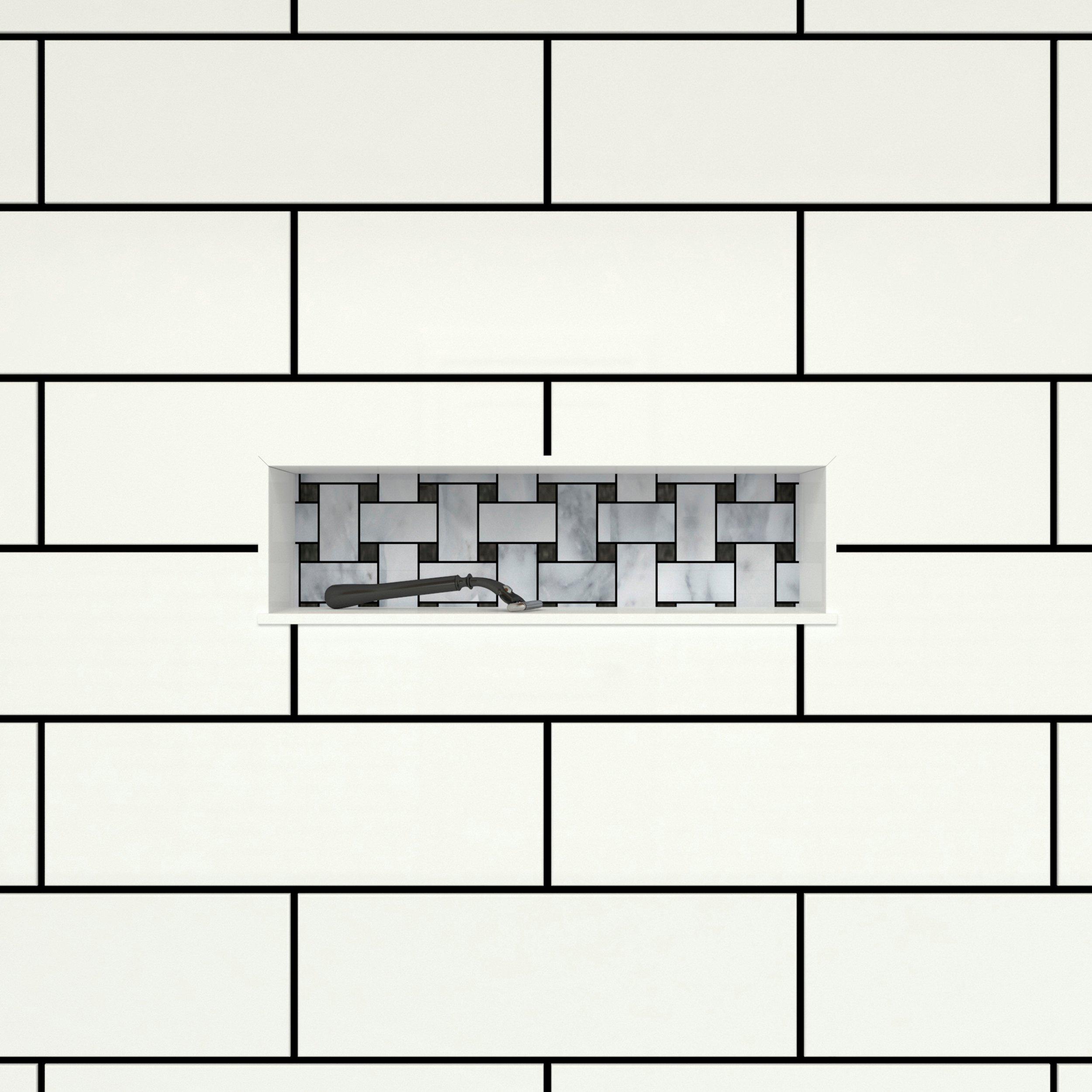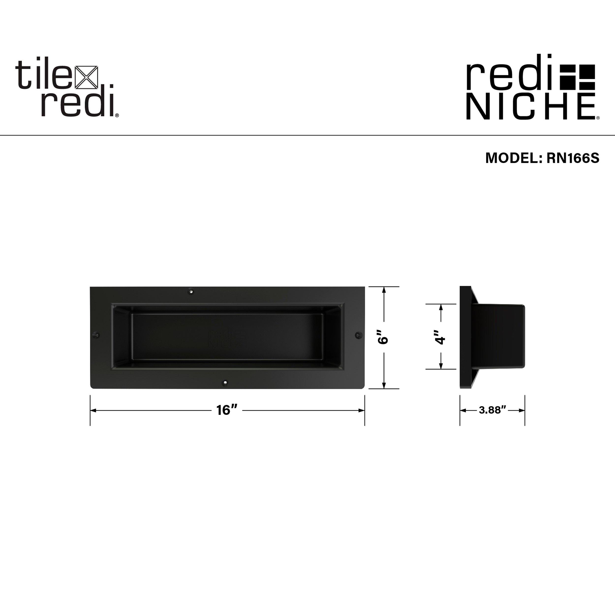 Lifetime Limited•One-piece shower niche with recessed shelf•Perfect for storing soaps, shampoos, razors, and other shower supplies•Install horizontally between the studs•Ready to tile: Install tile directly on niche surface •Customize shelf with the tile of your choice to fit the look and feel of your shower (tile not included)•Durable and long-lasting: Made of high-quality plastic to withstand heavy-duty use•Waterproof and leak-proof shelving•Dimensions: 16-inch width x 6-inch height x 4-inch depth•Easy to install•One inner shelf; check specification sheet for dimensions