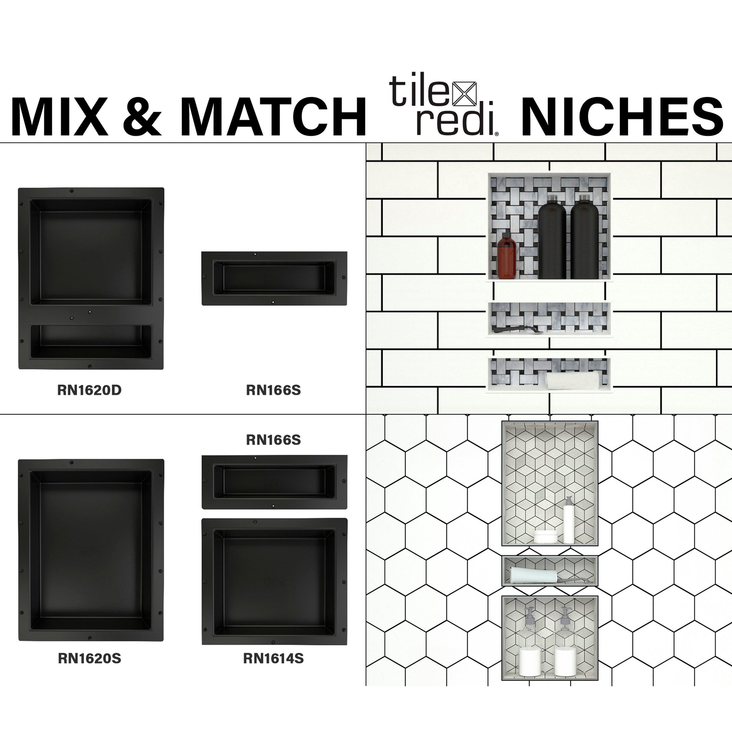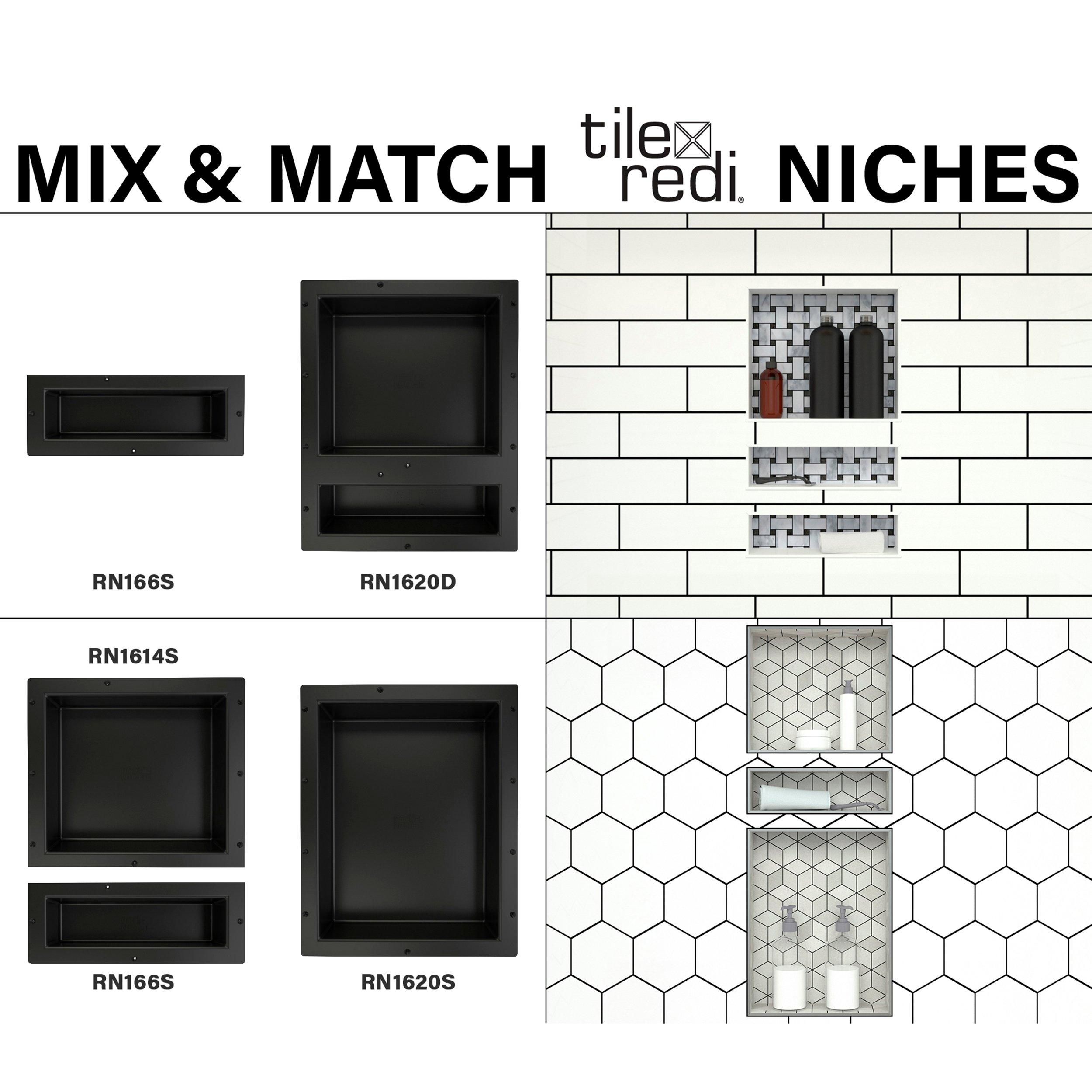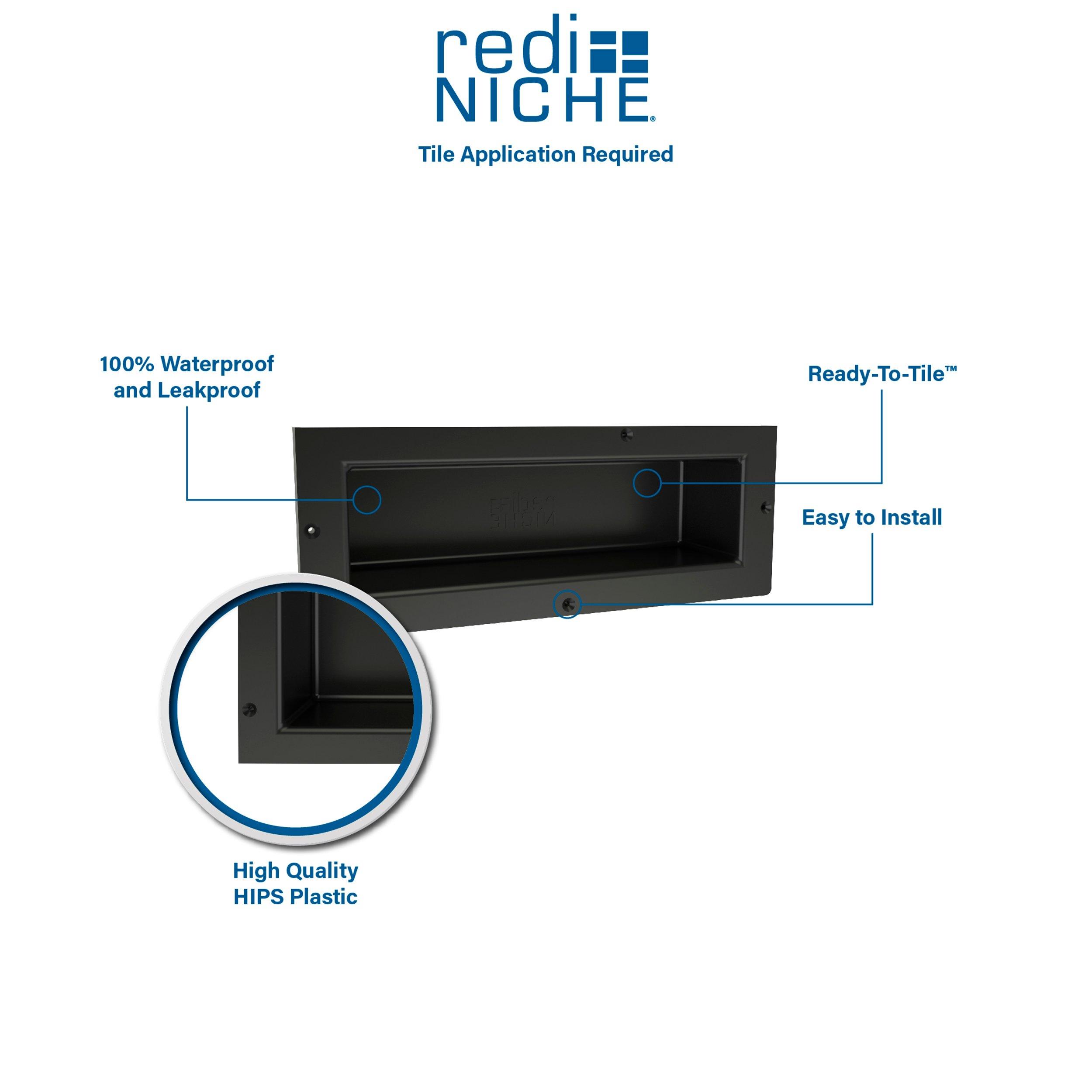 Lifetime Limited•One-piece shower niche with recessed shelf•Perfect for storing soaps, shampoos, razors, and other shower supplies•Install horizontally between the studs•Ready to tile: Install tile directly on niche surface •Customize shelf with the tile of your choice to fit the look and feel of your shower (tile not included)•Durable and long-lasting: Made of high-quality plastic to withstand heavy-duty use•Waterproof and leak-proof shelving•Dimensions: 16-inch width x 6-inch height x 4-inch depth•Easy to install•One inner shelf; check specification sheet for dimensions