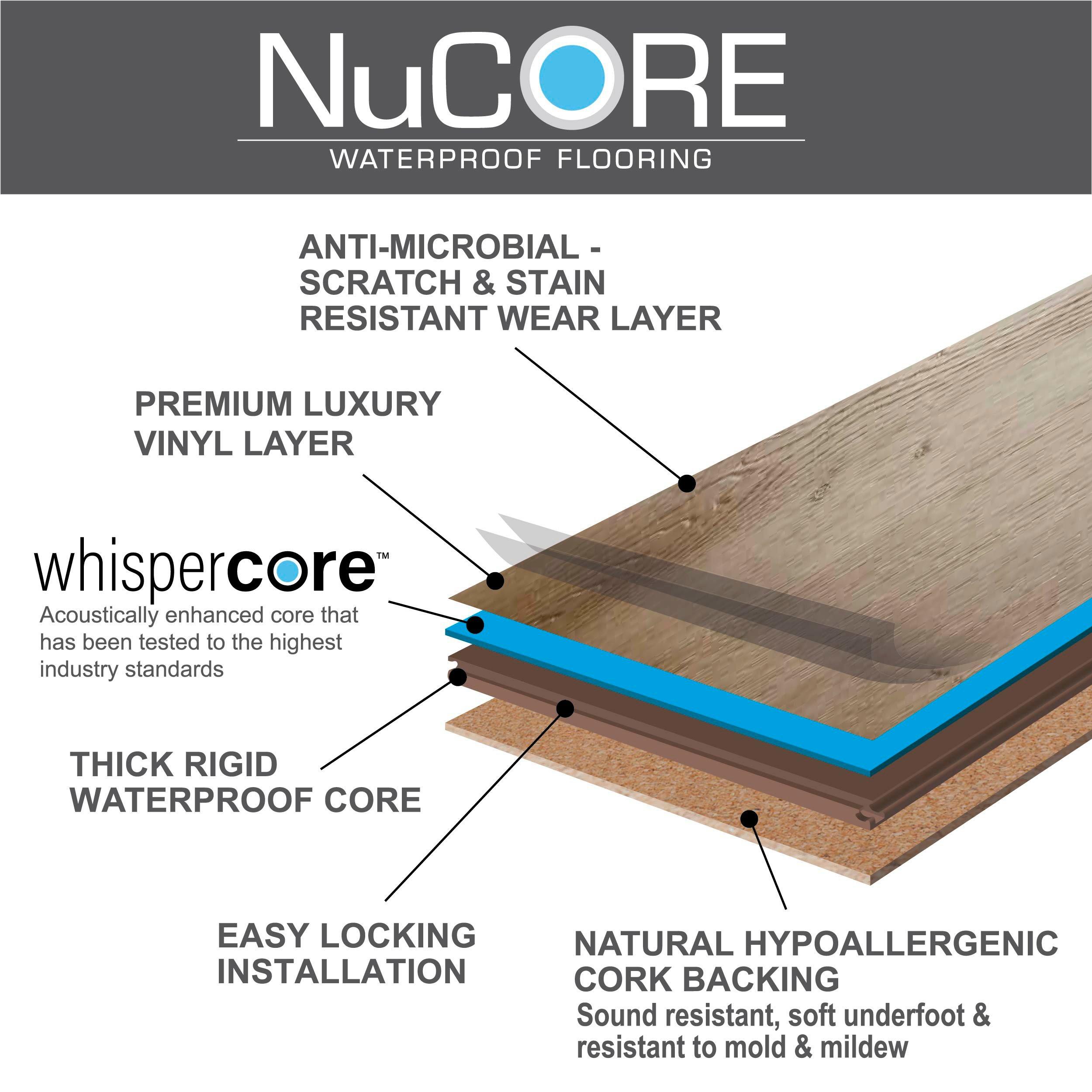7.5mm x 9in x 60in NuCore Whispercore Salazar Isle Waterproof Rigid Core Luxury Vinyl Plank - Cork Pad looks and feels like wood and tile, but can be installed where real wood cannot. With quick and easy installation, it's the perfect flooring option for any room! Even better, the anti-microbial coating on each plank makes it resistant to staining or odors caused by mold or mildew. With a lifetime res./ 20 yr comm. warranty, it's sure to be a long-lasting flooring option for any space.