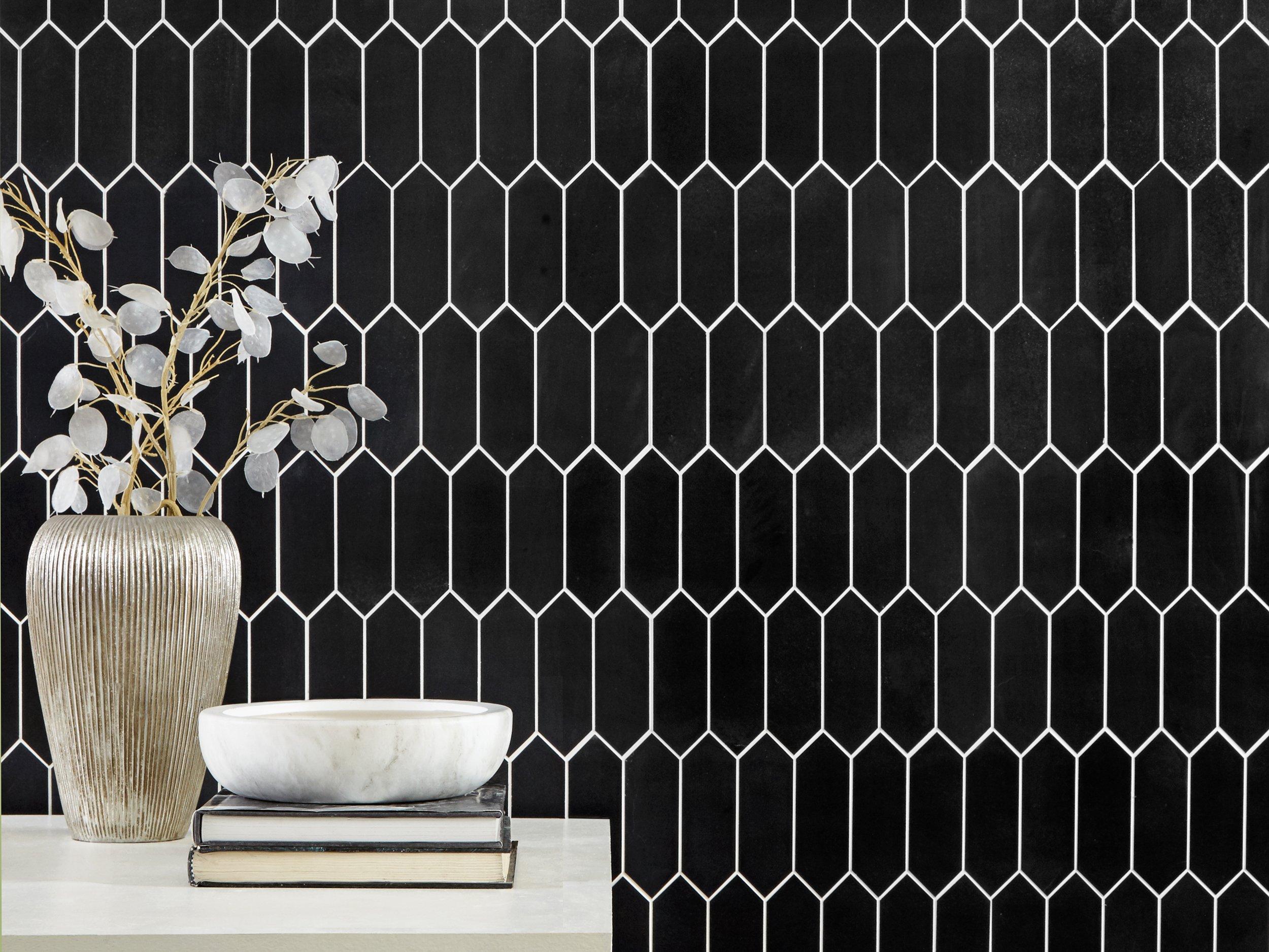 Accent the look of your home with this 12 x 12 picket Jet Black Basalt Picket Limestone Mosaic. The black color gives a nice touch to any room.