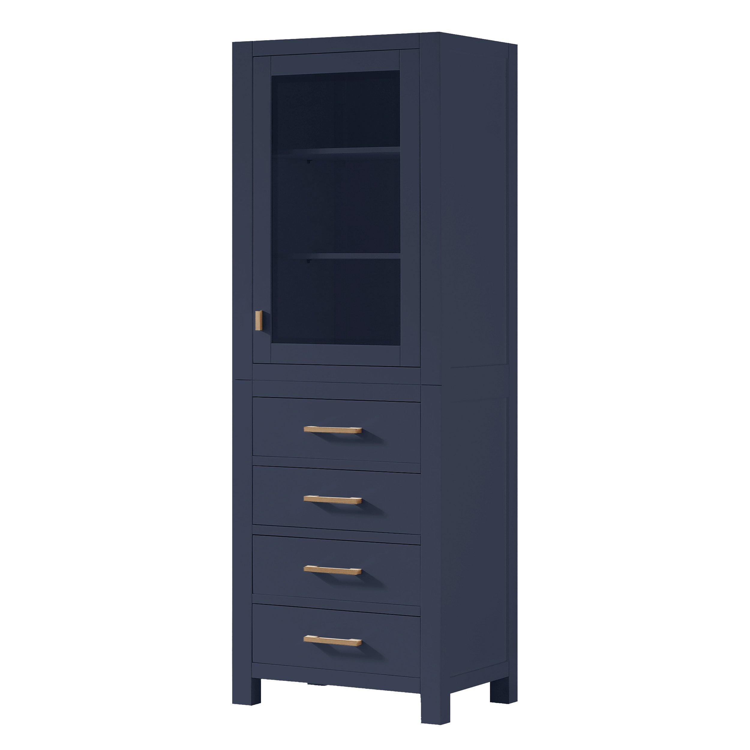 Tailor the look of your bathroom with the Kent 24 in. Navy Blue Linen Tower featuring gorgeous multiple in blue with 1 doors, 4 drawers, and 2 shelves. This piece is completed with beautiful matte gold hardware and a n/a n/a n/a sink. The Kent 24 in. Navy Blue Linen Tower is a stunning addition to any bathroom setting.