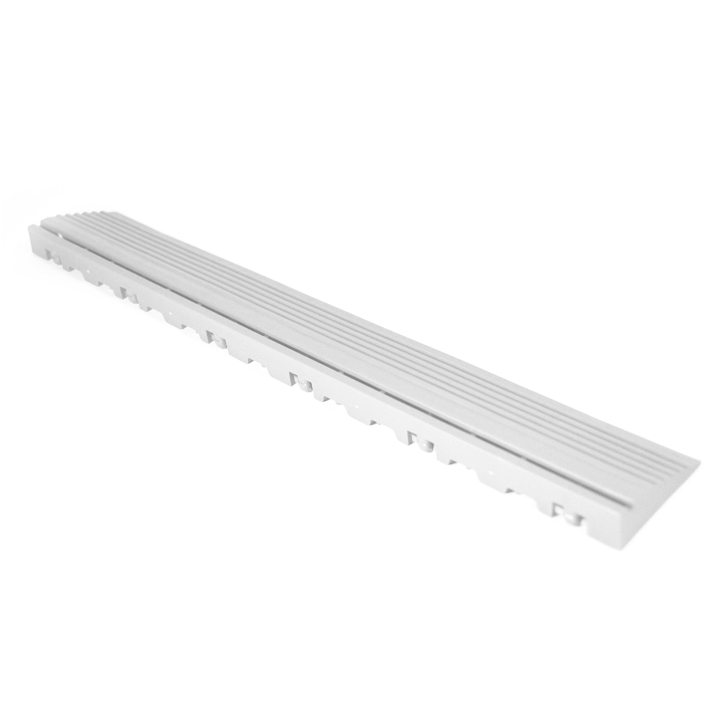 Swisstrax peg edges provide an effortless transition from tile to subsurface. They are the perfect solution for garage door openings, work mats, vehicle pads and more. The peg (male) edges feature 6 peg connectors and is designed to fit into the loop (female) connectors of the tile. If your tiles do not have loop connectors protruding from the side, you will need to use a peg edge.*Please note, most recommended garage floor installations will require loop edges for the garage door entry. Sold as 10 peg edges per pack.