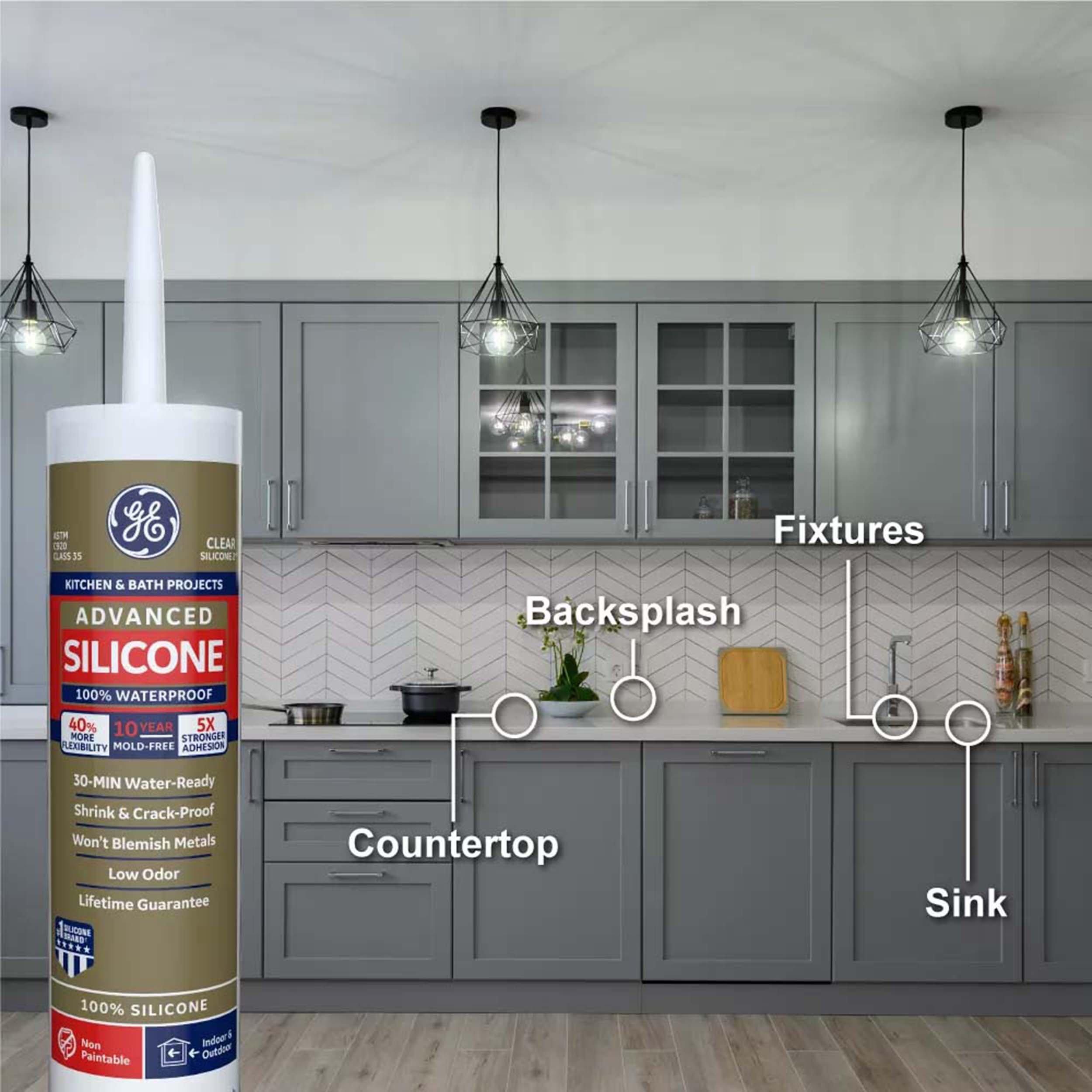Lifetime LimitedGE Advanced Silicone 2 Kitchen and Bath sealant is a high-performance, 100% silicone and 100% waterproof sealant ideal for areas prone to water exposure. GE Advanced Silicone 2 Kitchen and Bath sealant is permanently flexible with 40% more flexibility than Class 25 sealants and has 5X stronger adhesion than our Silicone 1 sealant. It will not discolor most high-end metal finishes such as chrome, bronze, and nickel. This sealant also has a low odor while curing thanks to its neutral-cure formula. Its 30-minute water-ready formula offers 10-year mold-free product protection to protect against mold and mildew growth. Use our silicone kitchen and bathroom sealant on a variety of common surfaces, including most metals, plastics, and woods; glass, drywall, plaster, granite, and more.