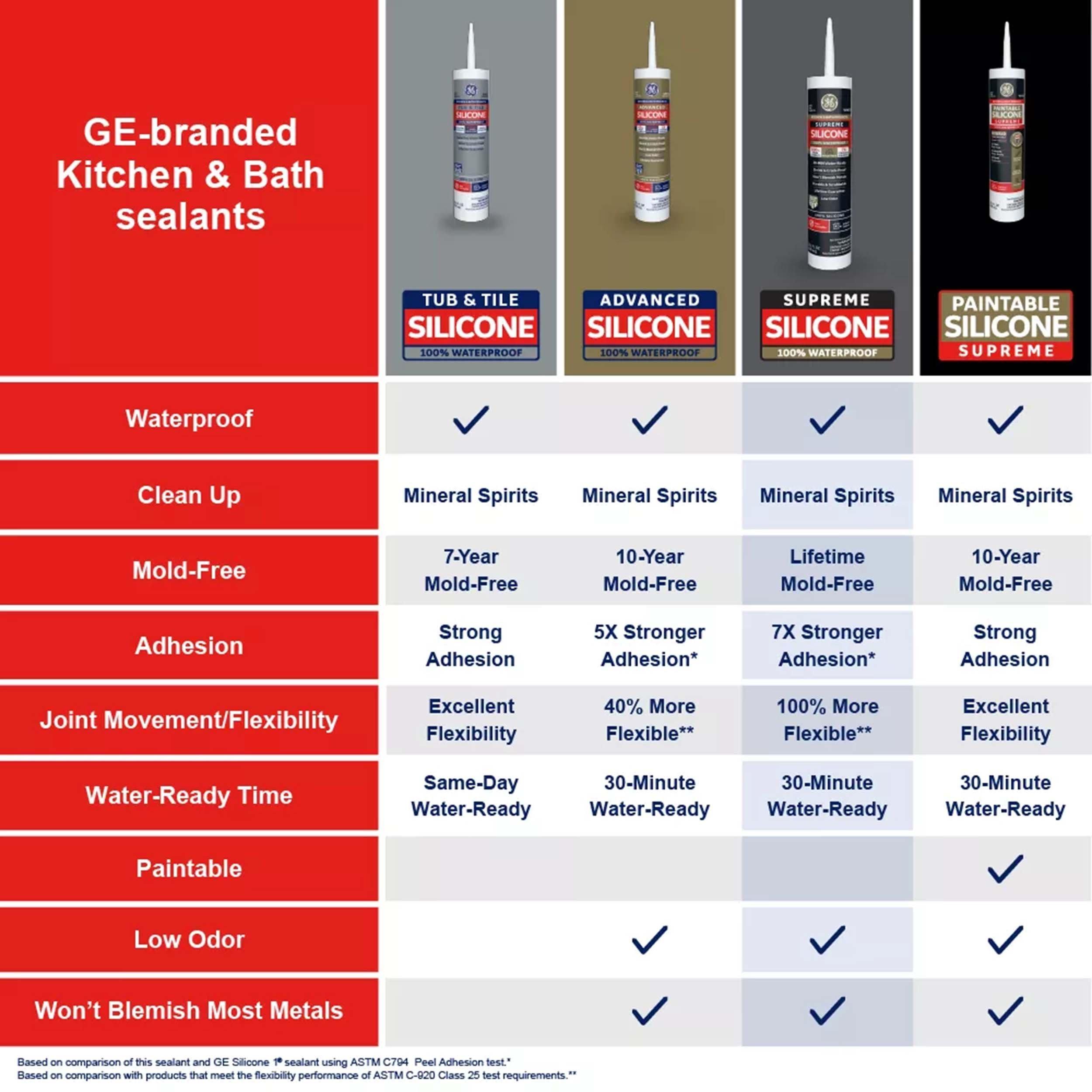 Lifetime LimitedGE supreme silicone kitchen and bath sealant is a premium, 100% silicone and 100% waterproof sealant ideal for areas that are constantly exposed to moisture-especially those in the kitchen and bathroom. Our sealant also has a 30-minute water ready formula and resists stain-causing mold and mildew growth. This silicone sealant offers 100% more flexibility than class 25 sealants and 7x stronger adhesion than our silicone 1 sealant. Plus, GE supreme silicone kitchen and bath sealant offers 50% joint-movement capabilities without cracking or shrinking. Our sealant has a low odor that's ideal for interior applications, and it won't discolor most high-end metal finishes such as chrome, bronze, and nickel.