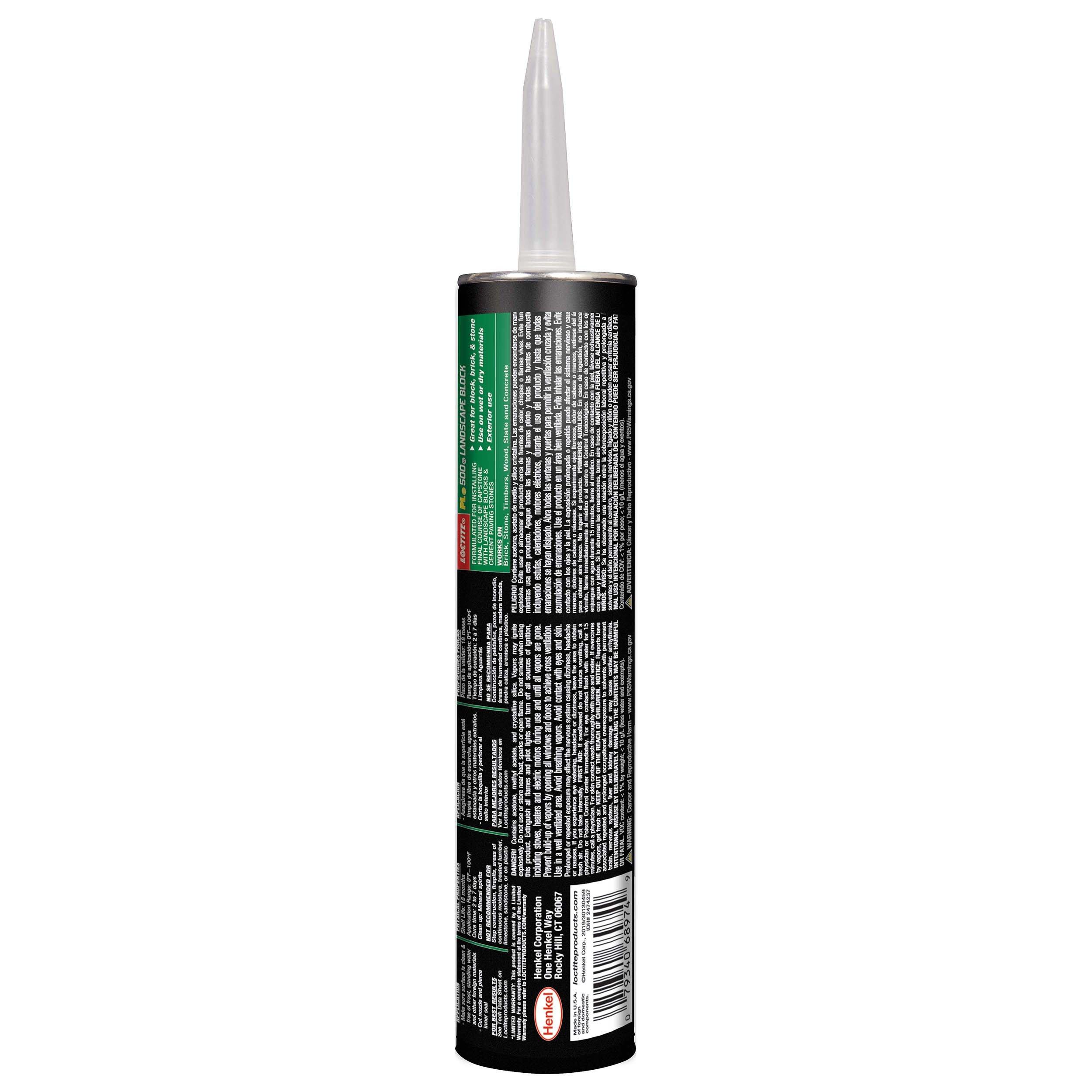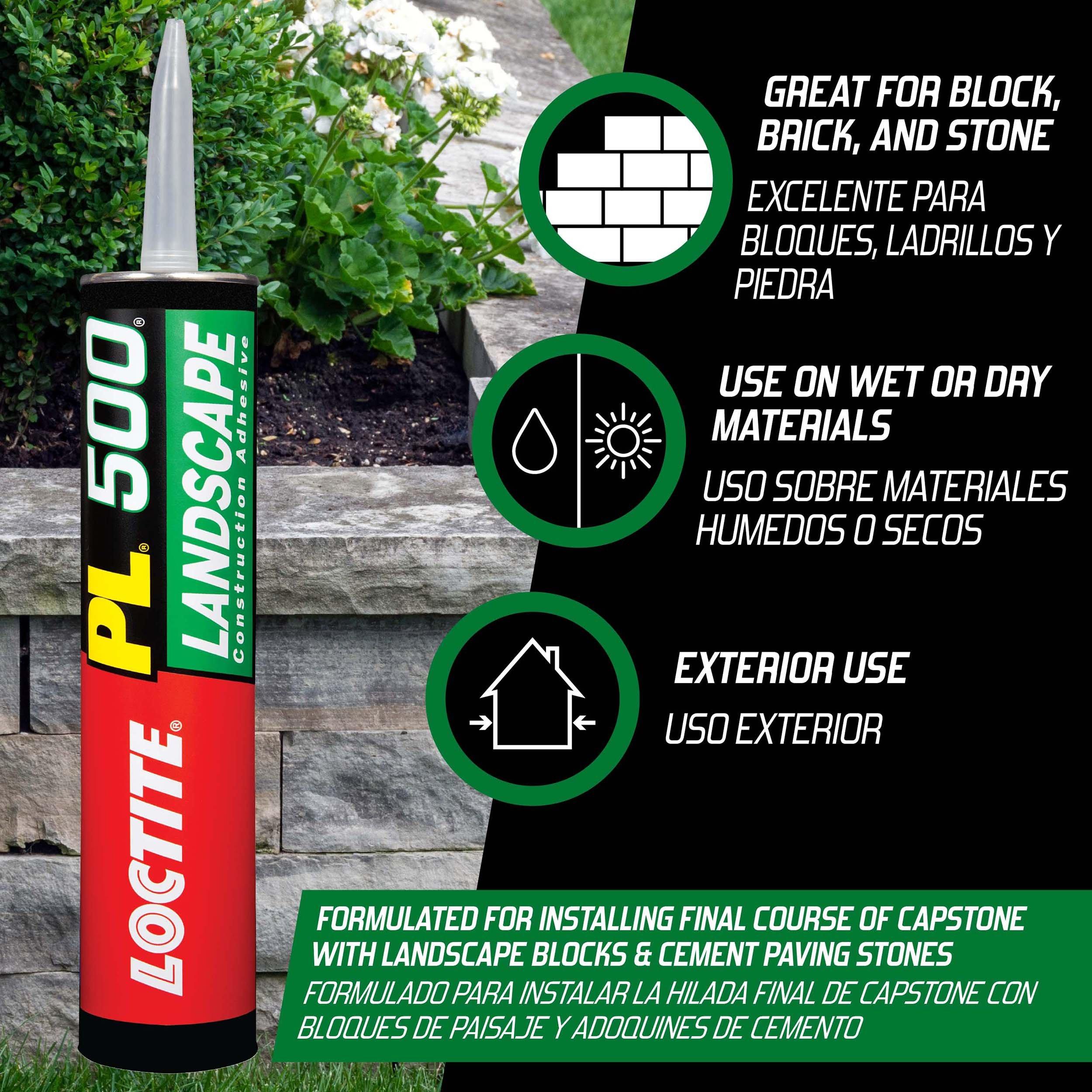 Floor/WallLoctite PL 500 Landscape Block Adhesive is an exterior, heavy-duty, premium quality adhesive designed to meet any landscaping need. Excellent for landscaping projects, such as securing block walls and capstones and for bonding brick, stone, timbers, concrete, metal and wood, Loctite PL 500 delivers a quick and easy solution to installing the final course of cap with landscape blocks and the installation of cement paving stones. This formula will bridge and fill minor gaps making it particularly effective when bonding irregular surfaces. With true all-weather application, PL 500 can be gunned directly onto wet and frozen lumber without rolling up as other construction adhesives do. Loctite PL 500 Landscape Block Adhesive formula may be used under a variety of moisture and temperature conditions ranging from 0F to 100F.