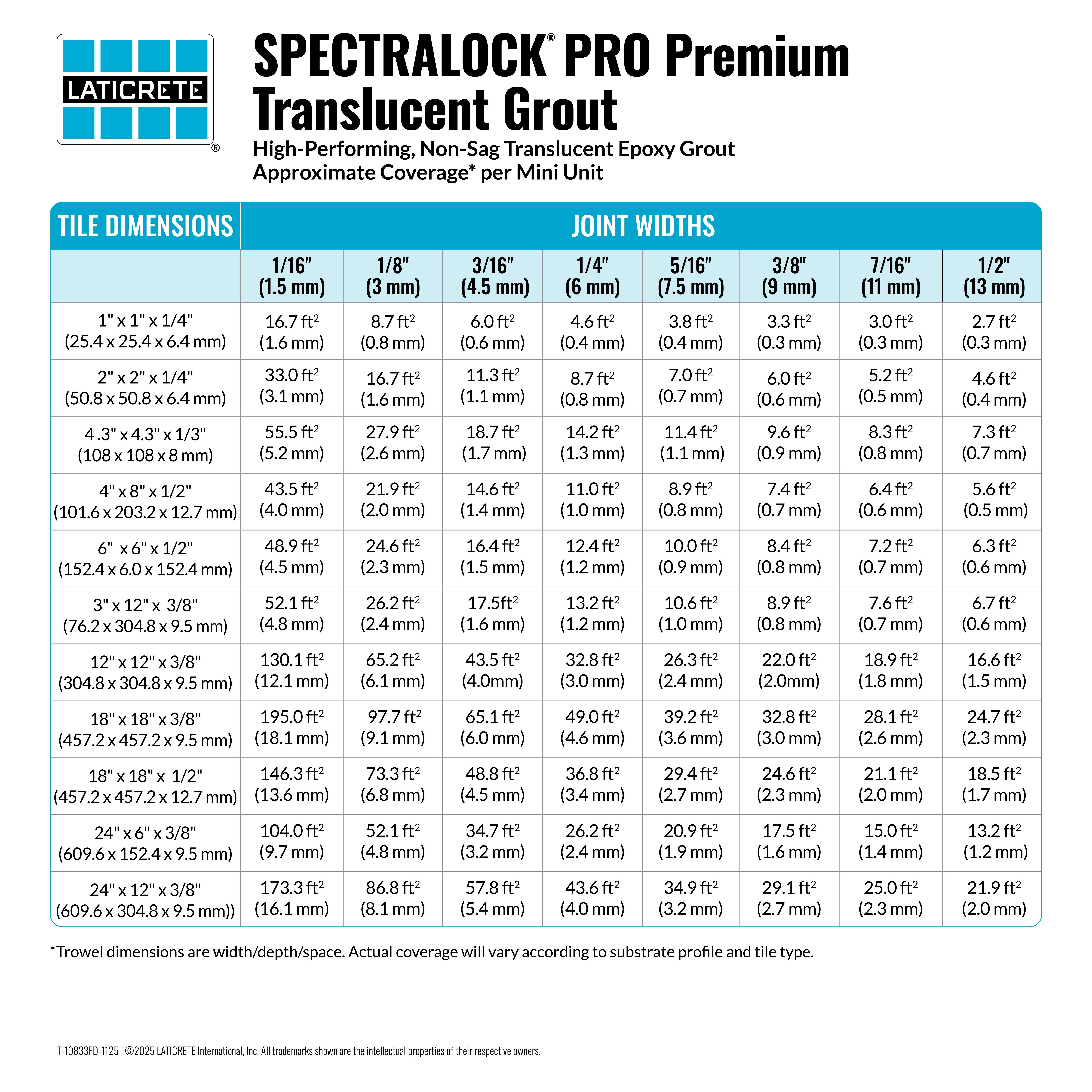 Laticrete Spectralock Pro Premium Translucent Grout delivers a grout solution that combines stain resistance, strength, and design versatility. With color consistency and optional decorative effects, it provides dependable performance for a wide range of tile installations.