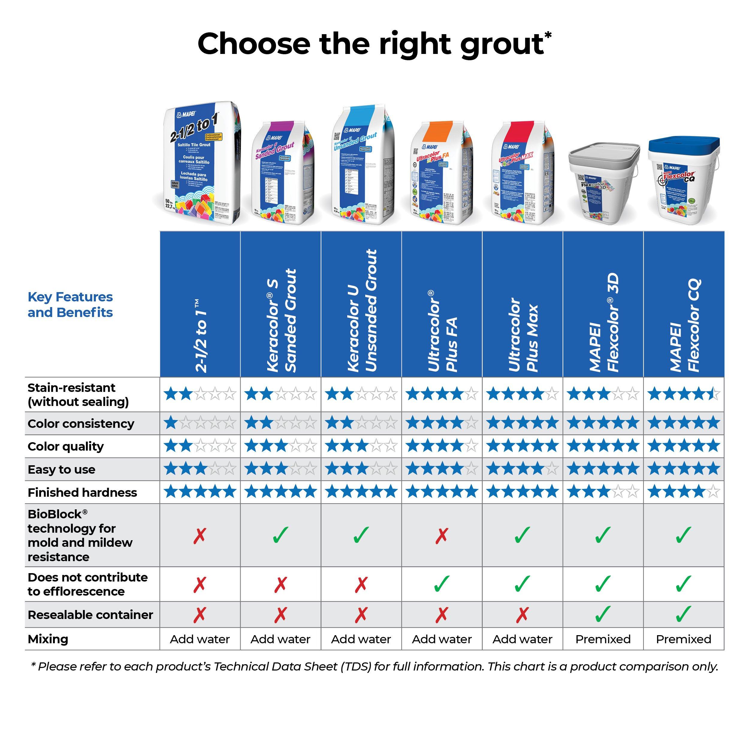 Ideal for grouting residential and commercial floor and wall surfaces in dry or wet conditions. Suitable for dimensional stone, slate, granite, stone agglomerates, ceramic, mosaic, quarry, brick paver, porcelain, glass, clay, and Saltillo tiles. Can be used in joint widths from 1/8" to 5/8" (3 to 16 mm) and is approved for submerged conditions such as swimming pools, spas, water features, and fountains once fully cured (after 21 days).