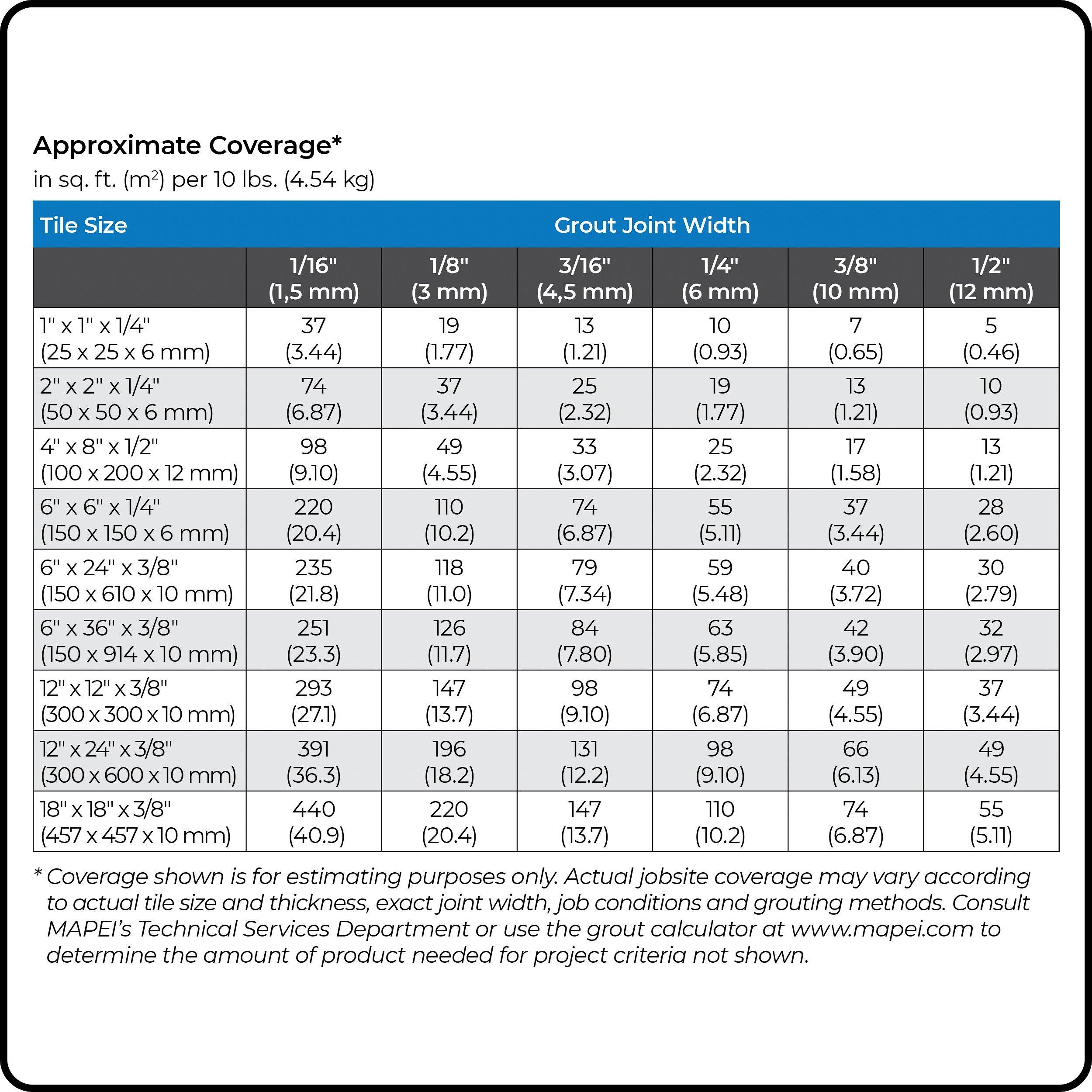 The estimated amount of coverage based on product size and manufacturer’s recommend (or commonly used) install application.